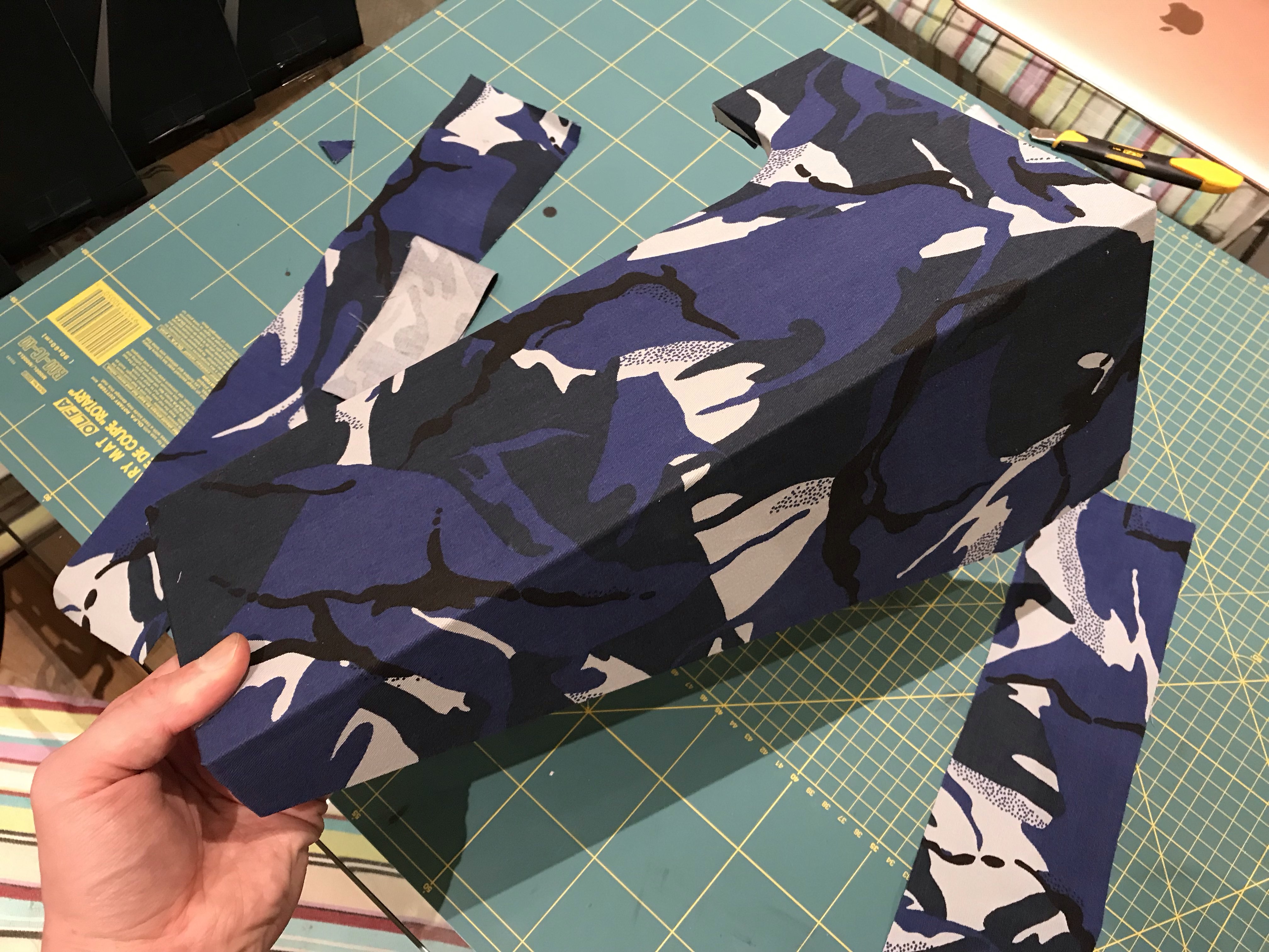 The final element of the interior theme-work was doing a spot of upholstery. For the woodland camo I had planned on using some brown hessian, but since navy was chosen I opted for some navy camouflage fabric instead. A number of areas were going to be covered with wooden panels, these made for perfect candidates to be coated with the material. To do this I first applied a layer of 3M Spray Adhesive, then carefully wrapped the fabric around the parts. I left a fair bit of excess material around the edges so that they could be wrapped around and stapled in place from the other side.