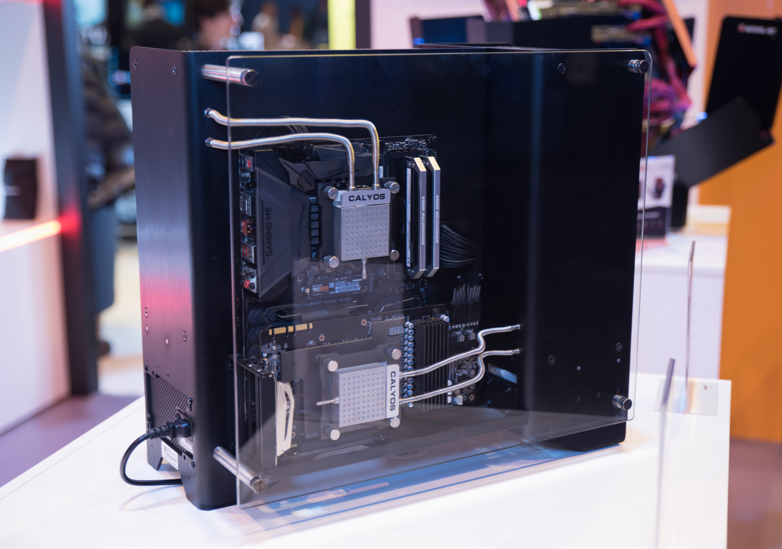 Further down the hall is where you would find the Materiel booth and its Silicon Throne, along with a very interesting piece on display: the Calyos NSG S0, successfully launched on Kickstarter earlier this year. The NSG S0 is a fully passive chassis design, built in collaboration with Watermod's (and bit-tech members) Mathieu 'Sassanou' Heredia and Laurent 'Seinron' Petipas. Also on show were some of their small production run systems, similarly spruced up with some Watermod treatment.
