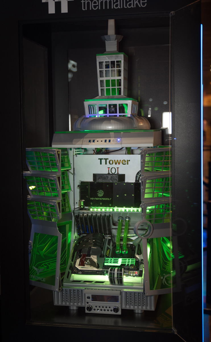 Adjacent to the LDLC booth was Thermaltake, rocking a plethora of LCS systems as well as a cabinet containing Mike's impressive Tower 101 mod. This mod was on prime display at Computex earlier in the year and like then certainly pulled in passers by for a closer look.