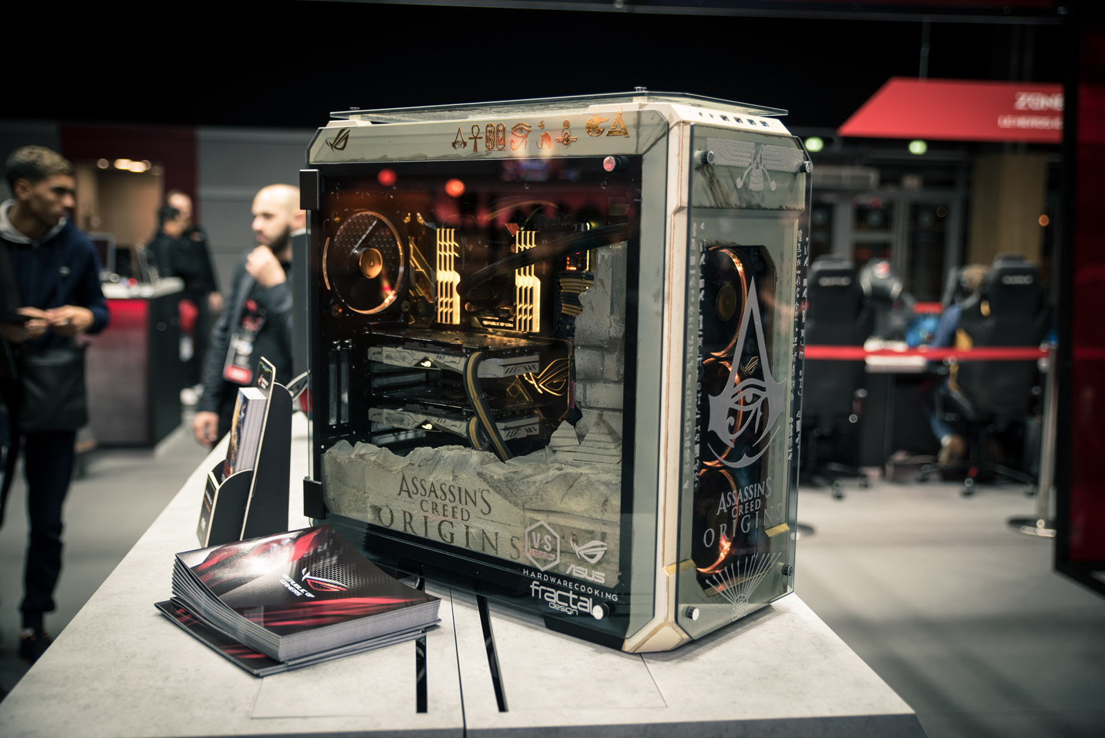The last main hardware presence was over at the Asus RoG stand, where it had a number of gaming laptops, high-end hardware components, and mods on display. Mathias Axiom's Assassin's Creed build was stood firmly in the centre, flanked by mods from Gregory Rousseau and Ghislain Boullay.