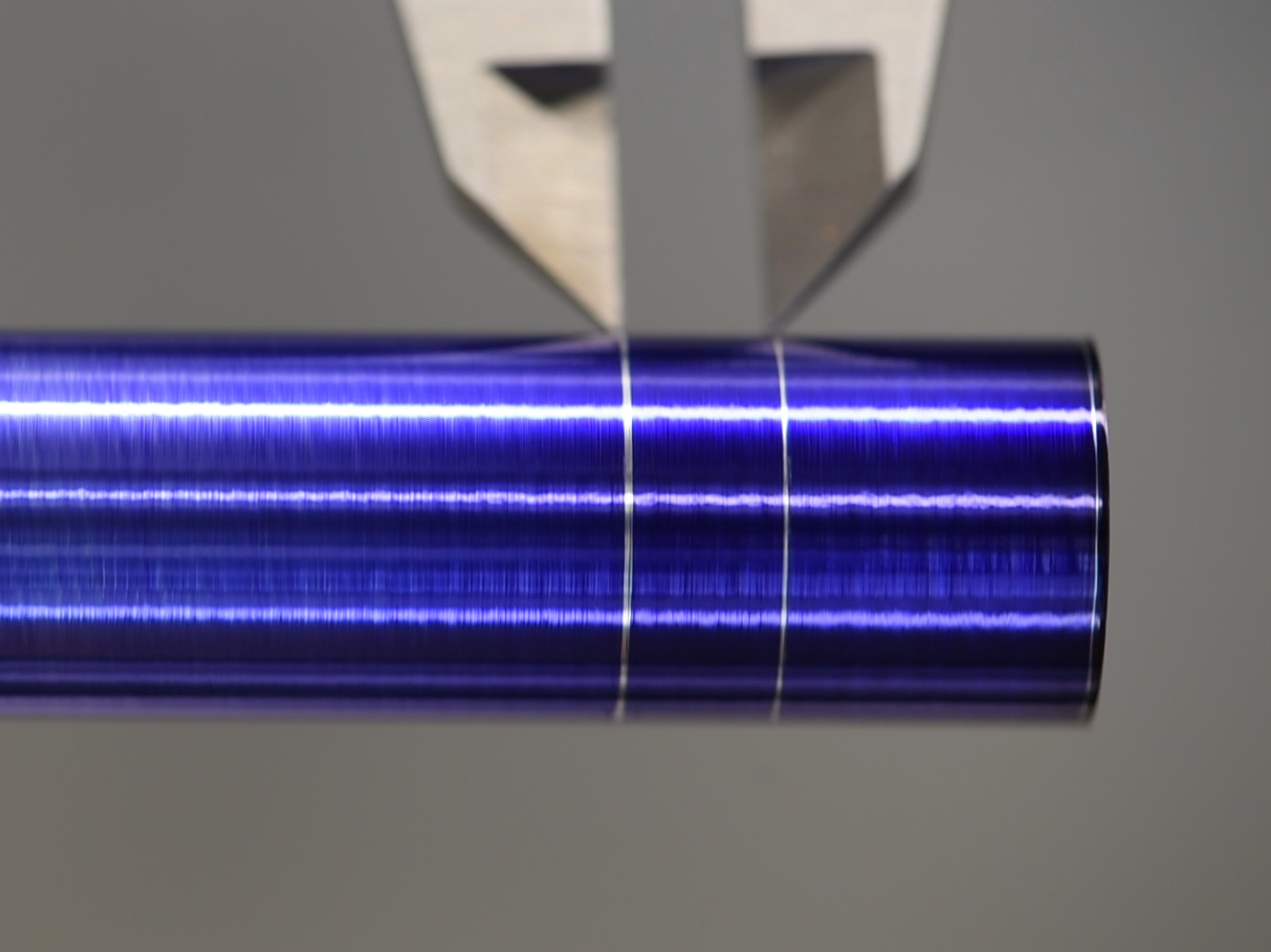 Next it was just a matter of applying some marking fluid and using the calipers to score the cutting boundaries. These are the lines I'll be turning down to; the marking fluid makes the contrast very high, so it's easy to see exactly what you're aiming for.