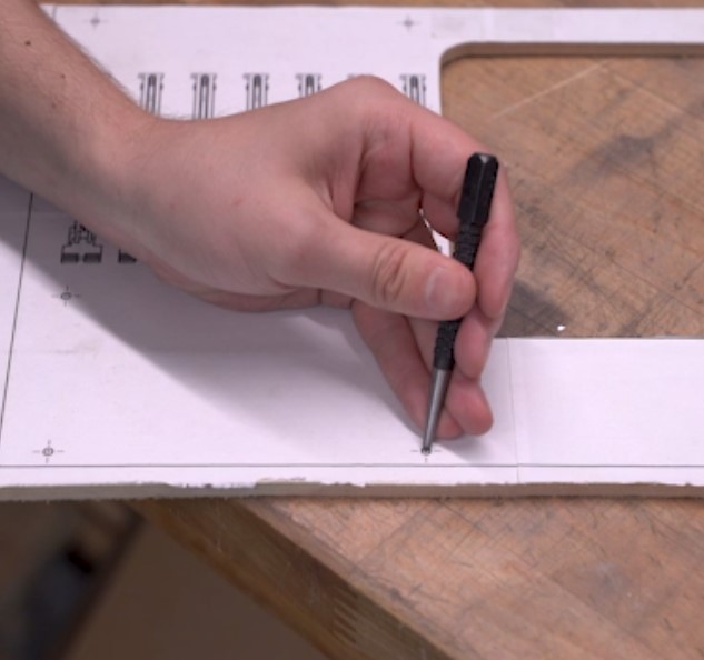 With the tray cut, here comes the important bit: drilling the holes. The templates are great for this as they're accurate and easy to work with. Using a centre punch I marked the hole locations and then drilled. You naturally have some leeway with these, but being as accurate as you can always helps. Since I have access to a load of M3 standoffs for later, I'm drilling 2.5mm holes and tapping for M3 screws.