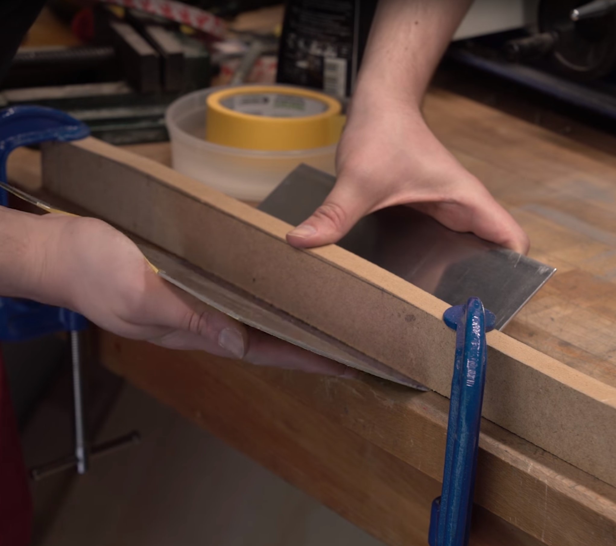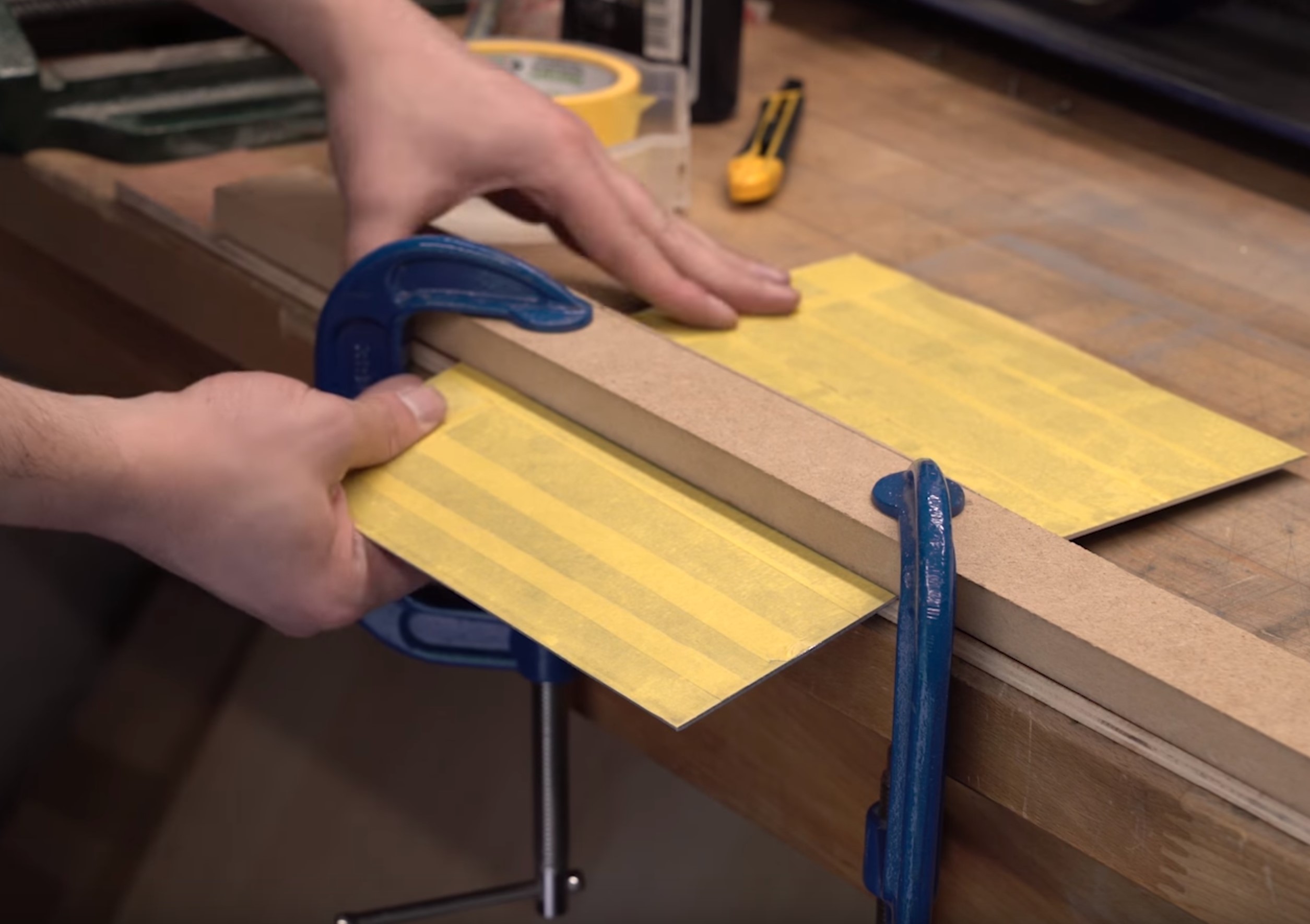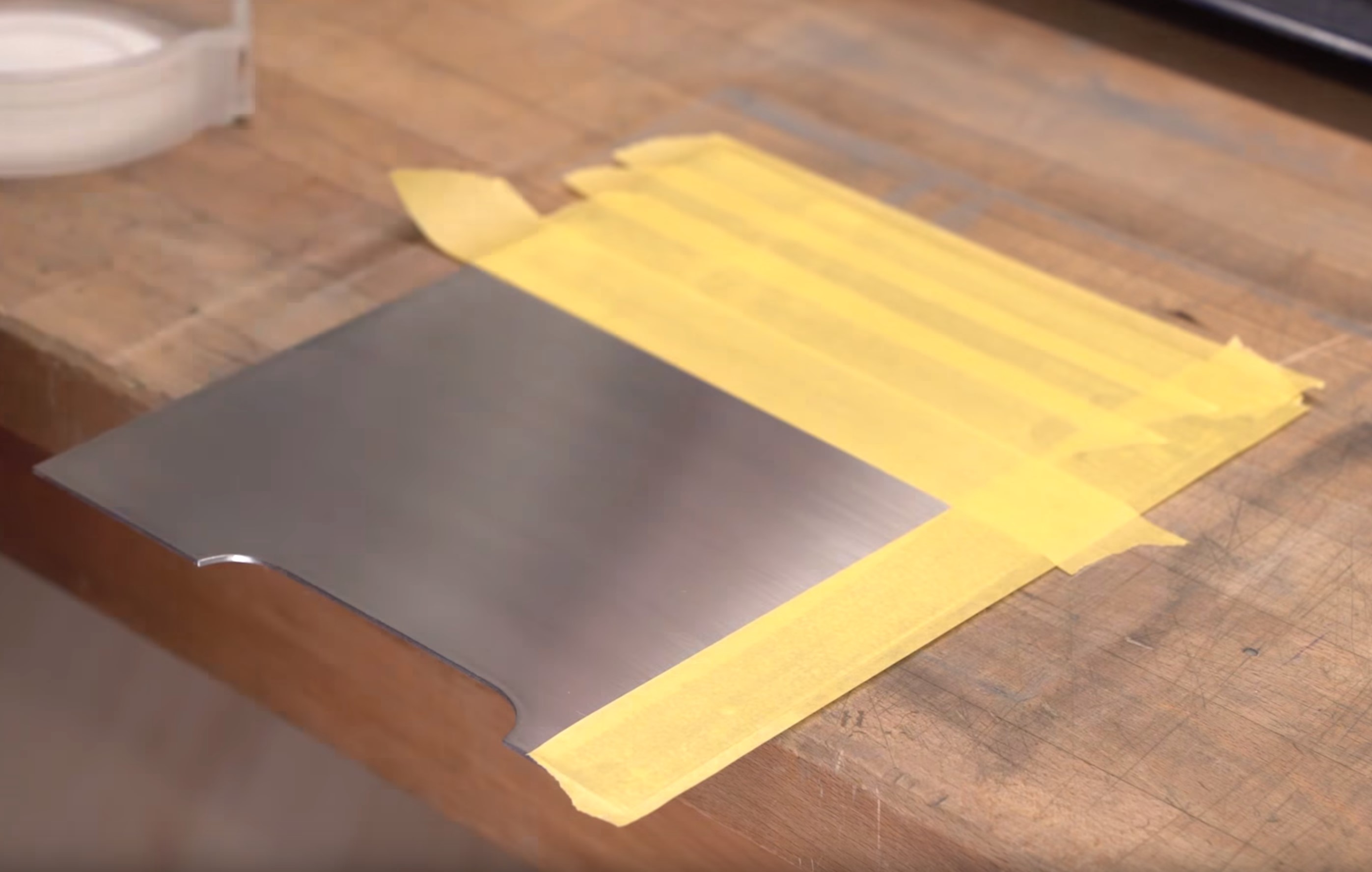 Okay, so it probably is indeed time I got a press brake for this sort of stuff, but for now this method will do. First, you want to mask up the side you just sanded since we're clamping to a table that would definitely mar the finish.