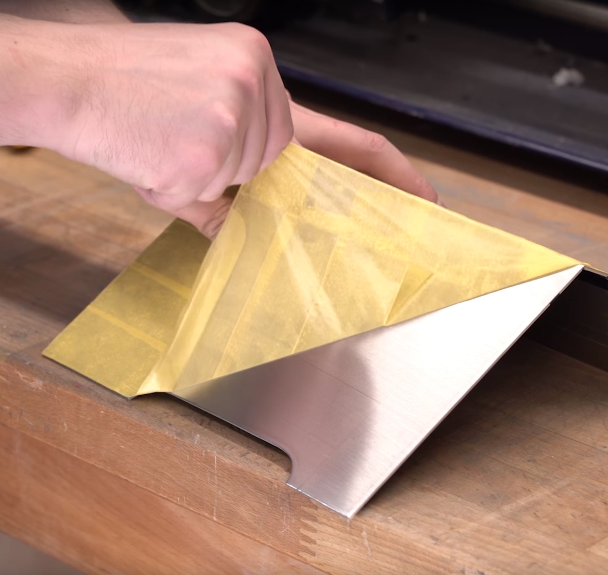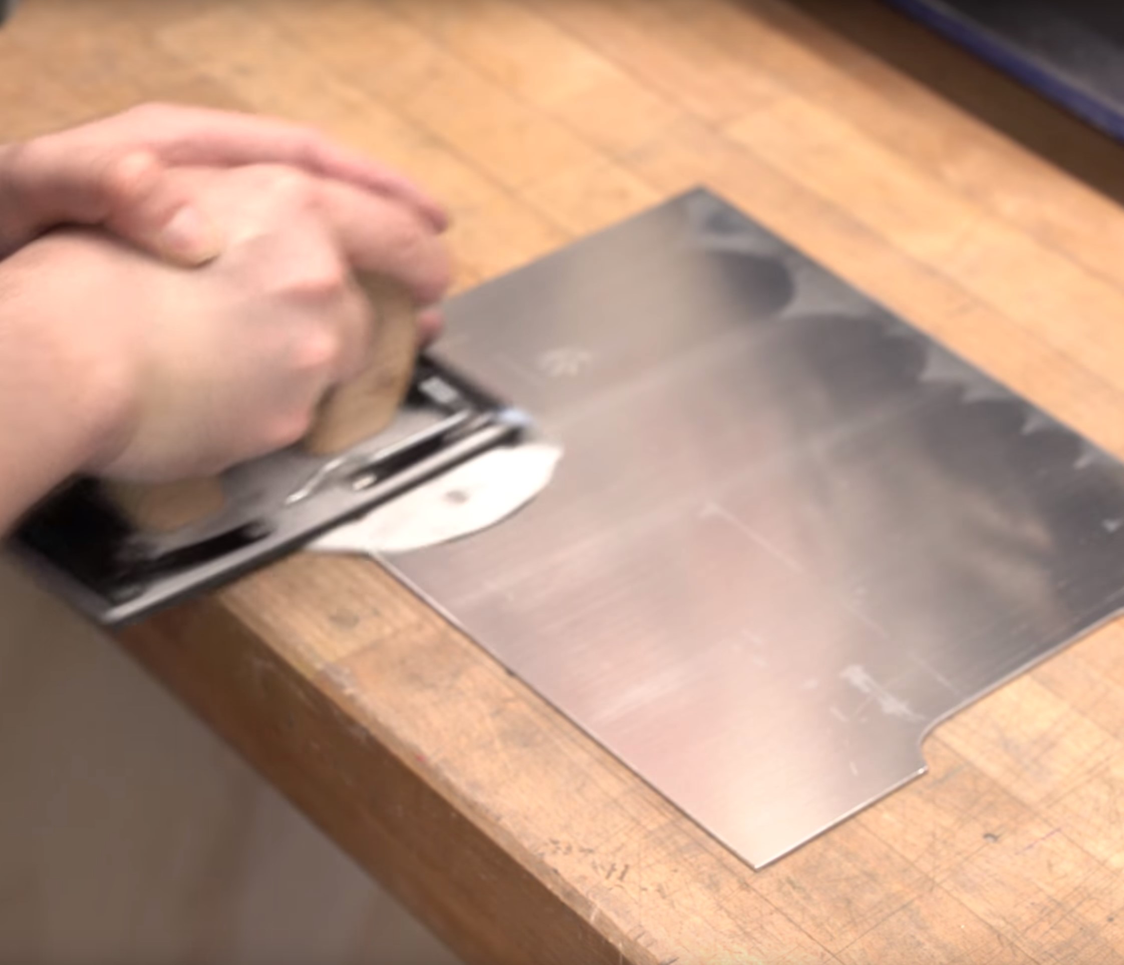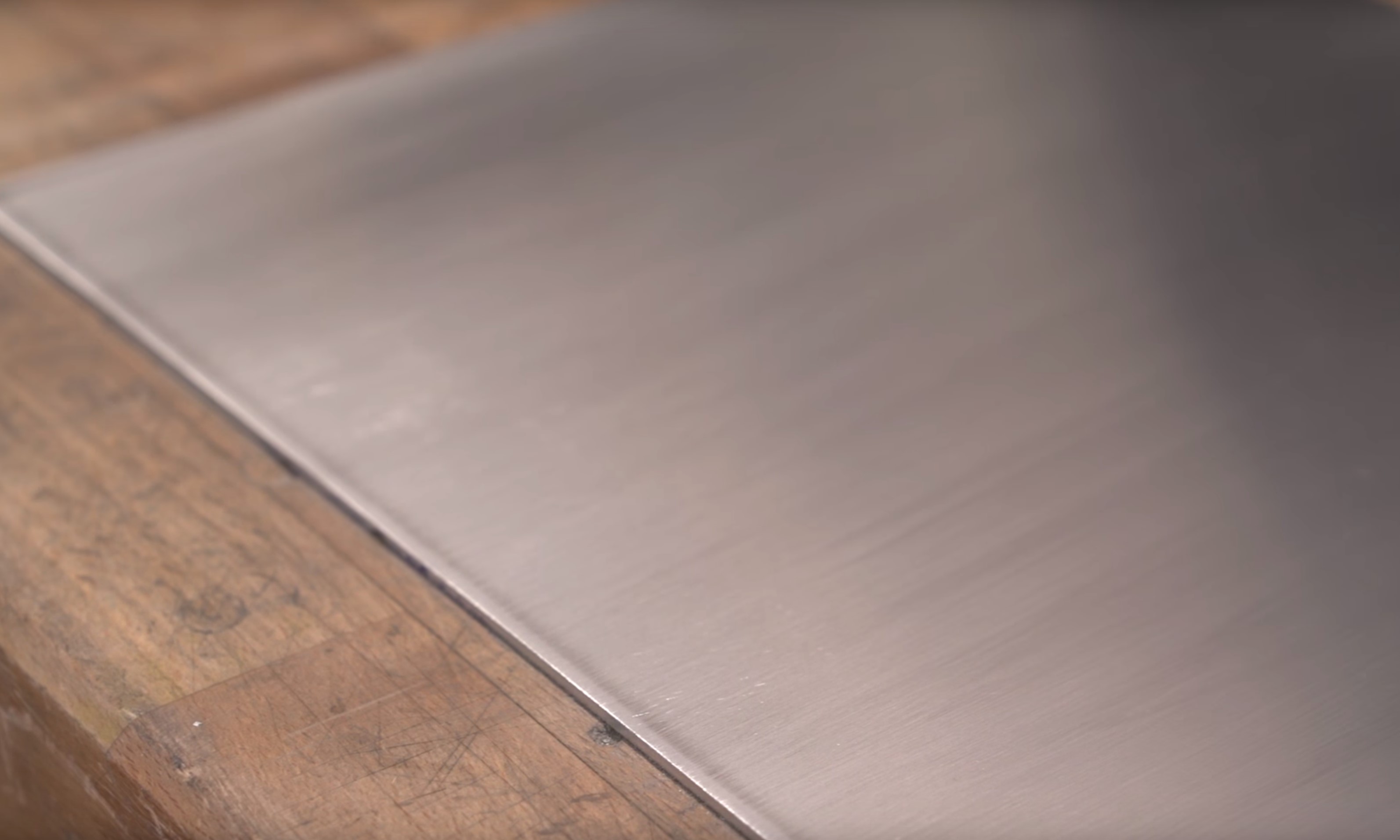 With the bend lines scored, it's time to do the finishing. It's way harder to sand a bent piece of metal, so you're better off doing it whilst it's all flat. I taped it to the workbench, then using a hand sander I sanded in one uniform direction, starting with 180-grit and finishing with 320. You can of course use higher grits if you're after a finer finish. To get the grain to pop a bit more, you can go at it with some Brasso or similar polish, then clean up with acetone, which will pull out all the dust from the surface.