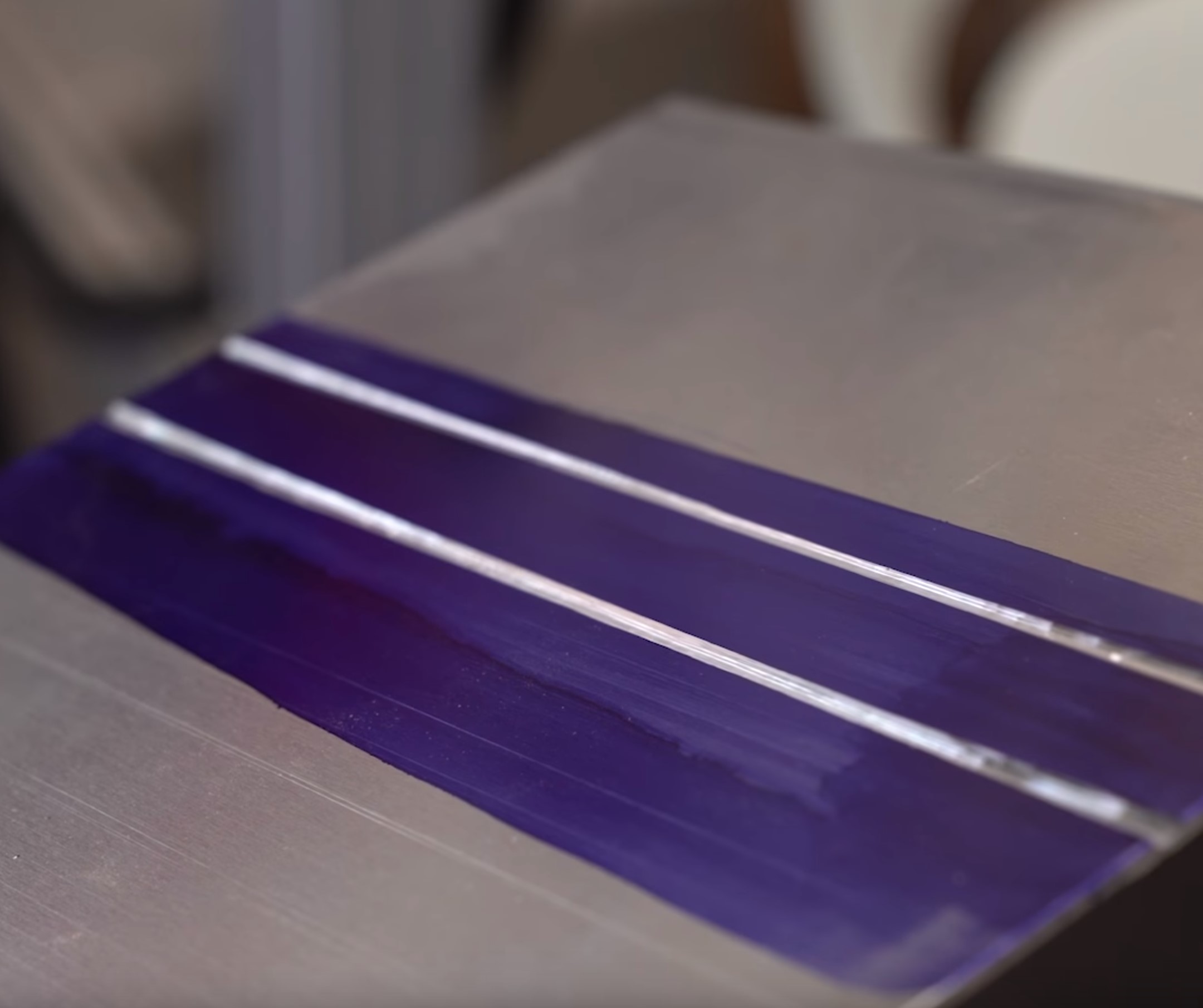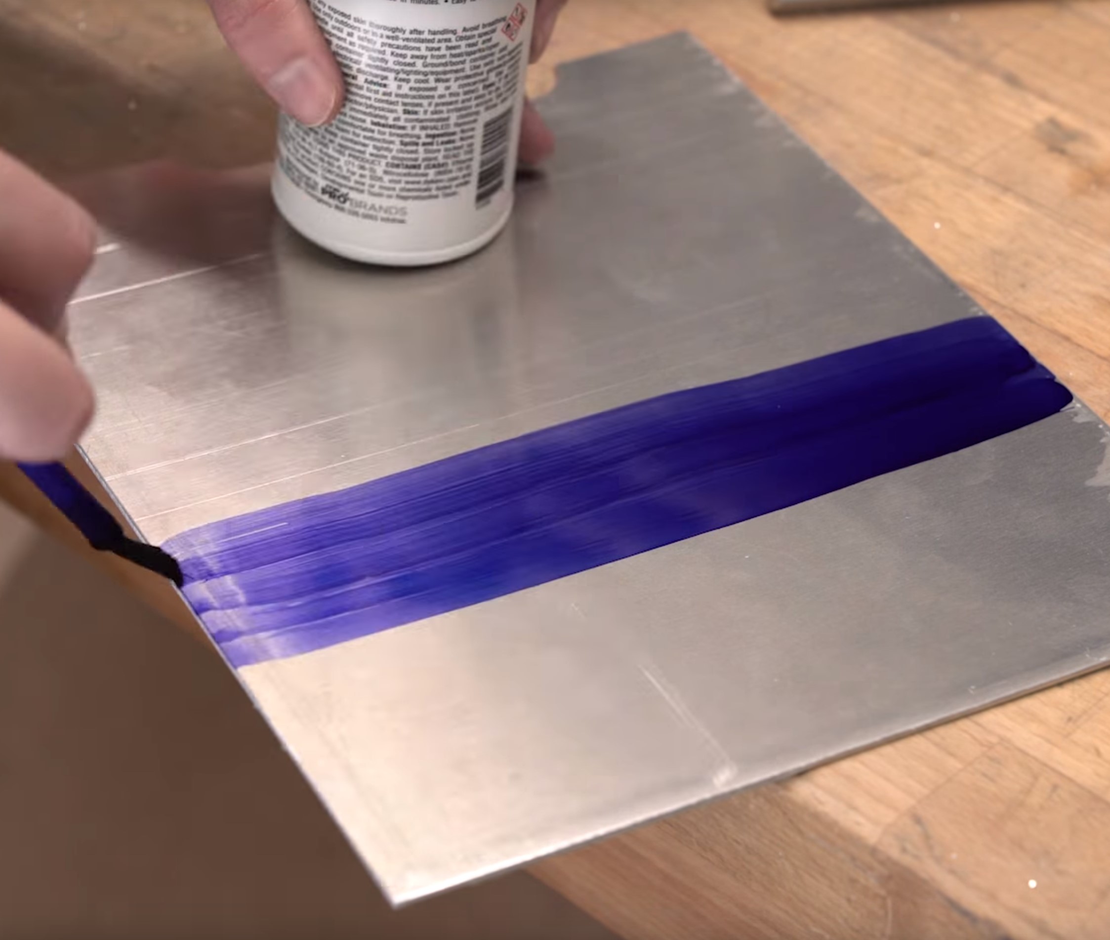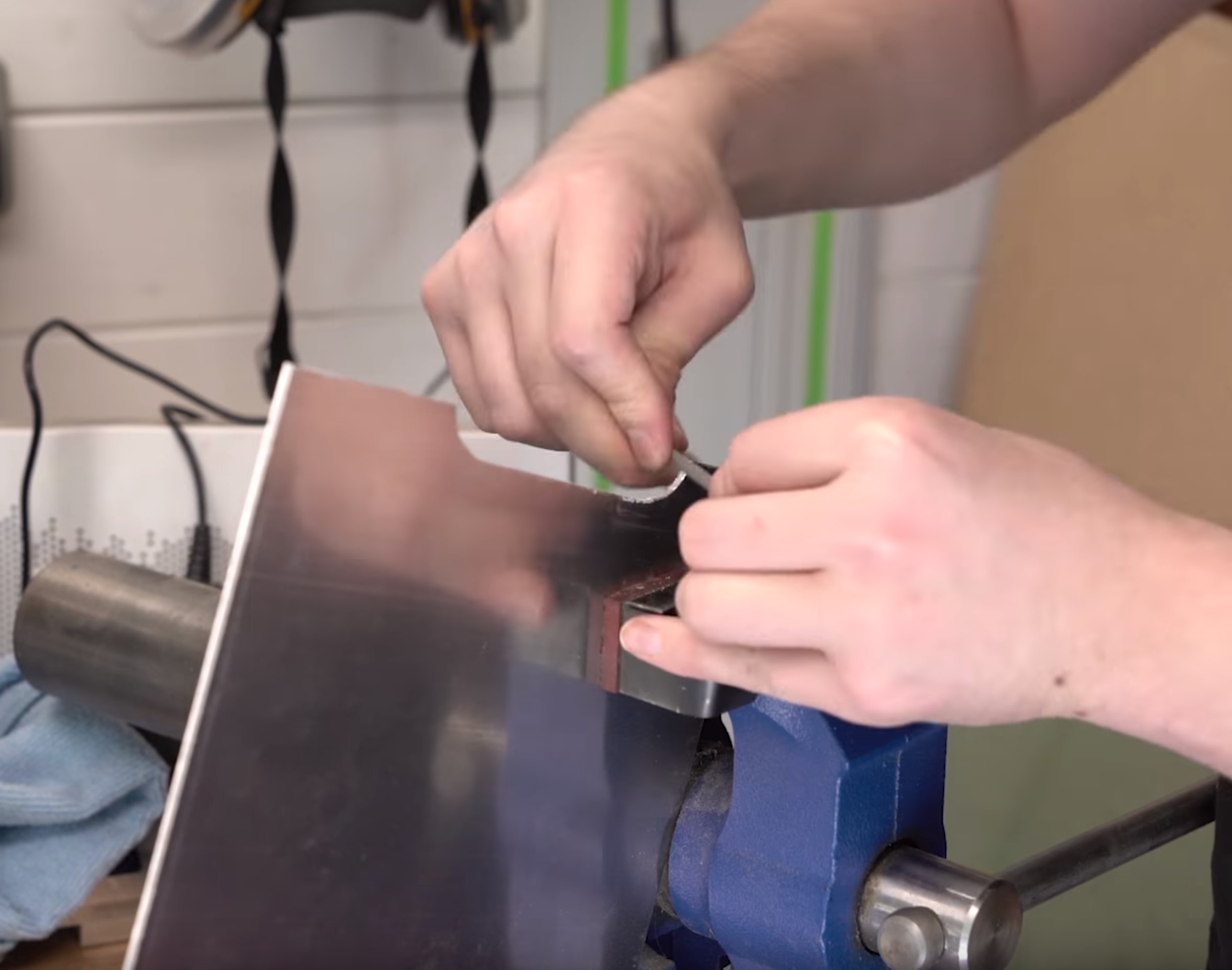 With the bend lines scored, it's time to do the finishing. It's way harder to sand a bent piece of metal, so you're better off doing it whilst it's all flat. I taped it to the workbench, then using a hand sander I sanded in one uniform direction, starting with 180-grit and finishing with 320. You can of course use higher grits if you're after a finer finish. To get the grain to pop a bit more, you can go at it with some Brasso or similar polish, then clean up with acetone, which will pull out all the dust from the surface.