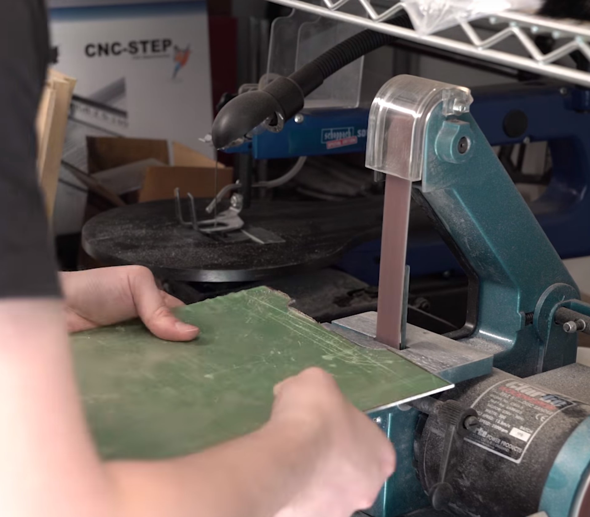 With the template all traced onto the metal, it's time to cut the piece out. I used a jigsaw with a metal blade for this, as it's simple and quick. Try to keep your cutting lines accurate, as this will save you headaches later. After the rough cuts, I took the piece to the mini-belt sander to get the edges nice and flat. You can use the Sharpie line here to see clearly which areas need more sanding. The interior edges I finished off with needle files, followed by a quick de-burr.