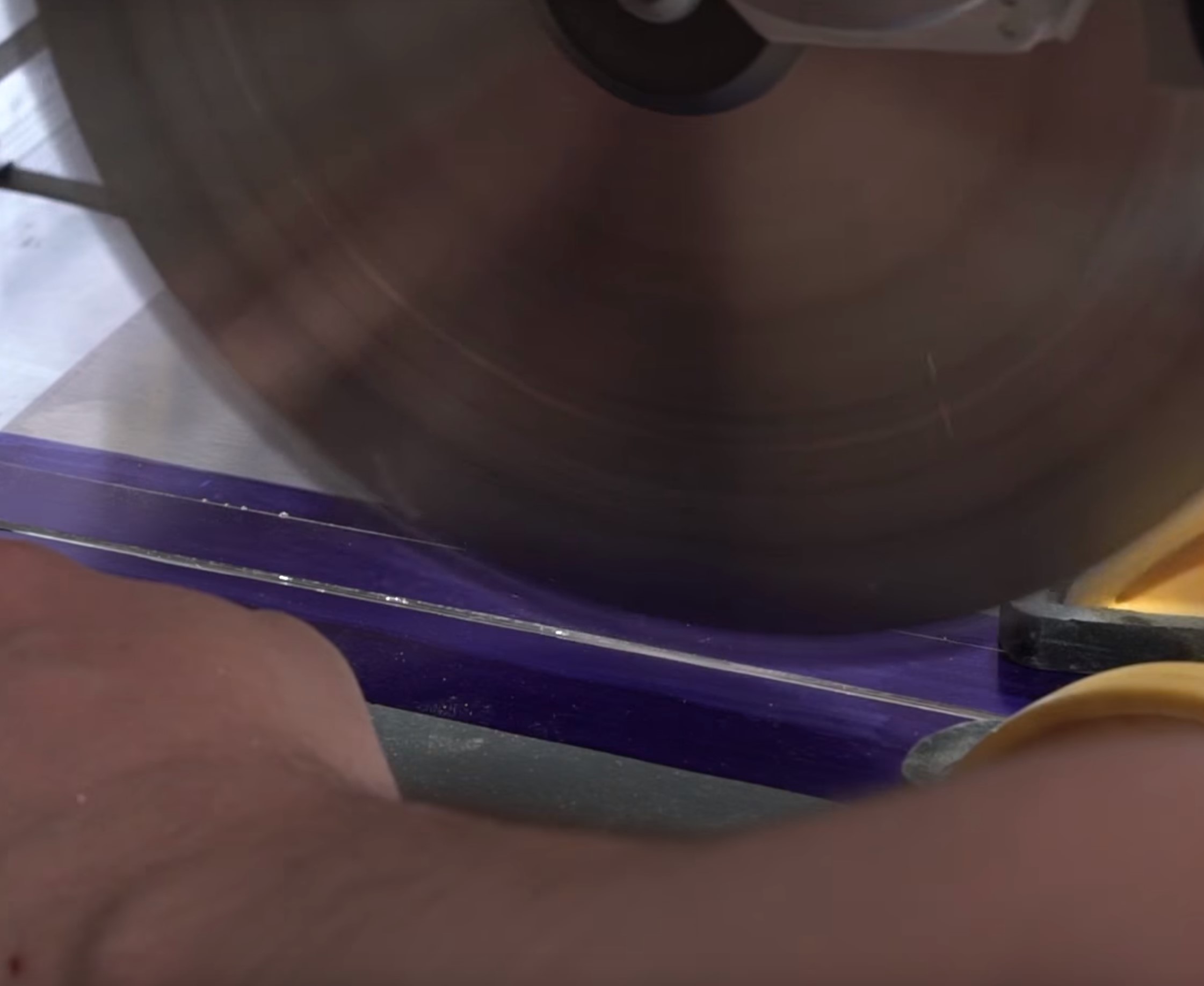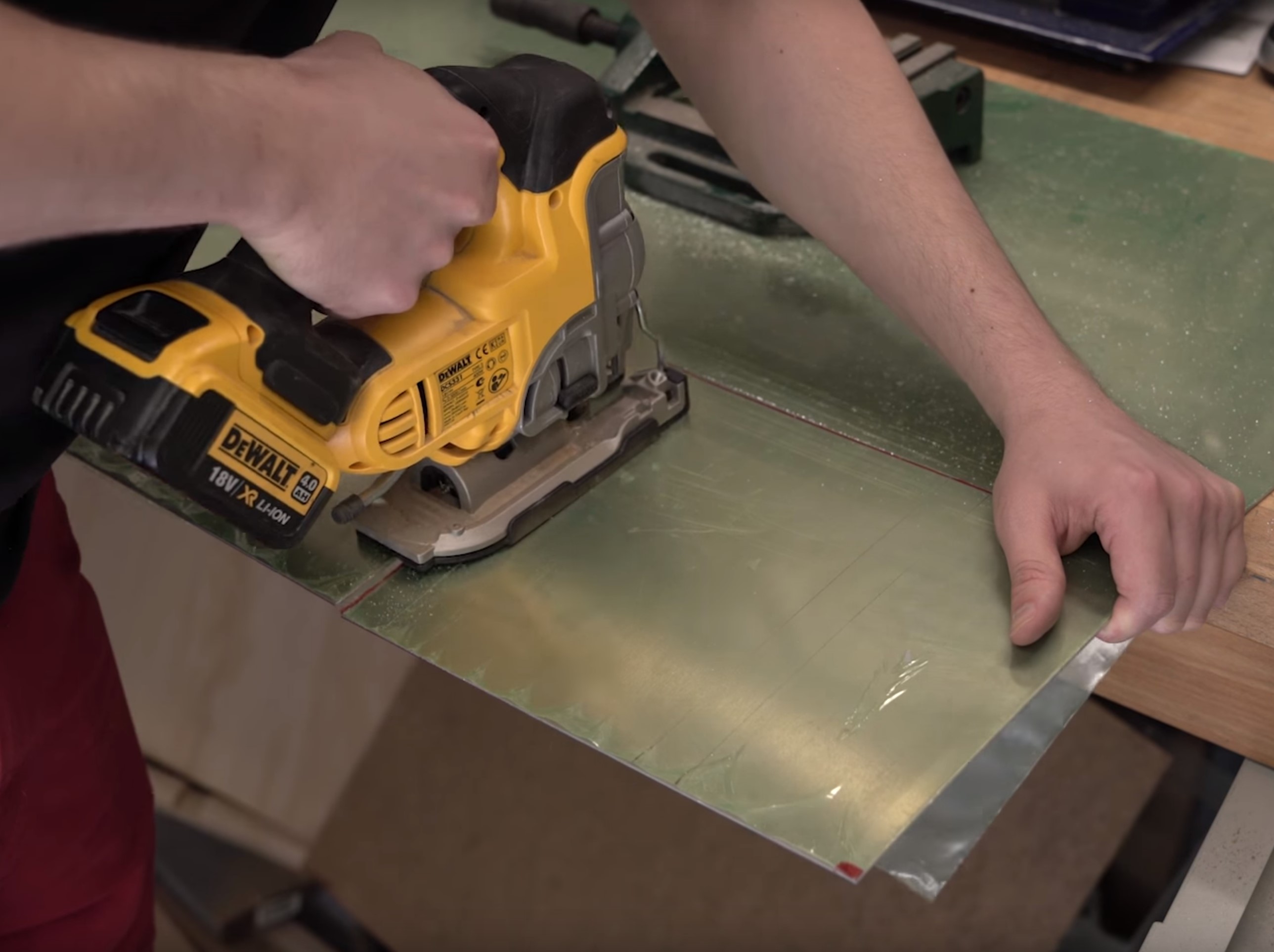 To help bend the metal cleanly, I'm going to score the inside edge using a mitre saw with the depth stop set to about 1mm. You could use a panel/plunge saw for exactly the same thing, or even Dremel if you're particularly keen. That said, scoring isn't essential, especially if you happen to have a metal press brake. I don't, so I use this method so that the bends are crisp and accurate.