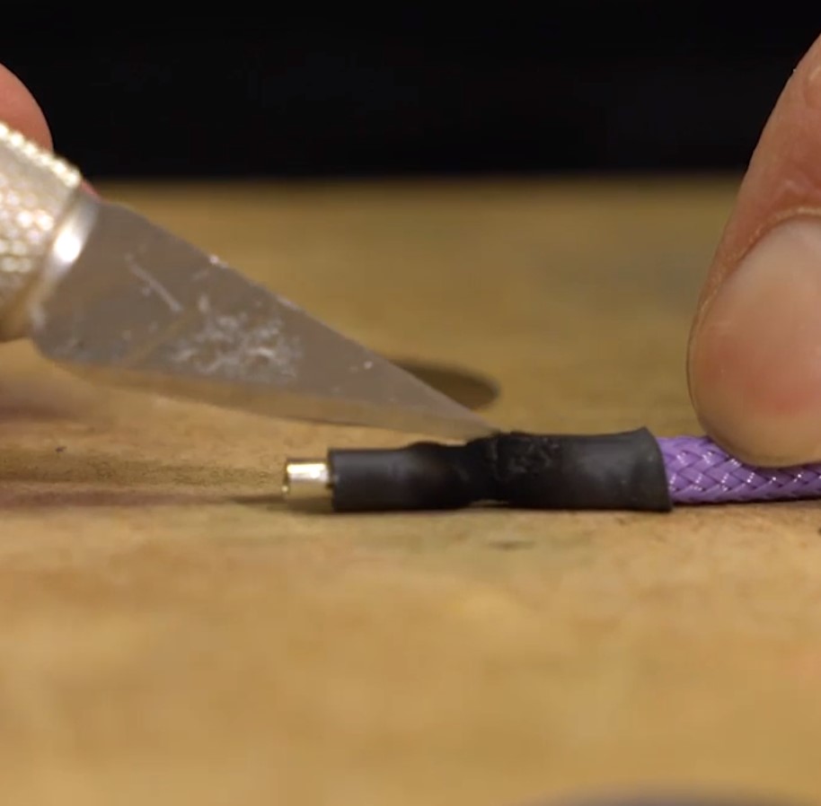 Following the 'heatshrinkless' sleeving method, place some heatshrink on the ends of the wire by the pins, then slightly burn with the lighter. By burning the heatshrink, it constricts but also melts the sleeve underneath, leaving a well-formed cone of melted plastic just behind the pin, this provides ample support for the sleeving material when you pull on it. You can either rip the heatshrink off the end with some pliers or slice it and peel off. I've definitely become a fan of the slicing method recently, as it means you can remove the heatshrink when it's cool, which tends to leave a really pretty melted cone. It's also not really much slower; if doing a big cable like a 24-pin, you can heatshrink all the wires in one go, then remove the shrink in one go without swapping tools and so on, like a small production chain.