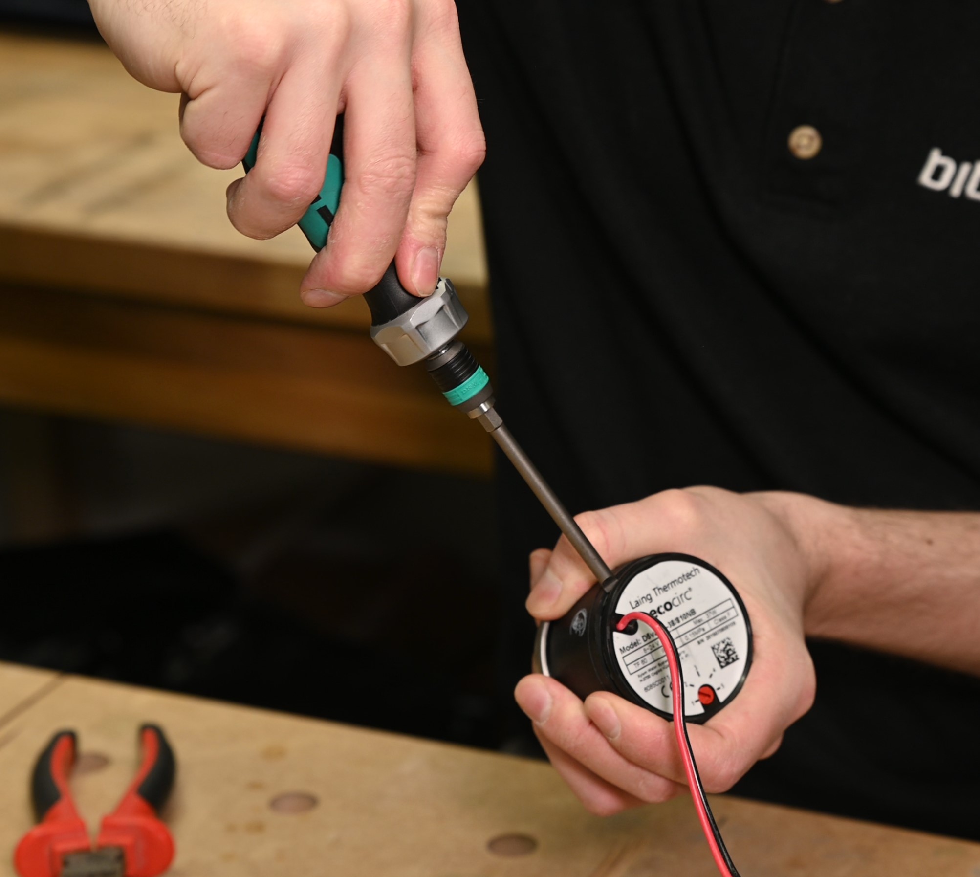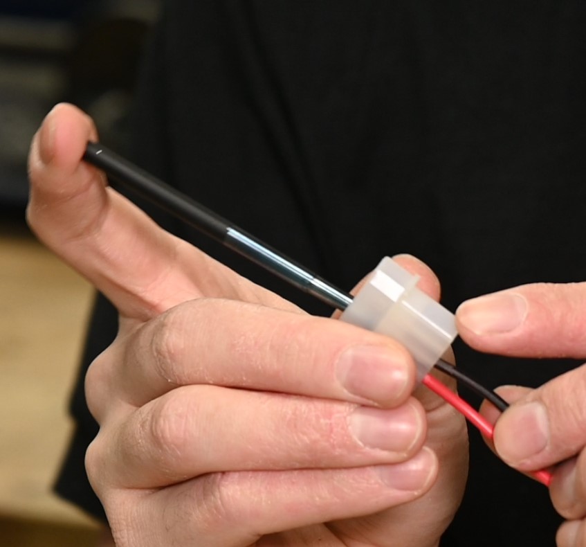 Pull the sleeving tight, then optionally you can apply a little heatshrink at the base by the pump (don't use the lighter for this, the flame is too hot!). I tend not to bother, as I've found the pump back does a good job of holding everything in place, but it's up to you. Simply slide the back of the pump over the wires, clip in place and then place the wires back into the connector. I used this opportunity to swap from a translucent one to a black plastic variety.