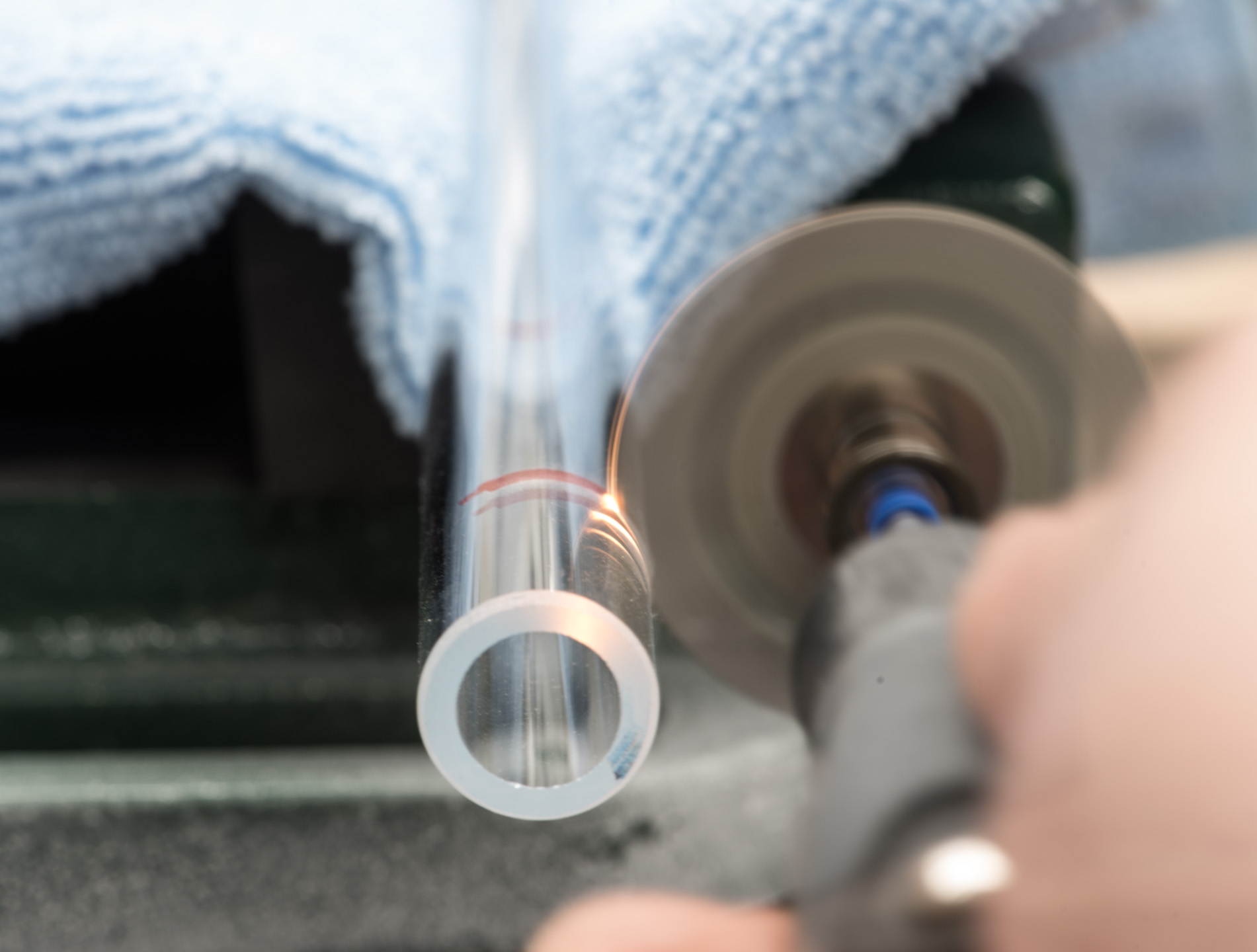 To use the diamond disc, simply clamp your tube to a surface and cut on a fairly low RPM. You don't want to use a high one else you'll melt the glass at the cutting edge, which can lead to heat shock and cracking. You can use the face of the disc to sand down the ends to reduce burrs and chips. Be very mindful of the dust, though, since it is very fine. I would 100 percent suggest using a mask and safety glasses when using this method, and you will still want to sand down the ends by hand after cutting for a smooth bevel and finish.