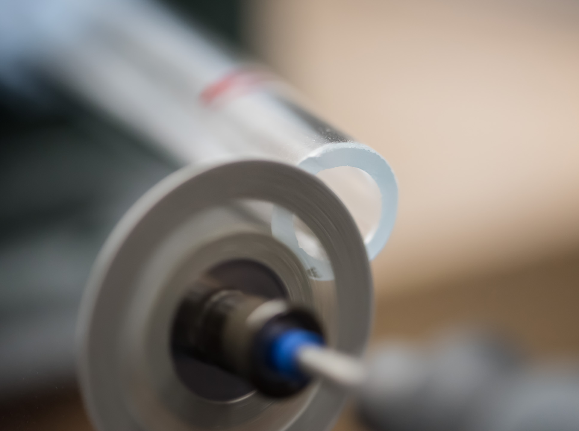 With the scoring done, it's time to make a break for it (hah), and this is where we test how thorough that score was. All you need to do is place your thumbs on either side of the line, then apply sharp pressure. It should hopefully snap pretty cleanly along the line, although occasionally the edges may chip too deeply. It's a good idea definitely to have a healthy amount of spare tubing in case of undesirable breaks.