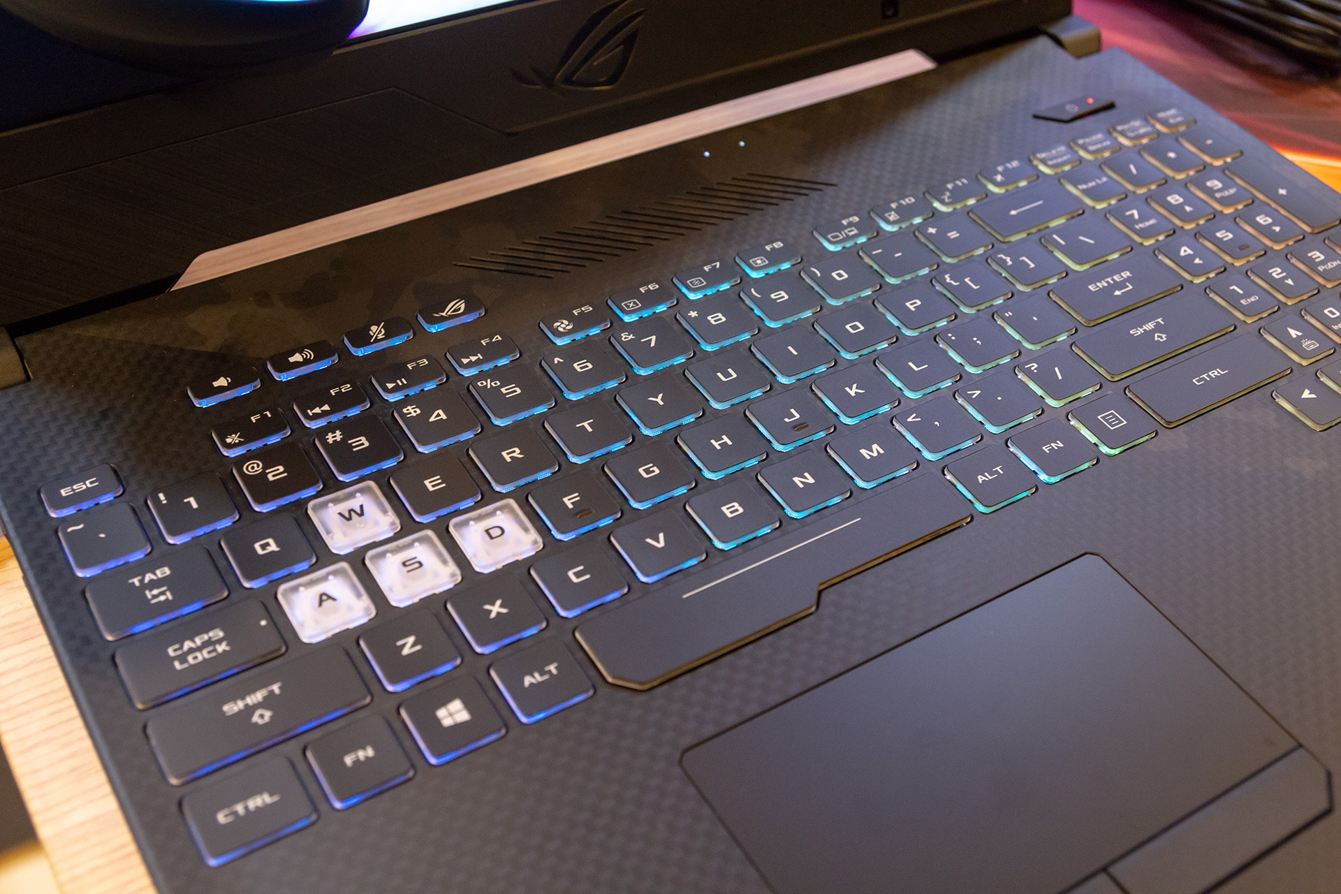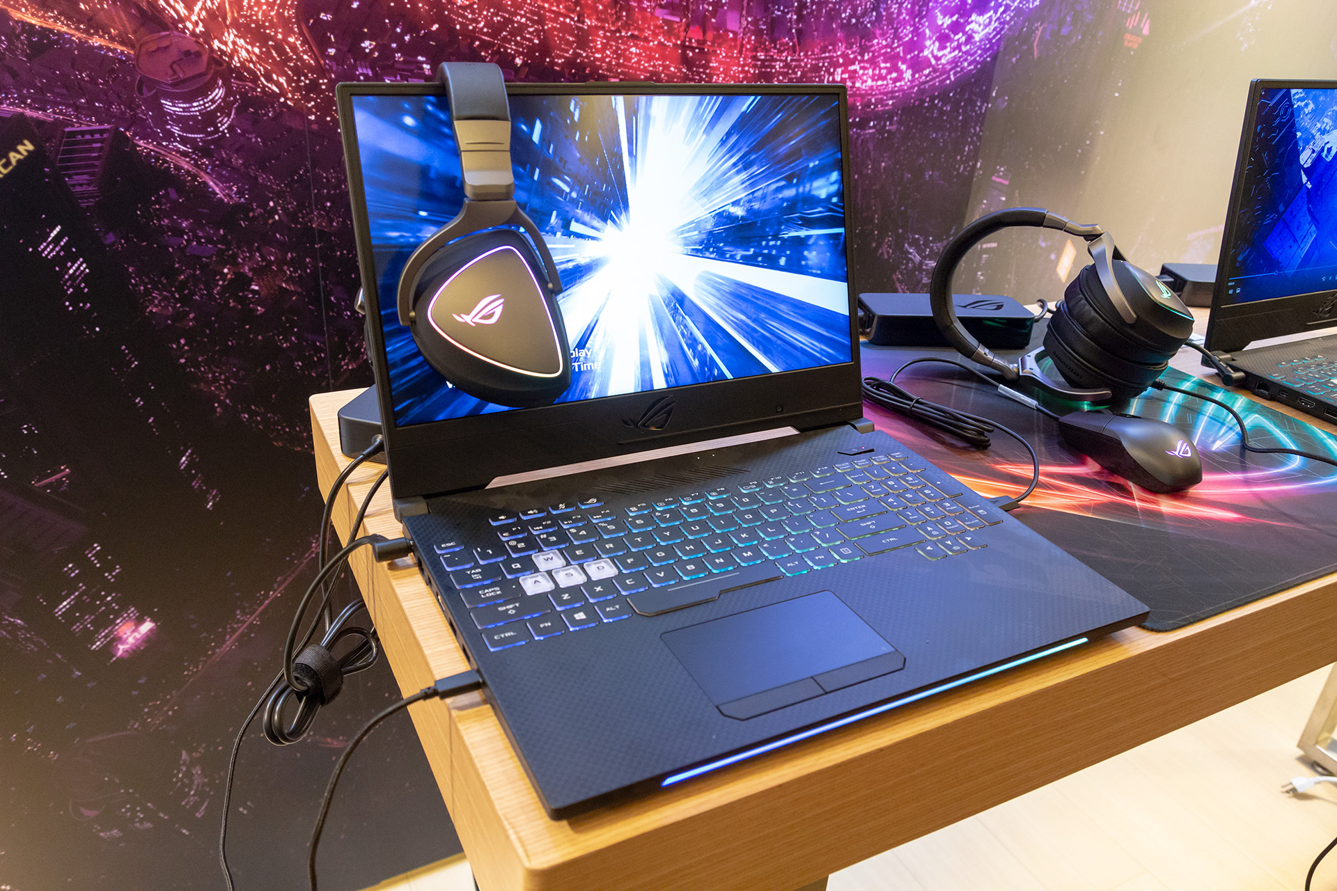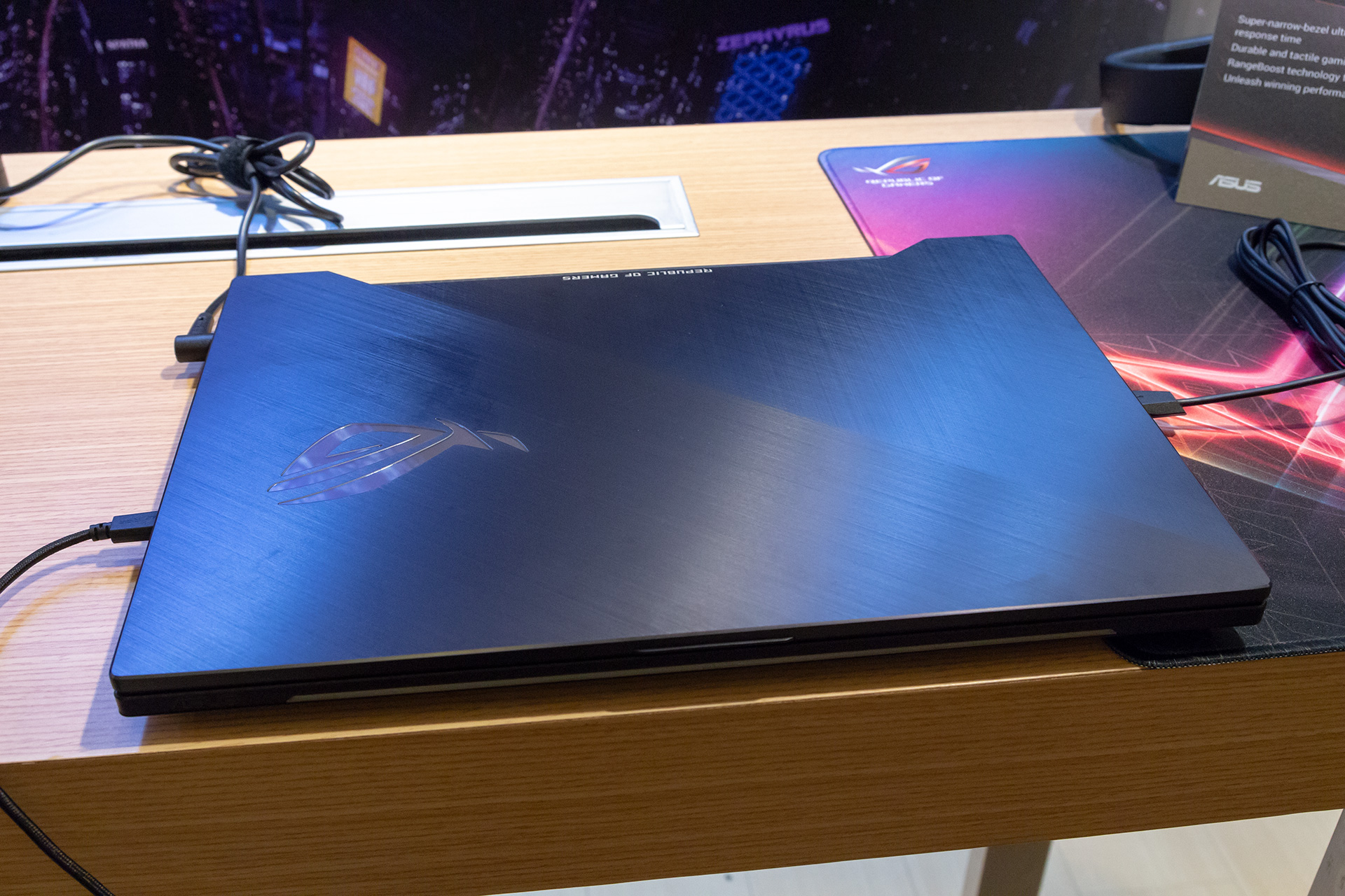 Next, the laptops. The ROG Hero II is geared towards MOBA players, while the ROG Scar II is aimed at those who prefer FPS games. It’s a small difference, really coming down to which keys are highlighted (QWER or WASD respectively) on the mechanical keyboard, which has four-zone RGB lighting (Asus Aura Sync supported) and n-key rollover. The chassis has a two-tone contrasting brushed metal finish and a new RGB light bar along the front edge. The border around the screen has been reduced by 2.33cm compared to the original models, resulting in a lower overall footprint. The 14” display is a FullHD (1080p) IPS panel with 144Hz refresh rate and 3ms response time. The lid is designed so as to not block the rear exhaust vents when opened, and the cooling system has seen a number of upgrades such as extra cladding on the heat pipes, improved fans, and ulltrathin 0.1mm fins.