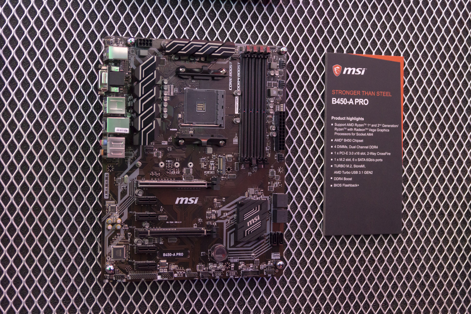 We are also starting to see B450 motherboards appear, and MSI had two ATX models on show utilising this chipset that offers much of what X470 has but at a lower price point. The B450-A Pro will be something of an entry level model probably costing around $100 touting a basic feature set that still includes an M.2 slot, USB 3.1 Gen2, and a Bios Flashback+ button.