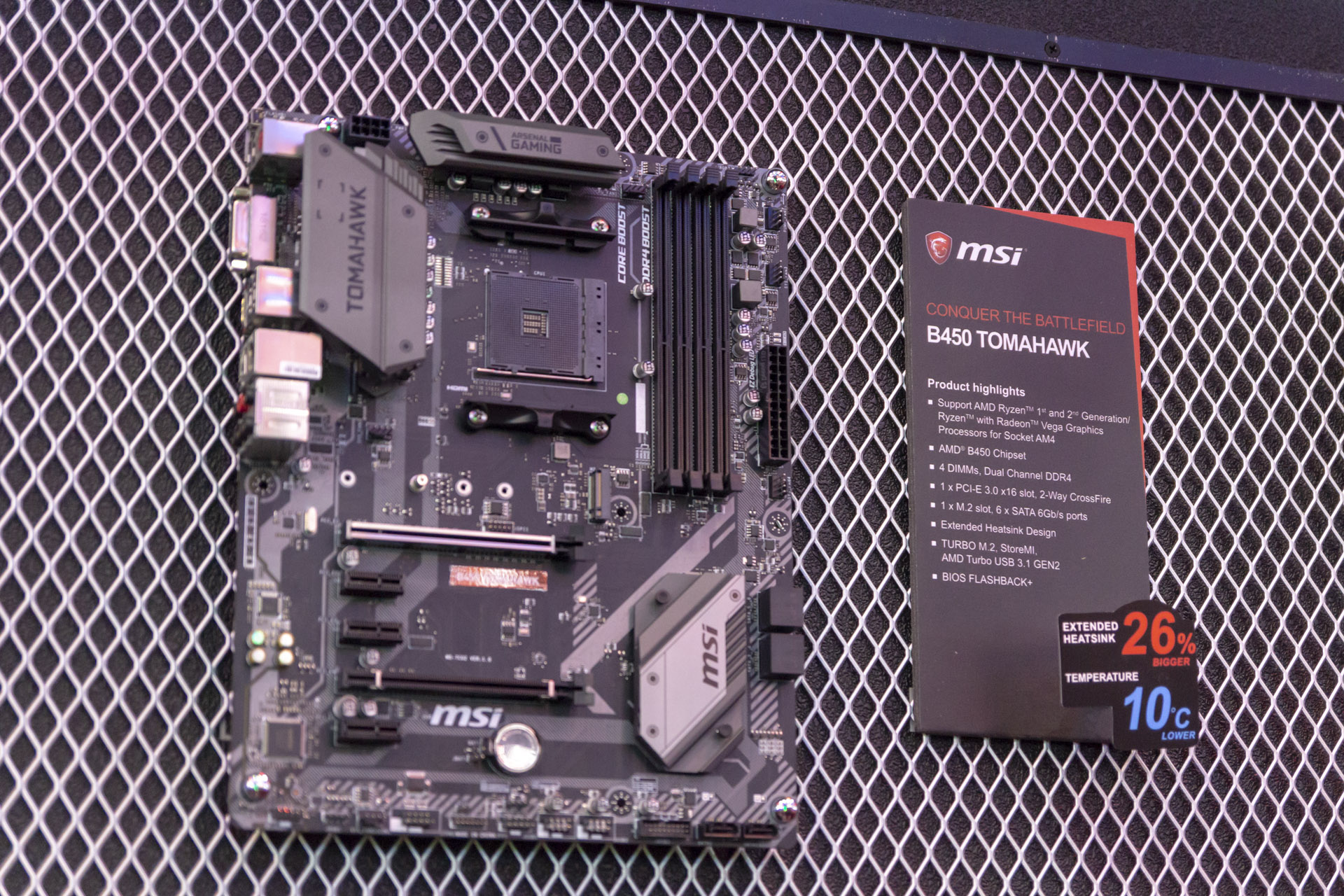 Then there’s the B450 Tomahawk with beefier cooling but otherwise what looks like a largely similar feature set. Pricing for this one will be a little higher, but by how much we’re not sure.