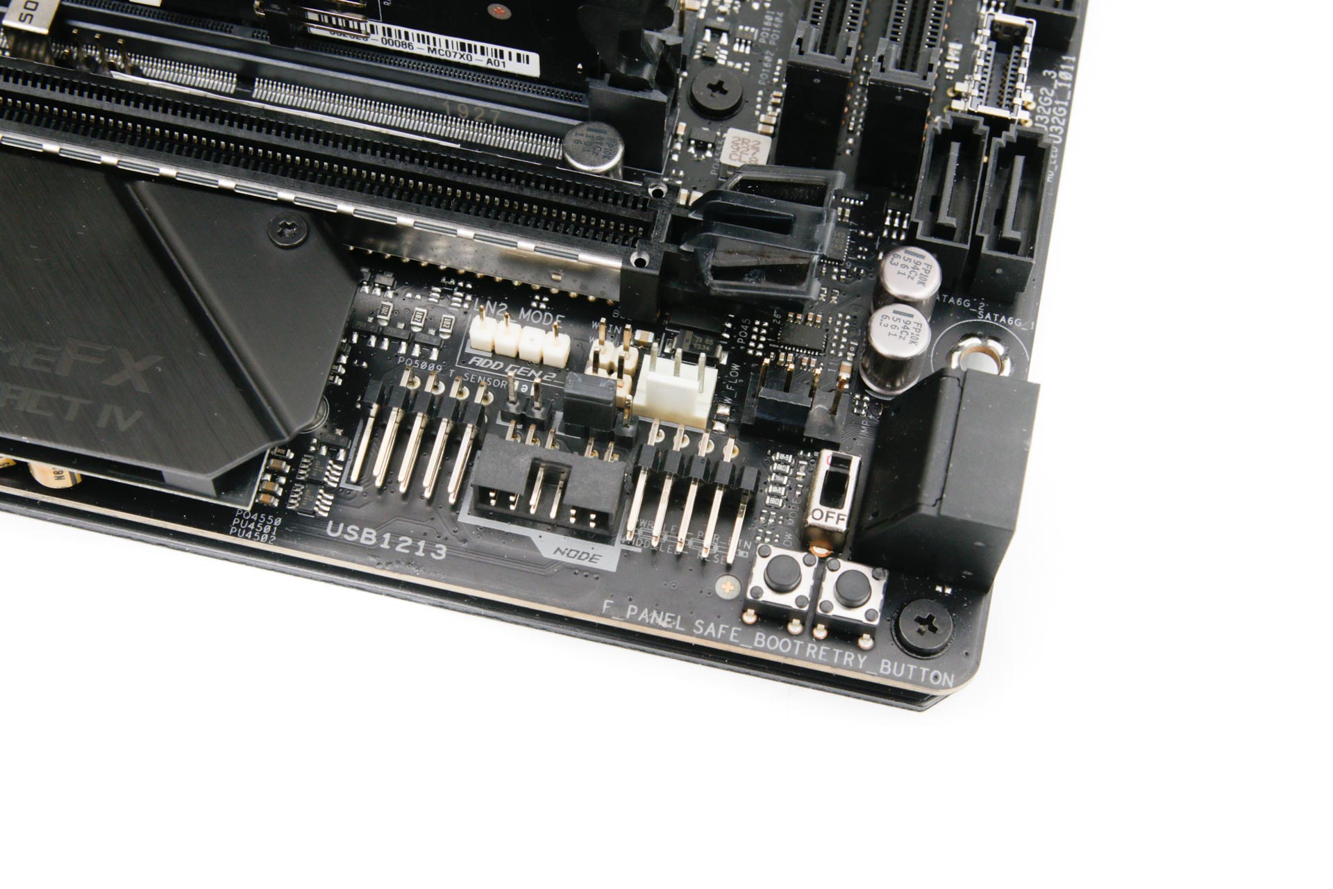 We're big fans of Asus' DIMM.2 modules, as they're genuinely useful, effective, and something the competition doesn't have. Here, it's cutely named SO-DIMM.2 and sports two PCIe 4.0/SATA 6Gbps M.2 ports, the aforementioned pair of four-pin fan headers, and an extra RGB header of the three-pin digital/addressable variety. Each M.2 port is topped by a separate large heatsink, and the added height means these can take more advantage of your case's airflow (or for us, a very exposed part of the test bench). For example, we saw a peak M.2 temperature of just 45°C, which is one of the lowest we've ever seen. The SO-DIMM.2 solution means Asus neatly avoids using an M.2 heatsink that gets trapped under your graphics card, although it's not the most elegant thing to look at on the PCB.