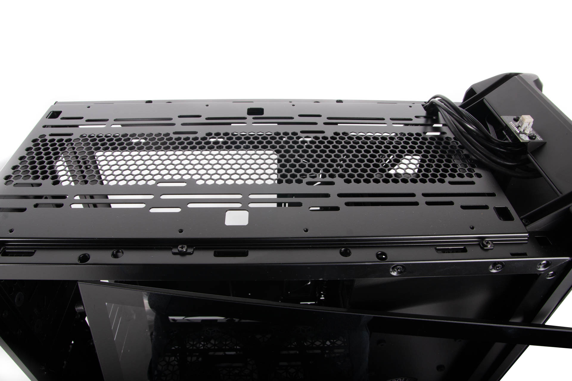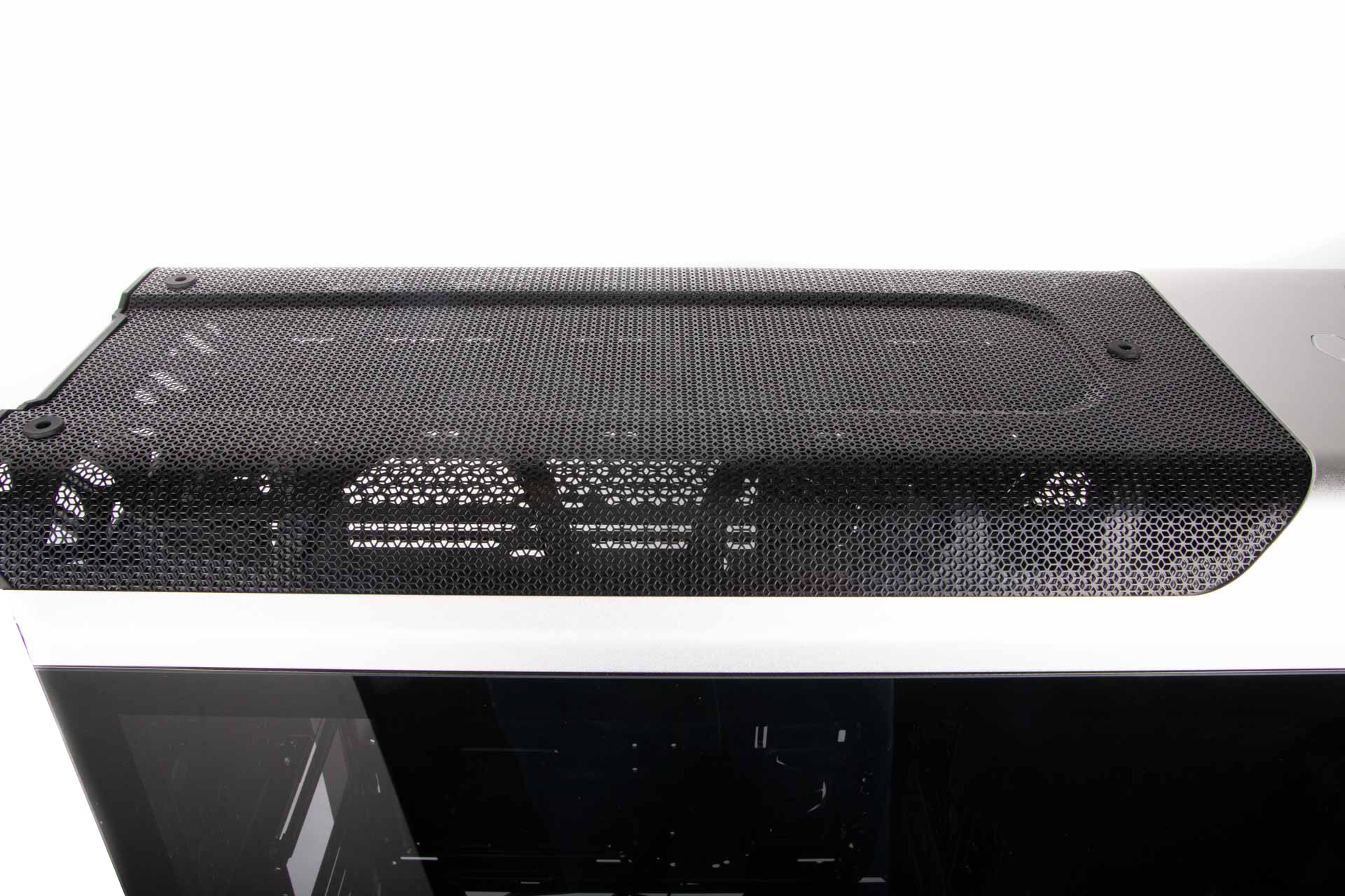 The roof has a large aluminium panel in place as standard, but should you wish to add fans or a radiator here and need more airflow, you can remove the panel to reveal the rest of a large black mesh that's only partially visible with the panel in place. The downside is that instead of using magnetic mounts, the panel slots into four rubber grommets, which are then visible in the mesh. The entire panel also pops off giving you access to the fan mounts beneath.