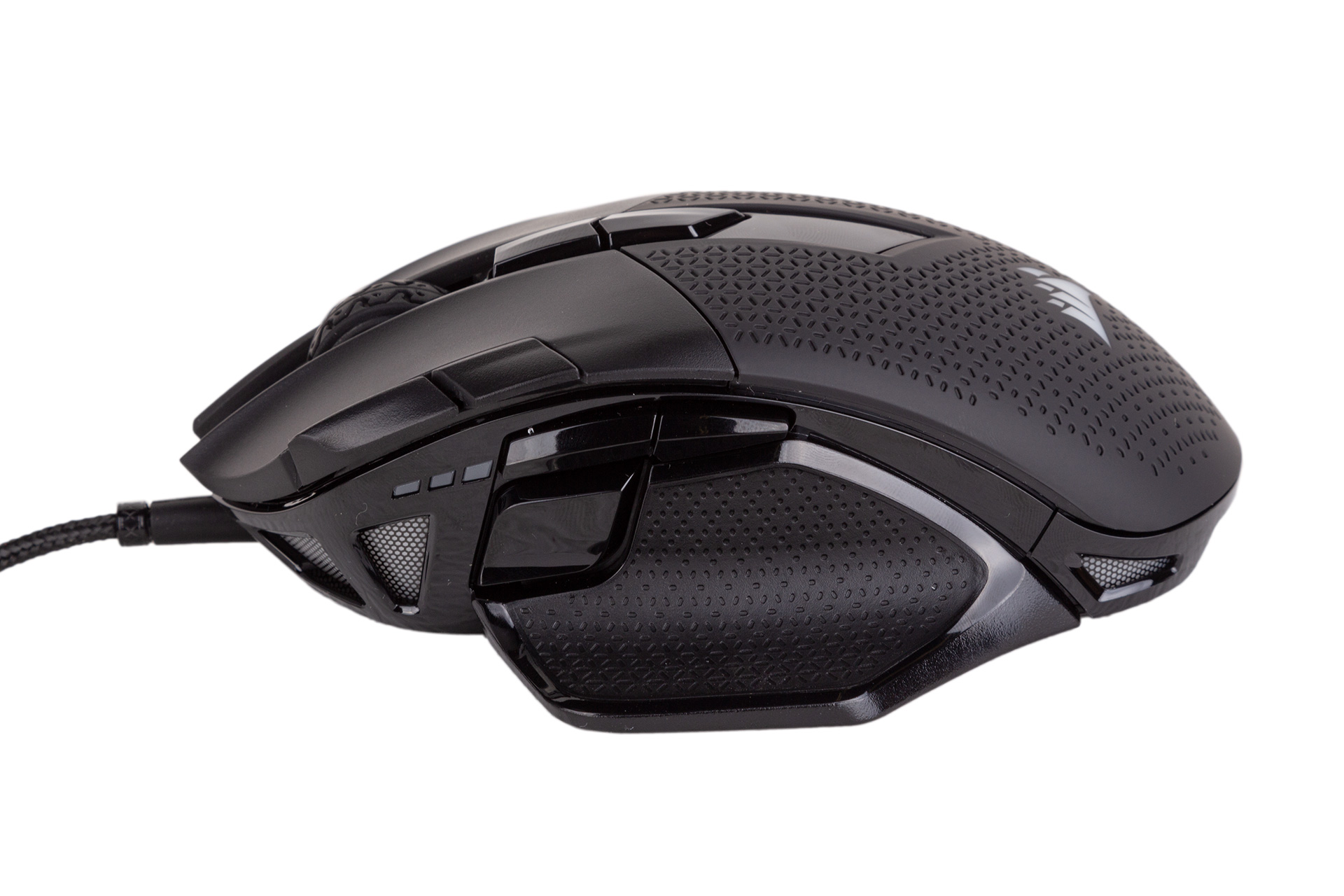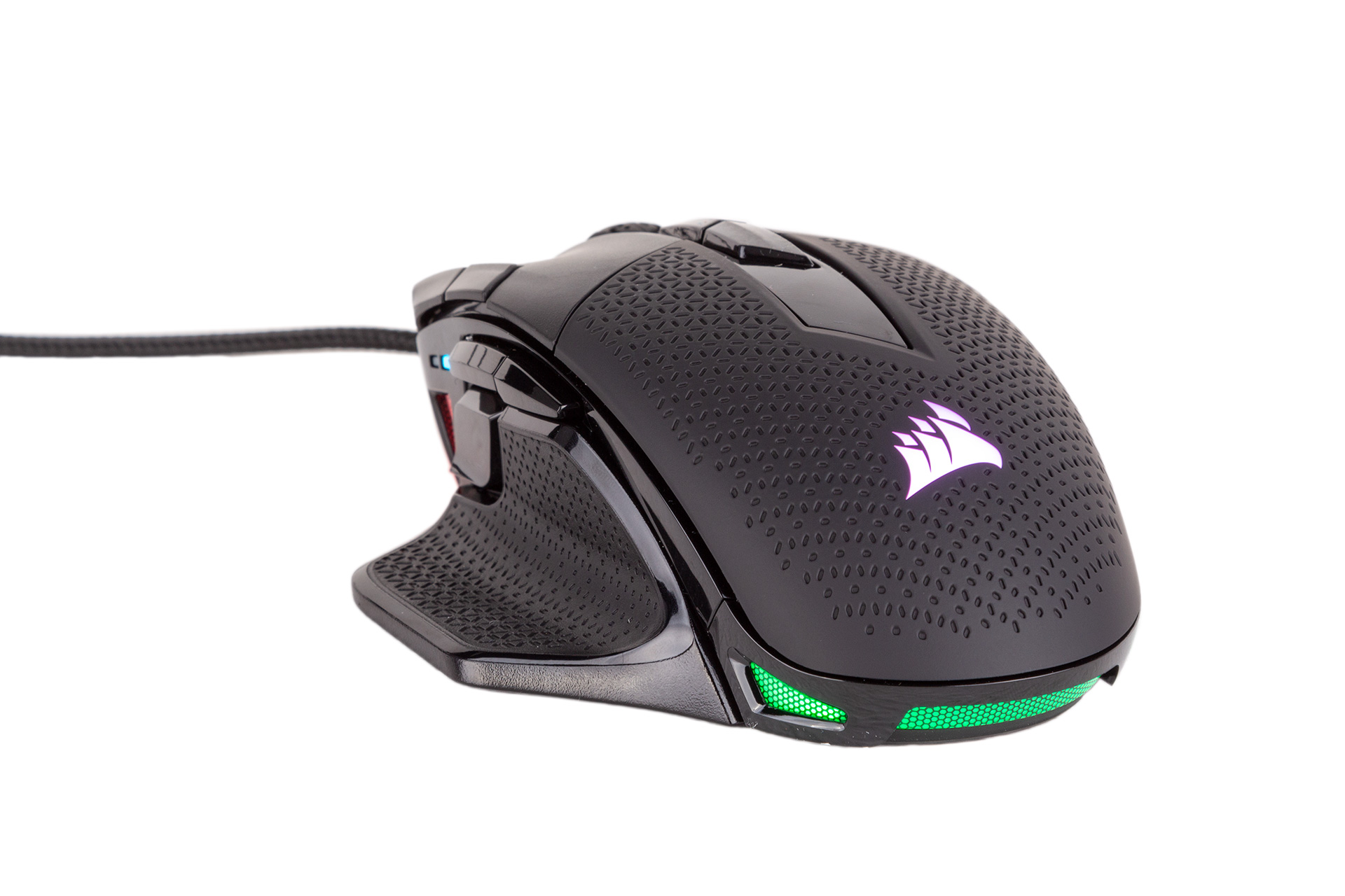 Corsair also uses LEDs to feedback information to the user, with a three-tiered indicator zone placed just beyond your thumb, making it easy to see at a glance. Although typically used to indicate the current DPI level, they also all illuminate red (or whatever colour you pick in software) for a few seconds whenever you switch profile – some reassuring feedback.