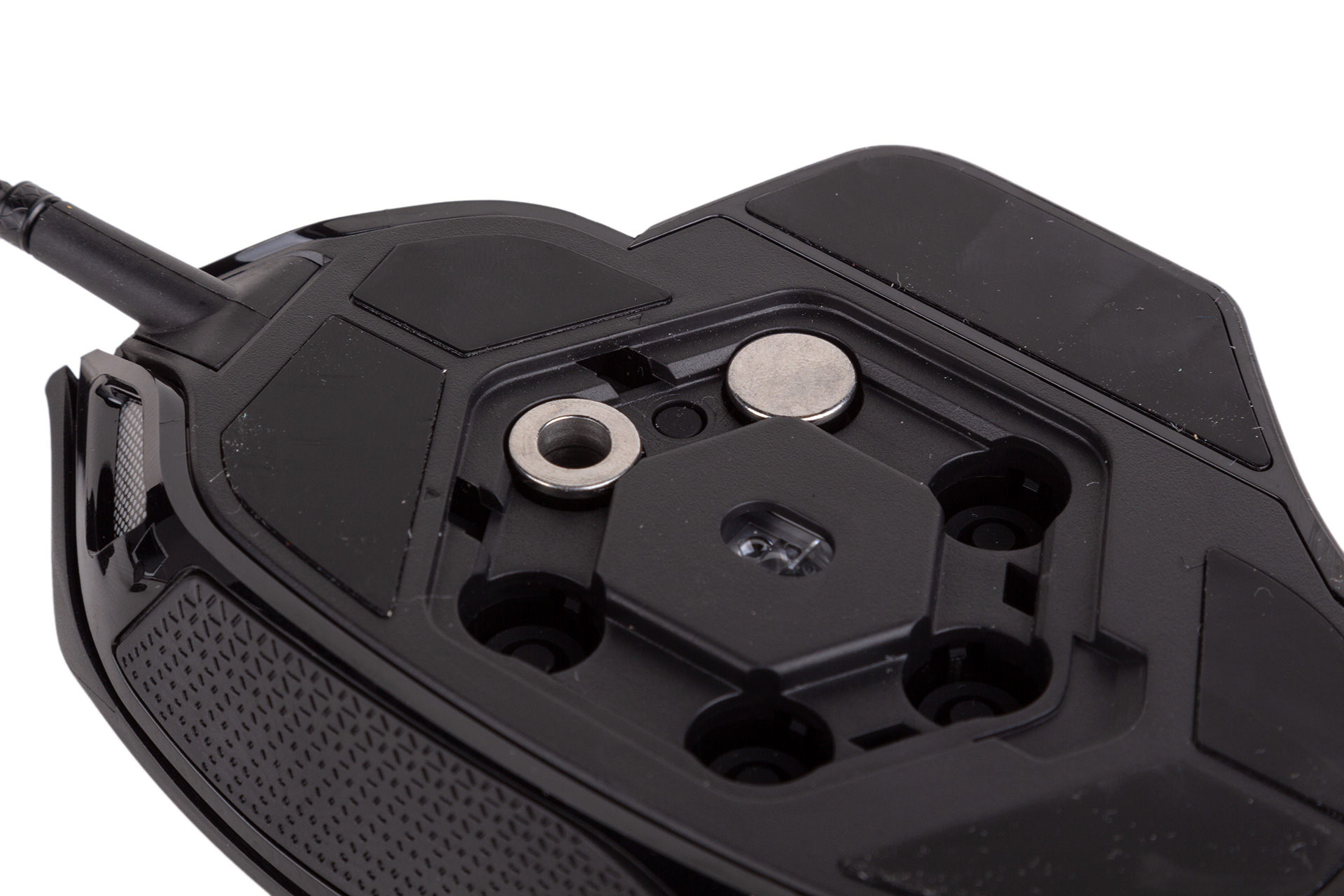 It’s not, however, the weight you’re stuck with. Supplied with the mouse is a set of weights inside a plastic capsule, three hollow cylinders weighing ~2.8g and three full cylinders weighing ~4.5g. These can be inserted into or removed from the dedicated central section of the mouse, which is accessed by unclipping a simple but secure plastic cover on the underside.