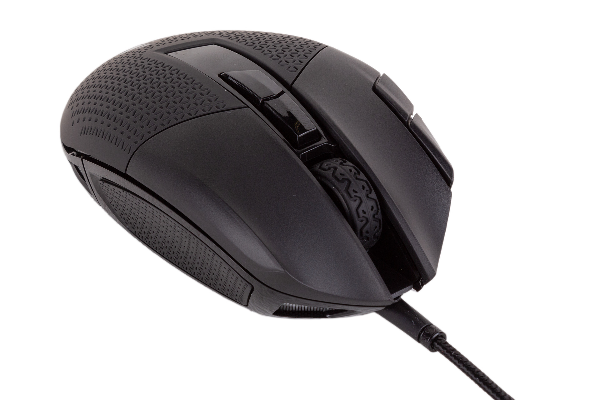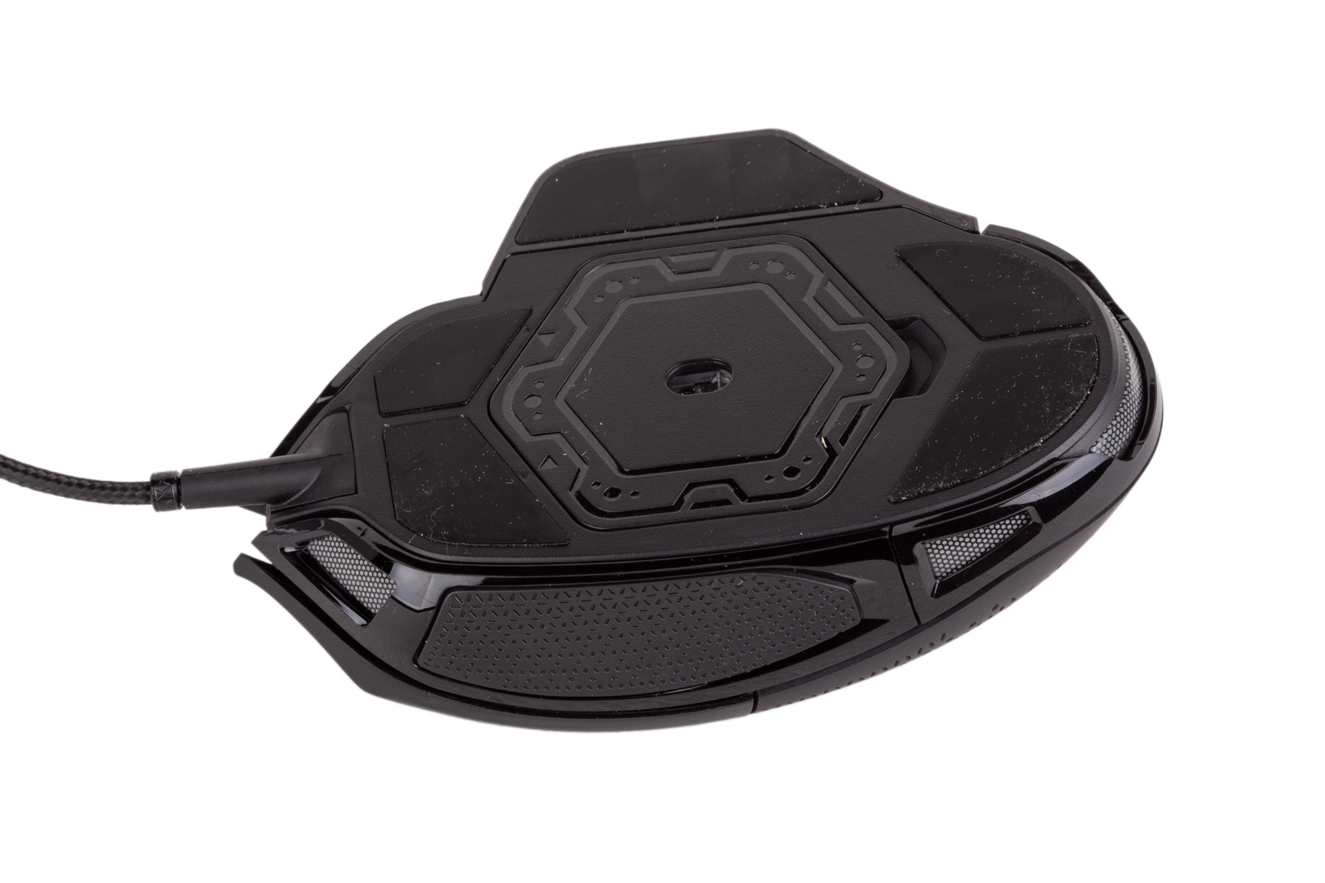 You’ll also find five very large PTFE feet on the underside, and glides with this mouse are extremely smooth. The 1.8m USB cable is braided and emerges from the centre of the mouse without dragging too much on the desk.