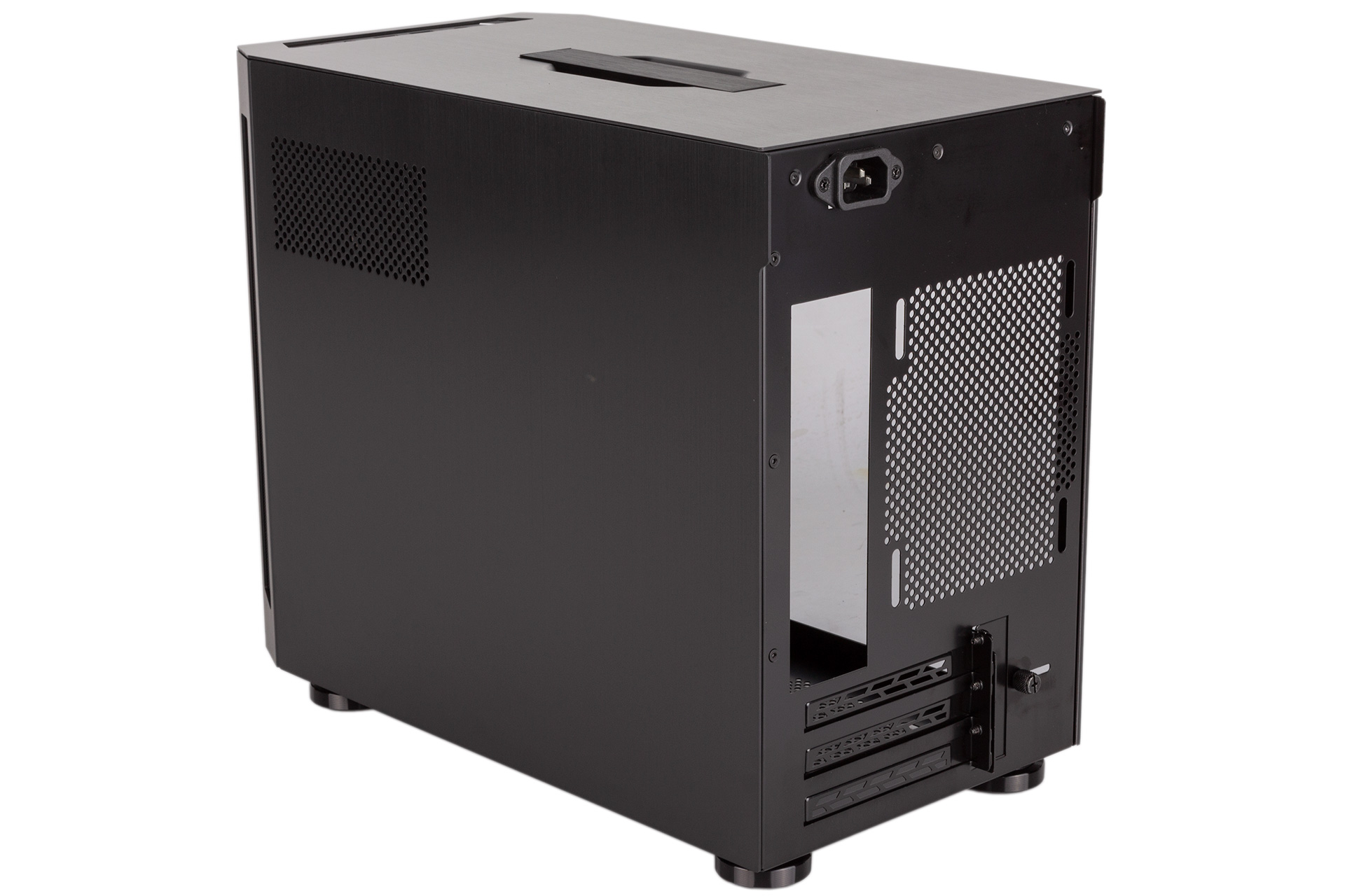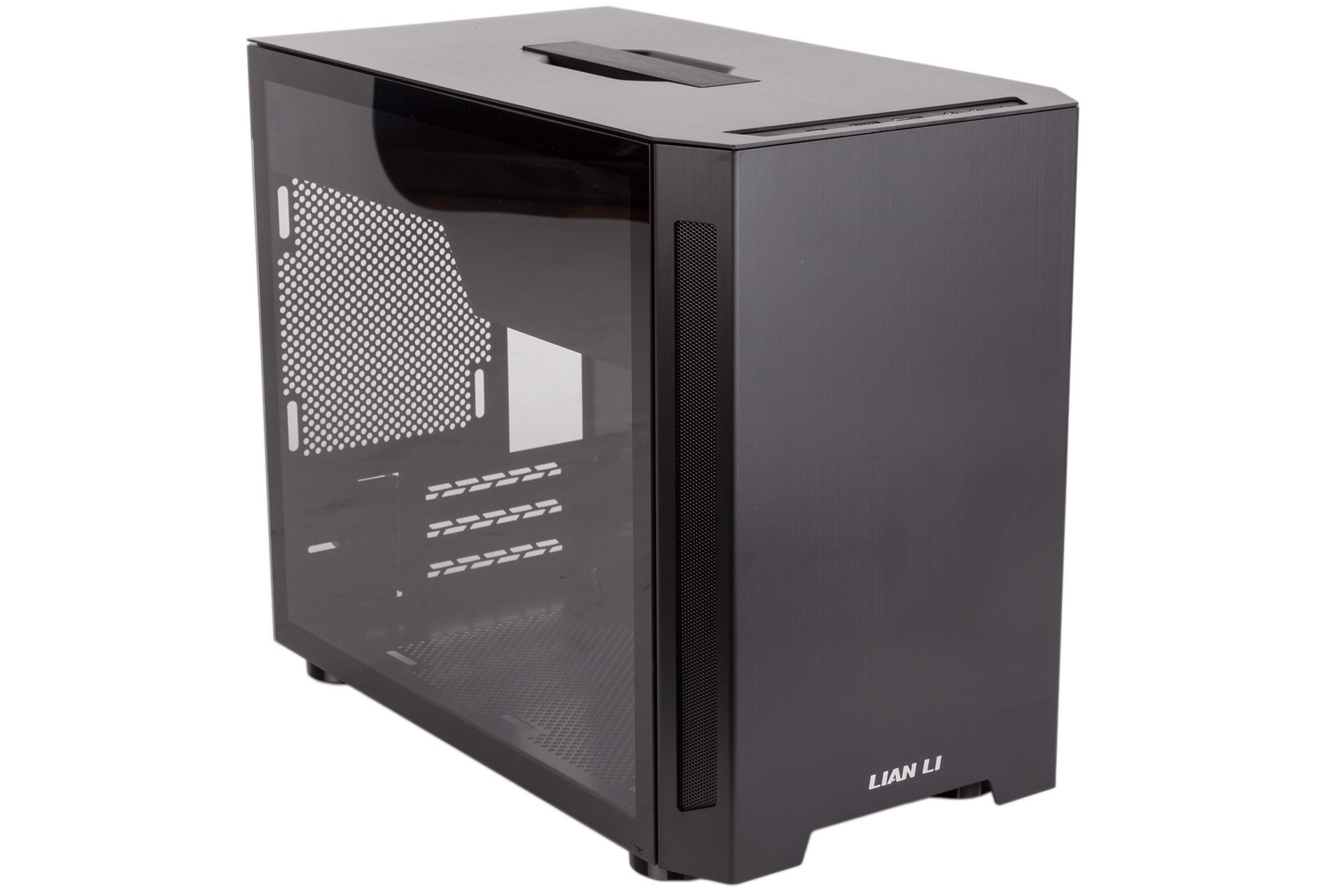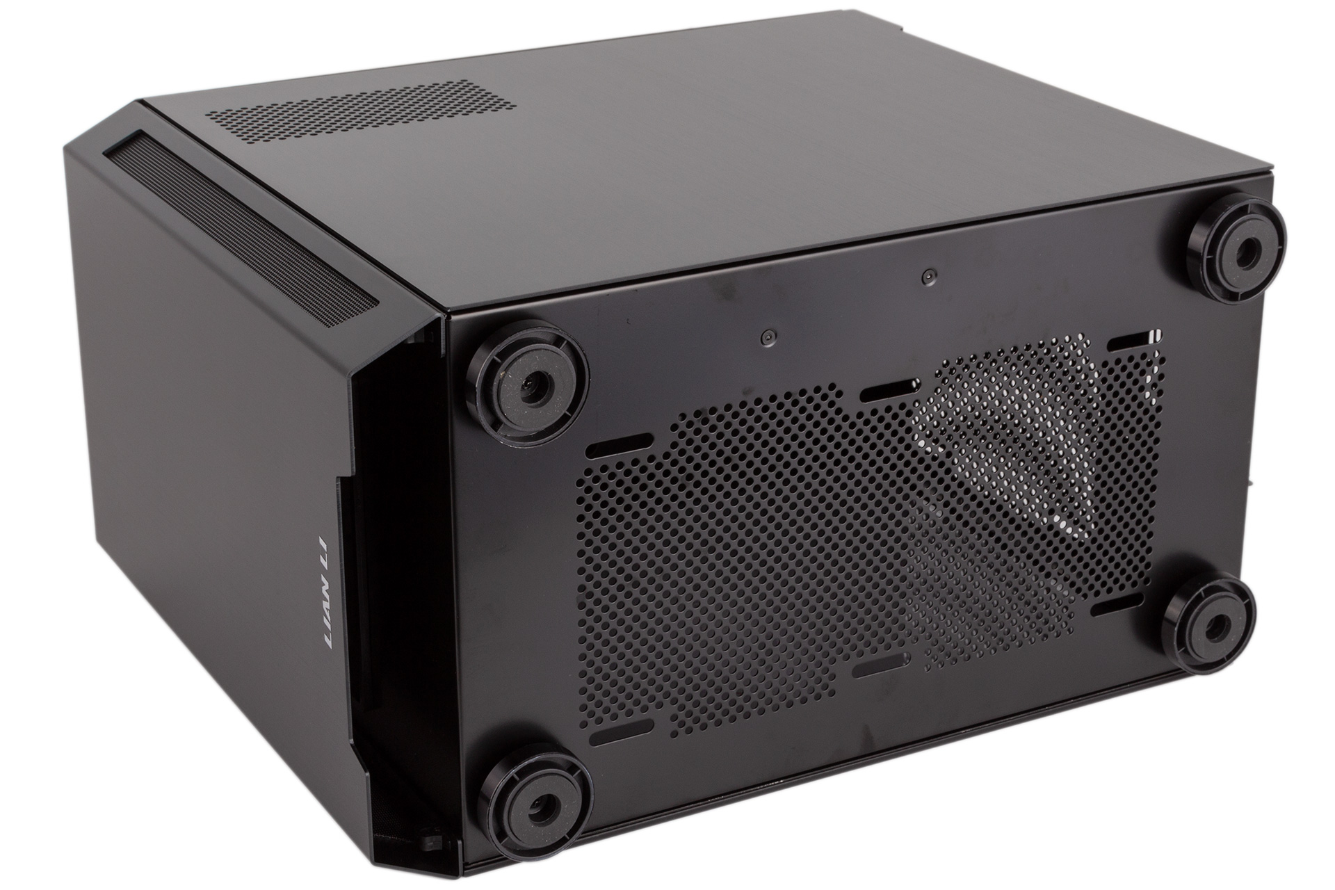 For airflow, Lian Li is banking on the ventilated angled sides of the front panel as well as the gap underneath this panel, and any lower fans will be able to draw air in directly through the bottom panel. The right side panel is also perforated for PSU exhaust airflow.