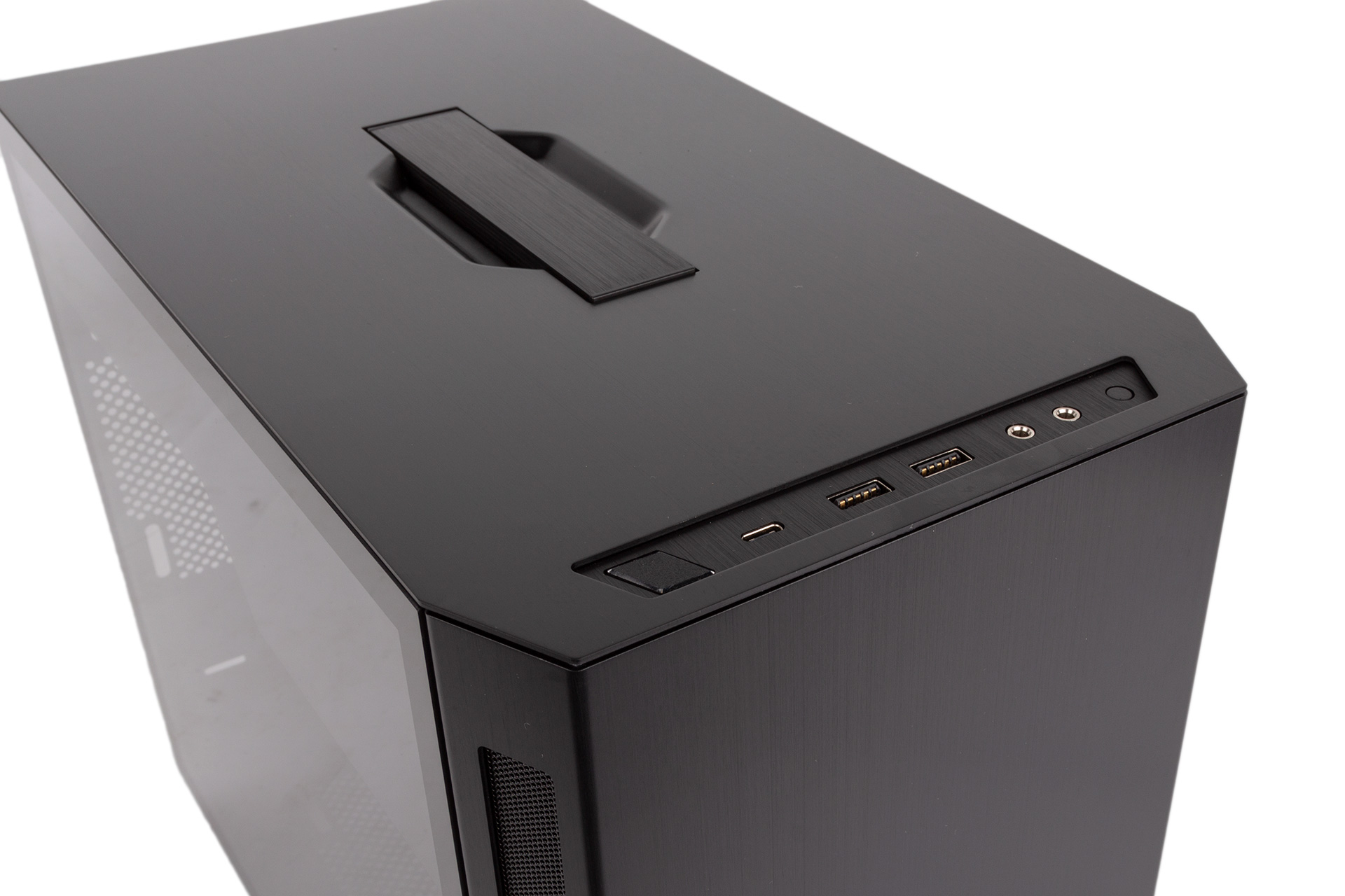 The front panel is neatly recessed and suitably equipped for a modern chassis. The regular pair of USB 3.0 ports (USB 3.1 Gen 1) are joined by a full-speed USB 3.1 Type-C port (USB 3.1 Gen 2). Lian Li has gone with separate audio jacks rather than a combined one; we still prefer this approach, but it’s not a big deal either way given the easy availability of adaptors.