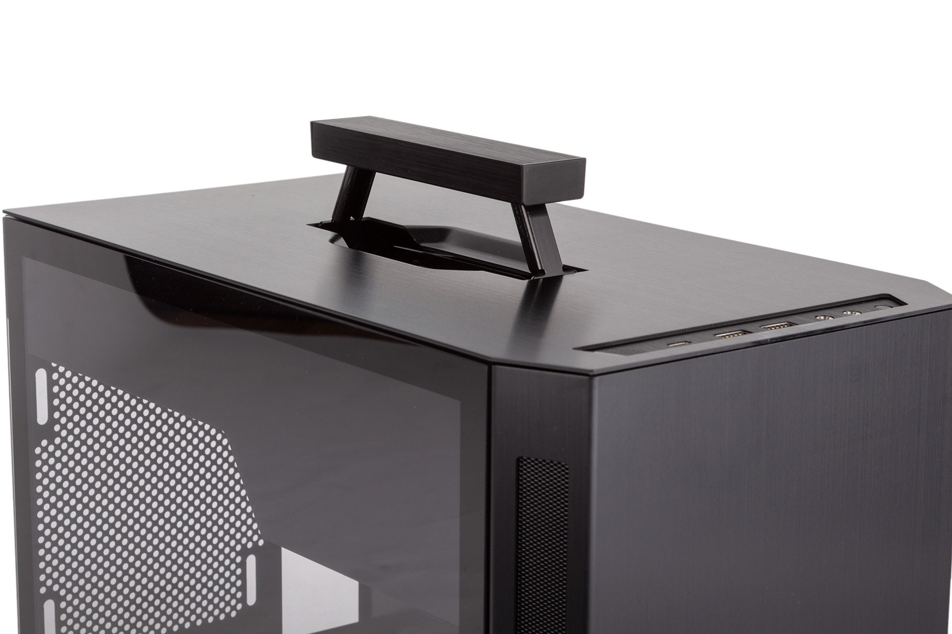 Lian Li and aluminium is a match made in heaven, and the TU150 continues to show that. The roof, front, and right side are each covered by a 1.5mm-thick aluminium panel. The subtle brushed effect looks great and is achieved using a water wash technique. With these panels joined by a 3mm-thick tempered glass panel on the left side, build quality here lives up to Lian Li’s reputation. The only real exception is that when you open and close the handle, a part of the case rattles quite obviously whenever it clunks into place. We weren’t able to identify exactly where this was coming from, and it was more obvious with the panels off, but we’d definitely prefer it to not happen at all. Luckily, even with three with fans running at full speed during our thermal testing, there was no perceivable rattle, so it shouldn't be an issue day to day.
