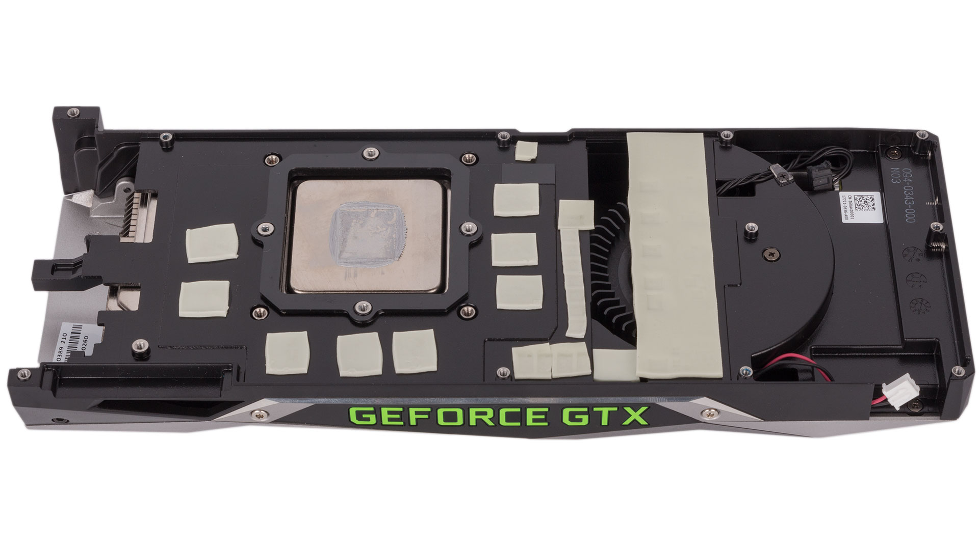 A copper baseplate connects to a vapour chamber for efficient GPU cooling, while a large metal surface area connects via thermal pads to the memory modules and critical VRM components. A single radial fan then cools the heatsink fins to which these contact surfaces are connected, with air being directed straight out of the rear I/O panel. It's actually the same cooler that's used on the GTX 1080 Ti Founders Edition, which is a 250W TDP GPU; Nvidia says the extra headroom will benefit overclocking.