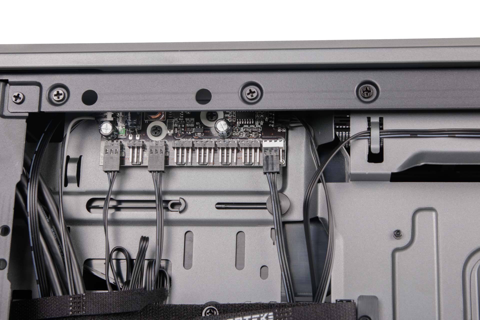 Also included is a seven-port fan hub with all included fans hooked up out of the box. Four ports are four-pin PWM while a fifth is able to accept a PWM signal from your motherboard and apply this to the rest of the hub, which is powered by a SATA connector. There's up to 48W of power available, meaning you can run pumps and fan splitter cables from the hub as well.