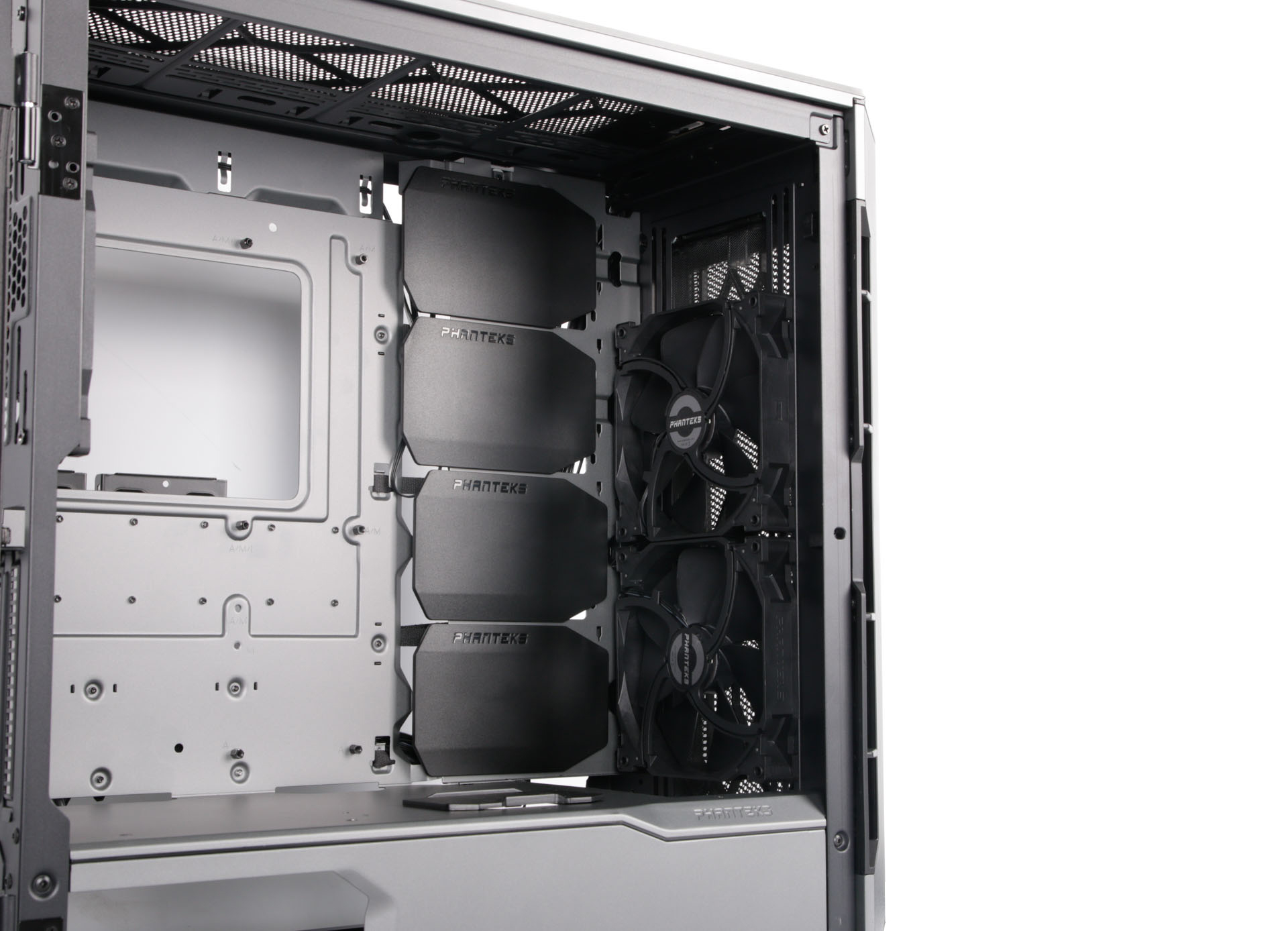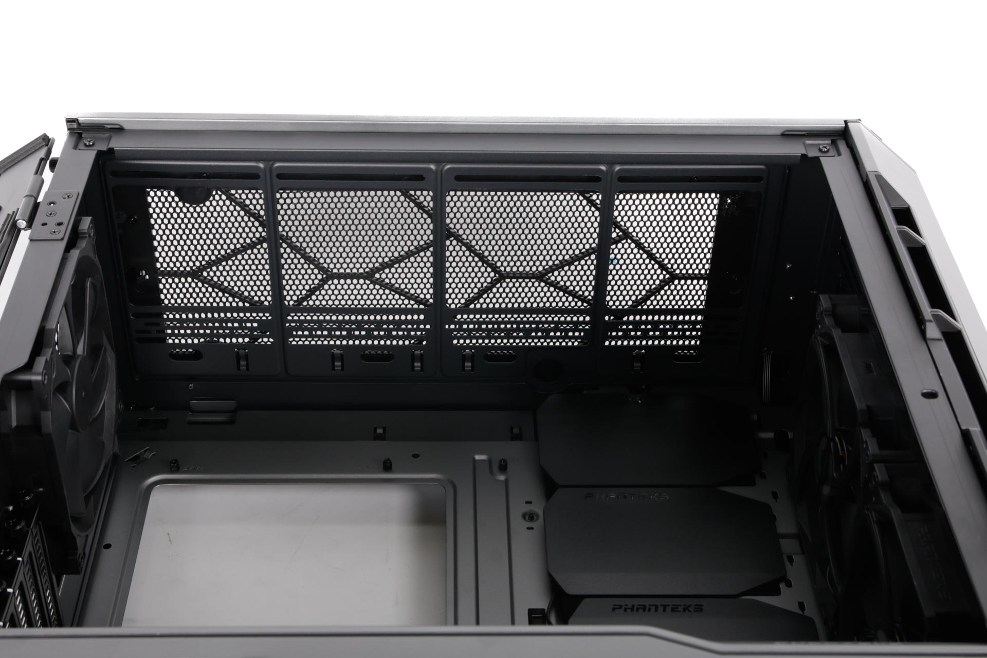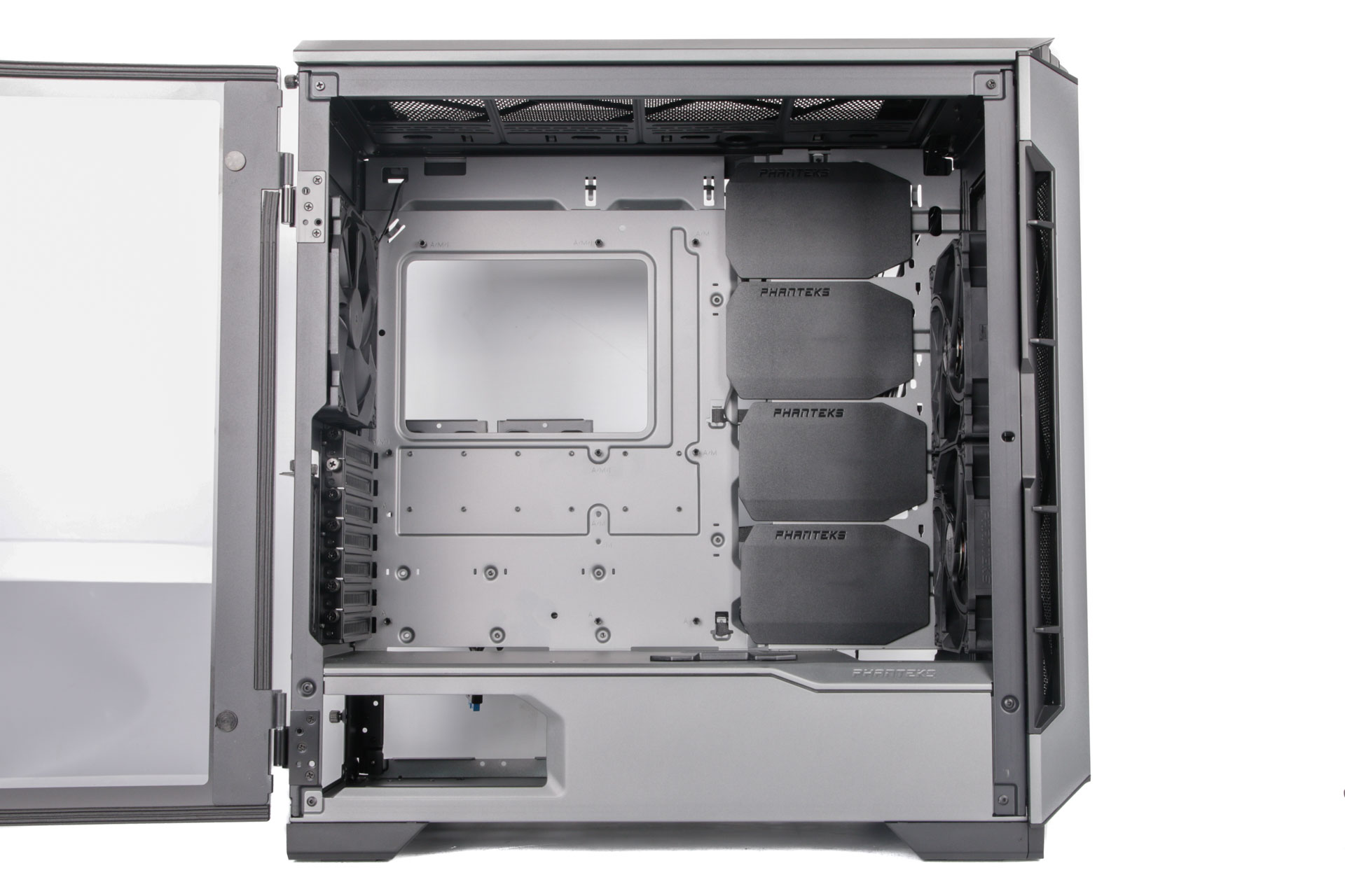 The front section includes a pair of 140mm fans as standard with trios of both 120mm and 140mm fan mounts, again supporting corresponding radiator sizes with up to 95mm clearance. You aren't left out in the cold as far as installing other water-cooling components goes either, as there are mounting points for Phanteks' pump bracket in the base plus reservoir mounting points behind those cable covers.