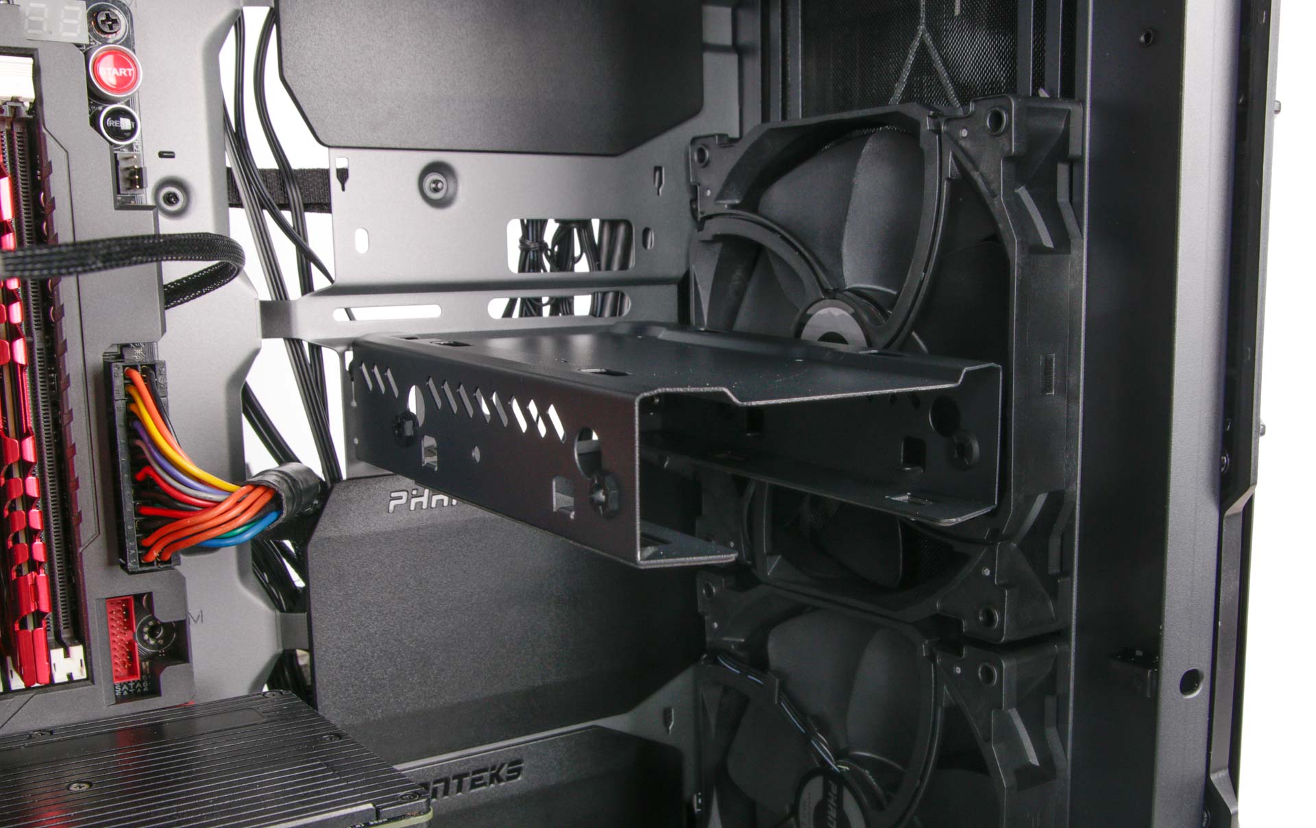 This is also where you'll find the dedicated 2.5" mounts, which come pre-installed, although you'll need a screwdriver to actually secure SSDs to the trays. Phanteks also pre-tidies the cables, so should you not be needing any of them, you won't have to do this yourself.
