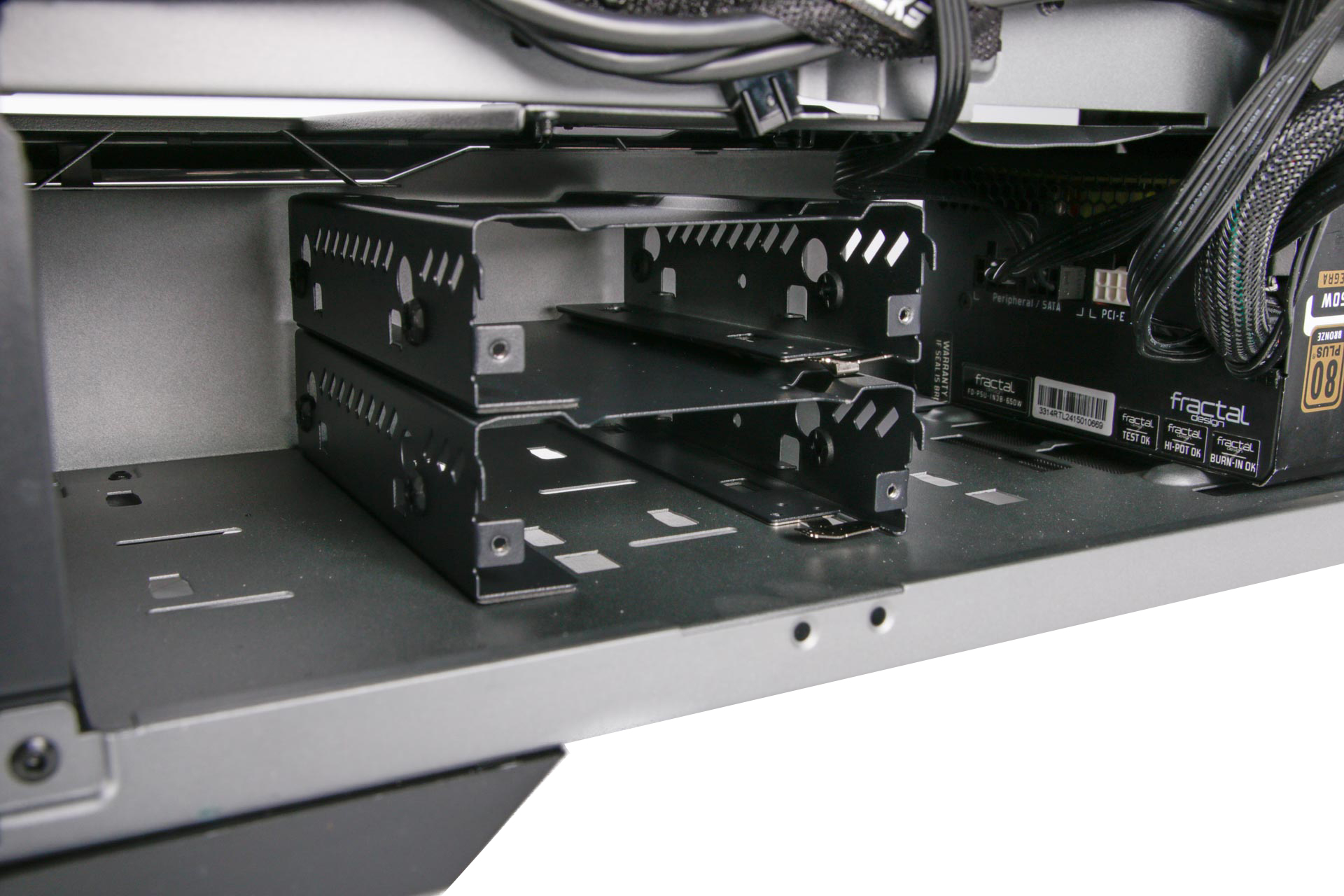 This makes way for the case's hard disk mounts, which come in the form of movable trays. Four trays are included as standard, and here they slot into small notches in the motherboard tray and are then secured using screws from the rear with space for six trays in this location.