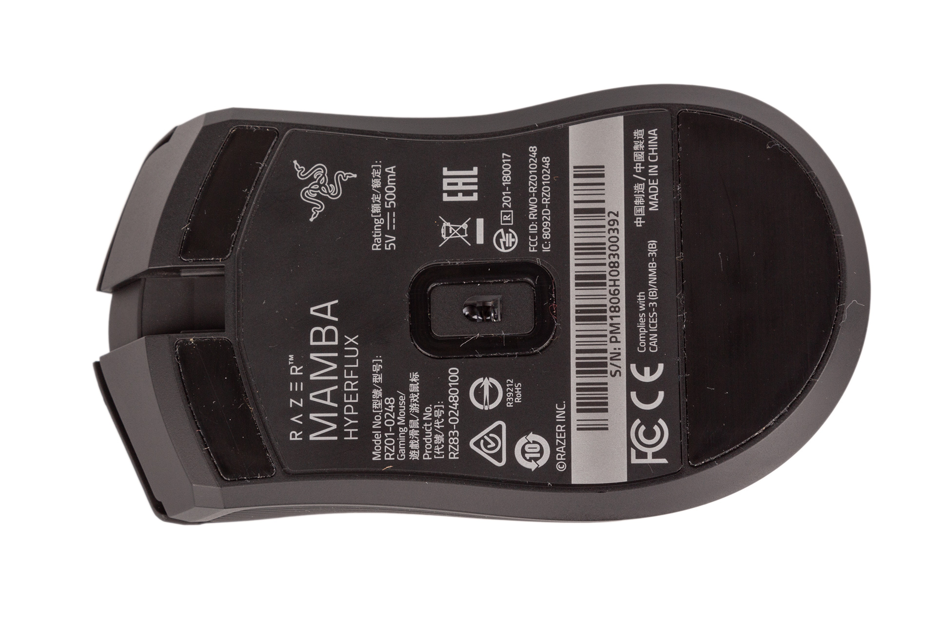 The benefit of not having a battery, though, is that you get a very light wireless mouse indeed; it tips the scales at 96g, which is 14g lighter than even the Logitech G903. This is likely to be one of the most appealing characteristics of the Mamba HyperFlux, and it did surprise me with how nimble and light it is, but crucially the plastic structure feels rigid. The mouse’s movement is aided by a large helping of PTFE on the underside for smooth gliding.
