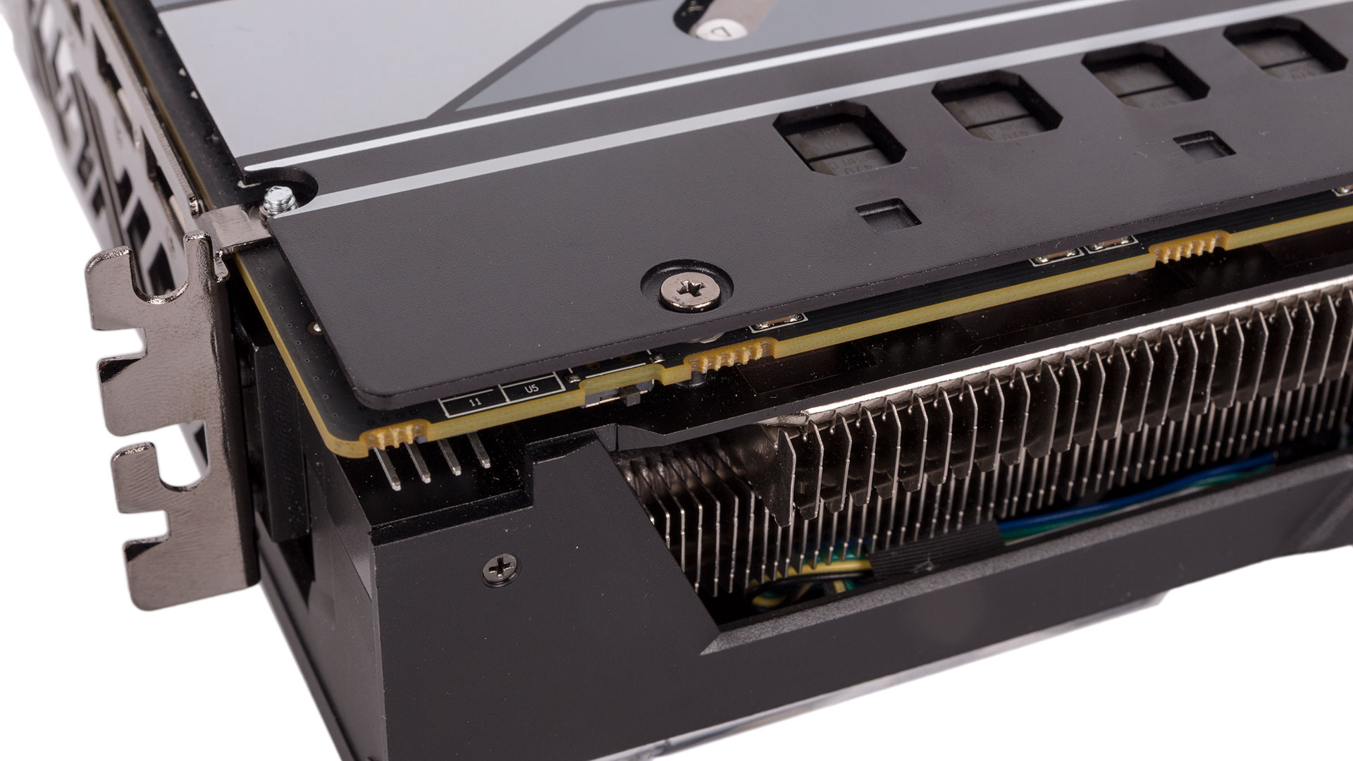 You might have noticed a four-pin fan header next to the BIOS switch, and this is part of Sapphire’s Turbine-X feature. A second header is found on the right side. Sapphire appears to have taken a leaf out of Asus’ book here, where the feature is called FanConnect II. Essentially, it allows you to connect up to two PWM-enabled system fans and have their speeds dynamically controlled based the graphics card’s temperature readings, which are taken from five temperature sensors located around the PCB. You cannot manually control them like you can with Asus, however.