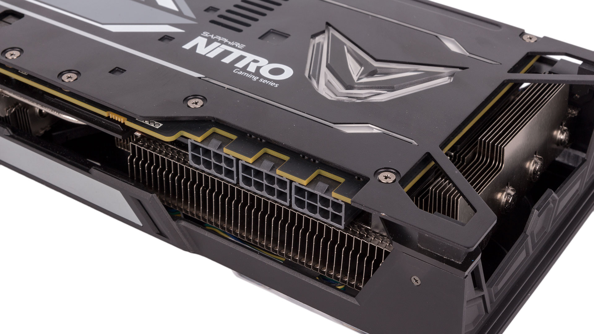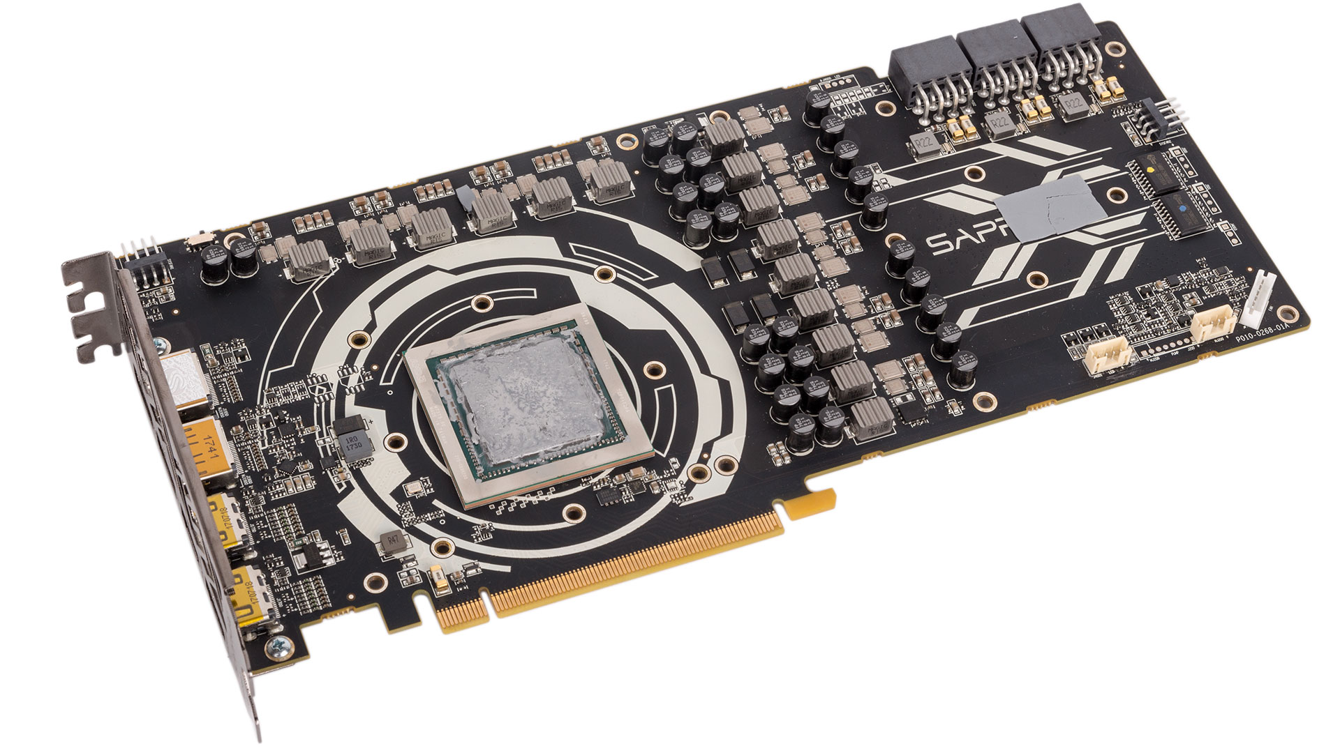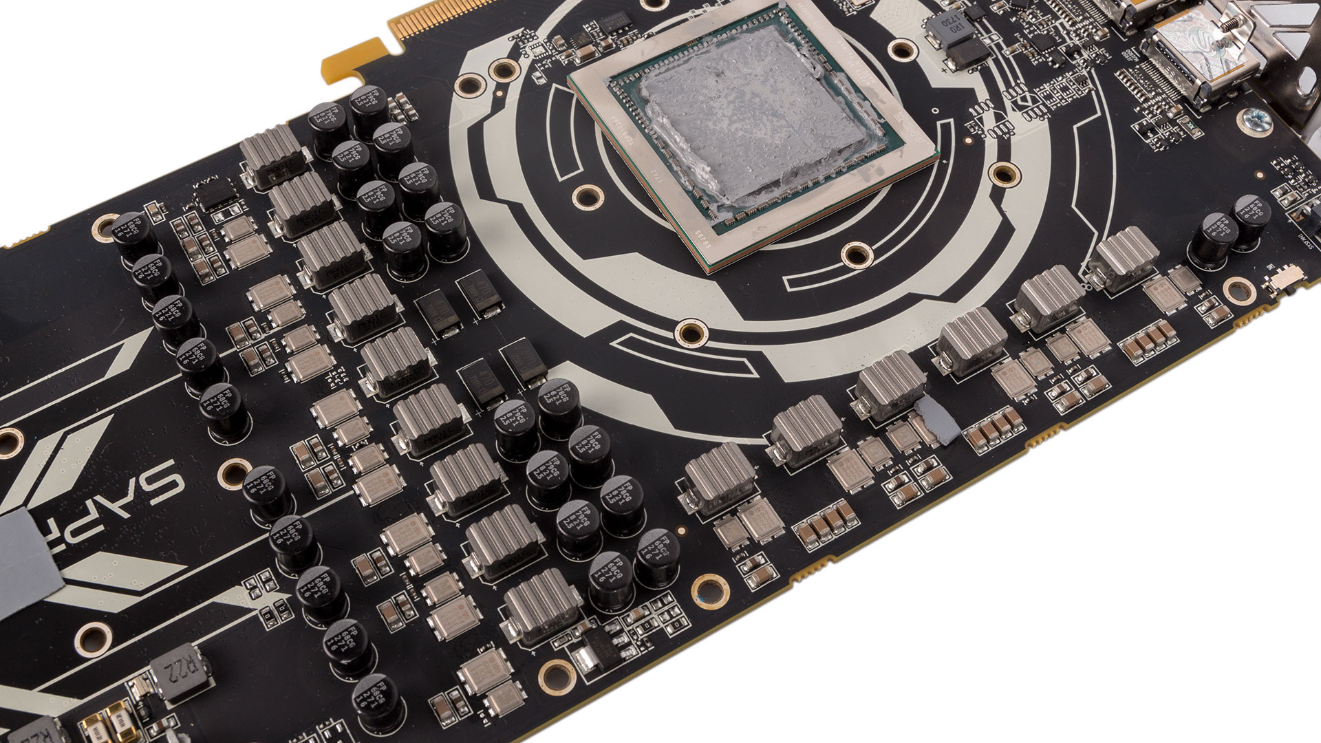 The fully custom PCB seems very well made, and Sapphire has clearly put some effort into it. The GPU is fed by a massive 14 phase power delivery system that’s digitally controlled. Sapphire also implements its Black Diamond chokes, which it claims run 10 percent cooler and 25 percent more efficiently than regular models. It also claims a 15 percent reduction in operating temperature for these chokes compared to its own previous-generation ones.