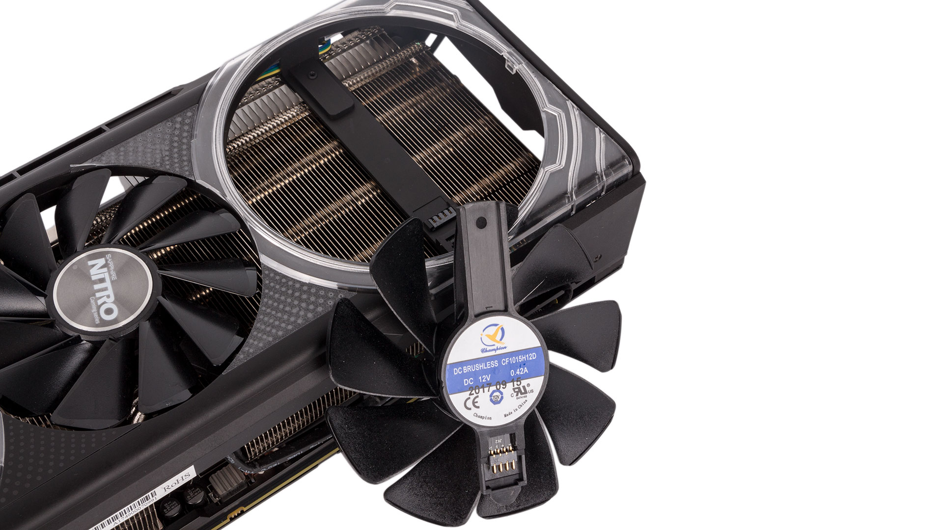 Cooling everything down is a trio of fans, hence the length of the card. The outer two are 92mm in diameter and spin anticlockwise, while the 80mm middle fan spins clockwise, achieving what Sapphire calls ‘optimal airflow’. All three fans sport dual ball bearings and use Sapphire’s Quick Connect 2 system which means they can be easily removed and replaced in the event of a failure. Precision fan control is a feature that Sapphire says keeps RPM variance down to three percent instead of the industry standard 10 percent, which should help to eliminate noise that stems from fans spinning at different speeds. Finally, the RX Vega 56 Nitro+ is semi-passive, so all three fans will remain off until the GPU reaches 55°C, and they’ll turn off again when it comes back down to 50°C.