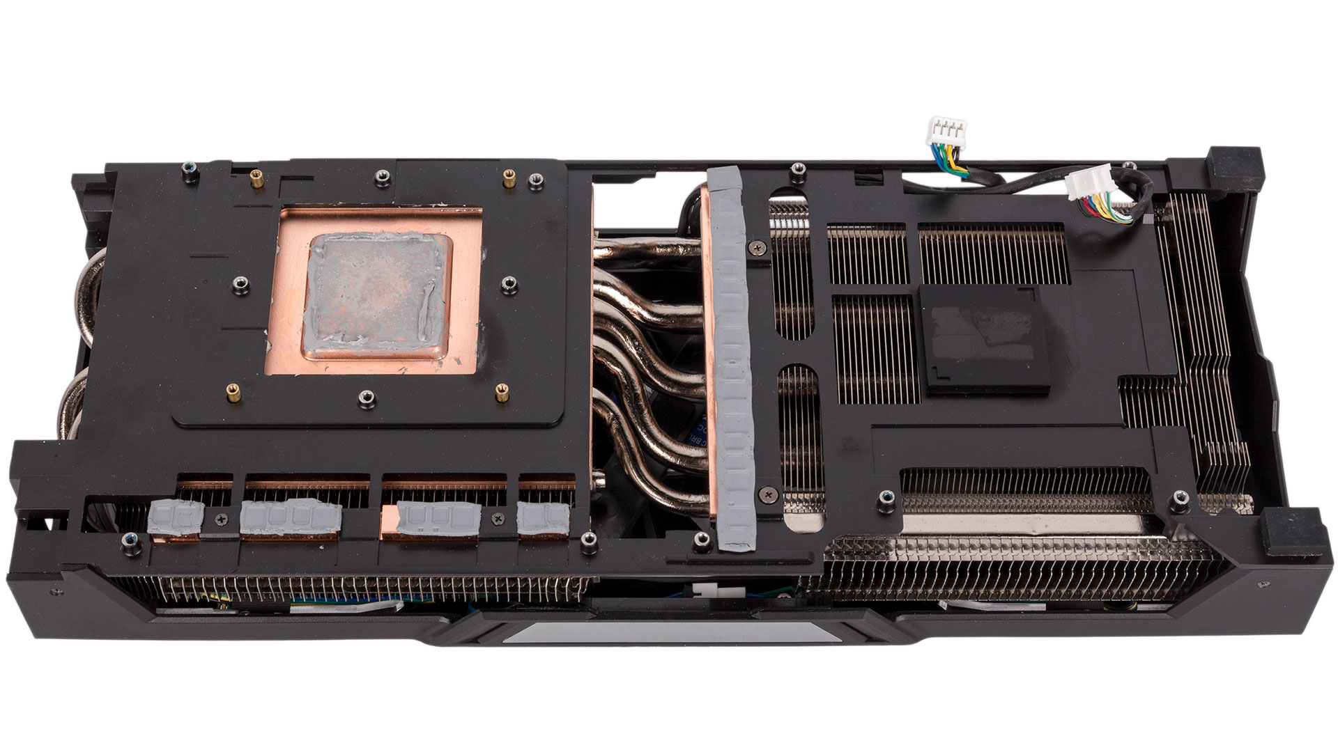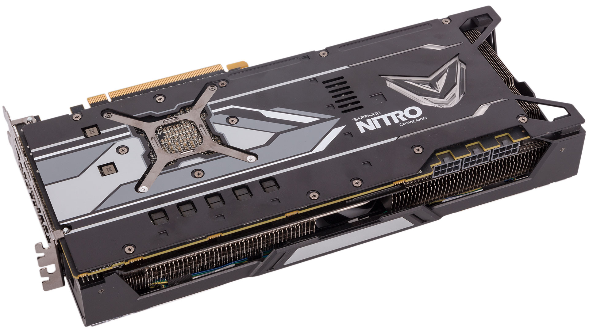 With these new Nitro+ models, Sapphire offers what it calls its ‘most efficient cooling to date’. Cooling the massive heatspreader that sits atop the GPU and HBM2 memory dies is a copper vapour chamber – first used by Sapphire in its Vapor-X cards – that transfers heat to the two separate fin stacks via six heat pipes (three 6mm, three 8mm). The vapour chamber and heatsink are also connected to other critical components by a large metal contact plate and thermal padding, and even the backplate gets involved with a bit more thermal padding on the back of the MOSFET areas.