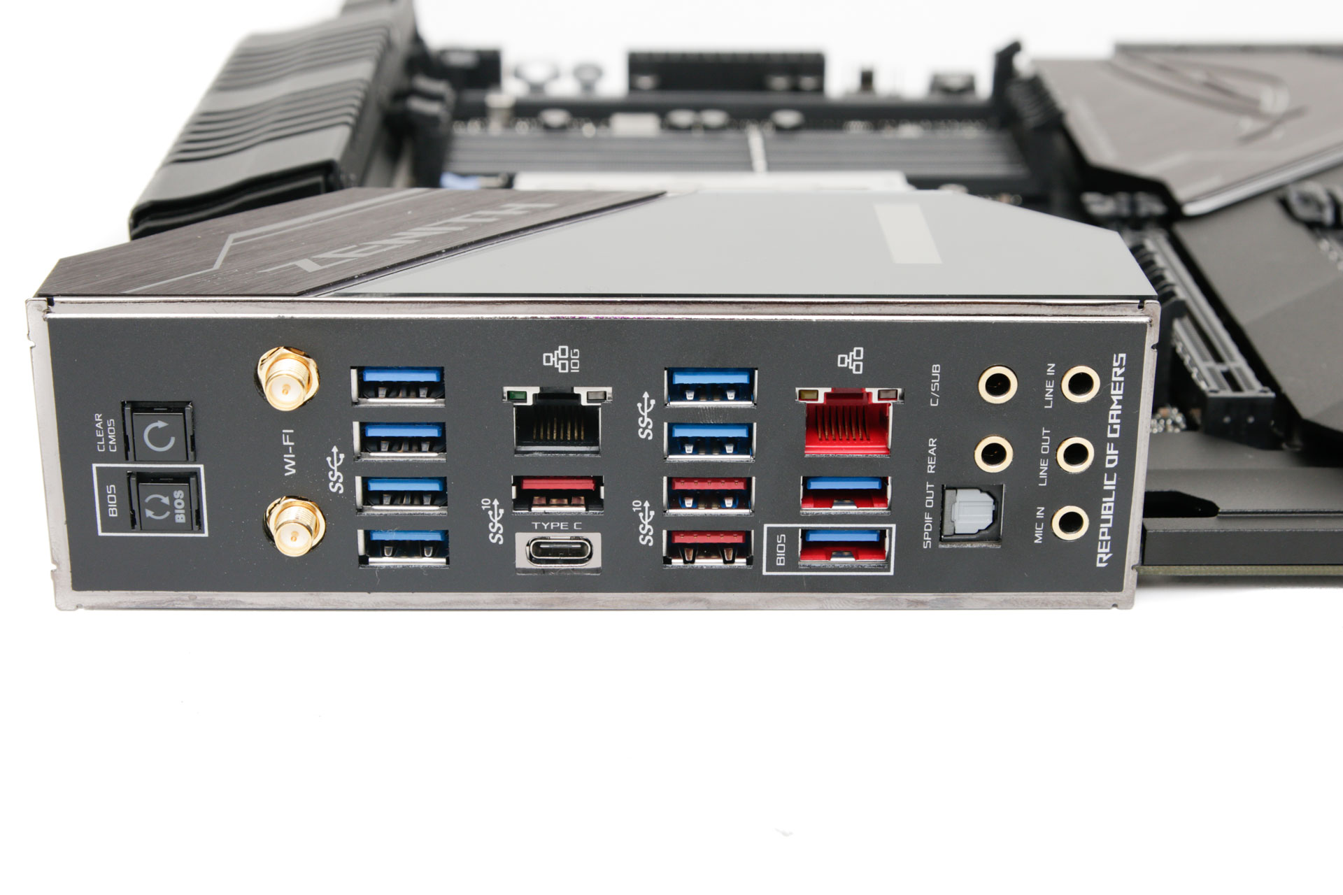 The original Zenith included a 10 Gigabit LAN card, but here the Aquantia 10 Gigabit controller is embedded onto the PCB, so the port is now located on the I/O panel next to the Intel Gigabit controller. It's certainly something professionals will benefit from, so in terms of accessories the toss-up here is between the MSI MEG X399 Creation's M.2 expansion card and the Asus offering here of 10 Gigabit LAN and the fan-expansion card above. The I/O panel is where you'll find the USB BIOS Flashback button and CMOS clear button, while you get three USB 3.1 Type-A ports plus a further eight USB 3.0 ports as well as ports for the aerials for the onboard 802.11ac Wi-Fi.
