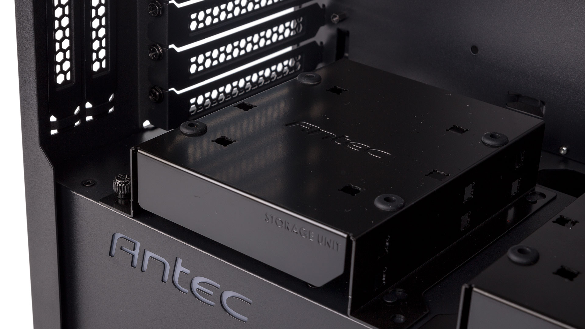 Atop the PSU cover is a pair of metal drive trays, each held in place with its own thumbscrew for easy removal. You can install a single 3.5” inside each one, and some rubber mounting bits are supplied separately in the screw bag. You can also mount a 3.5” or 2.5” drive on top one each one, and again grommets (this time pre-installed) will help dampen vibrations from the larger type. If you're worried about these trays eating into expansion slot space, the case has eight rather than the regular seven, so normal ATX setups are fine unless you're using a dual-slot card in the lowest expansion slot.
