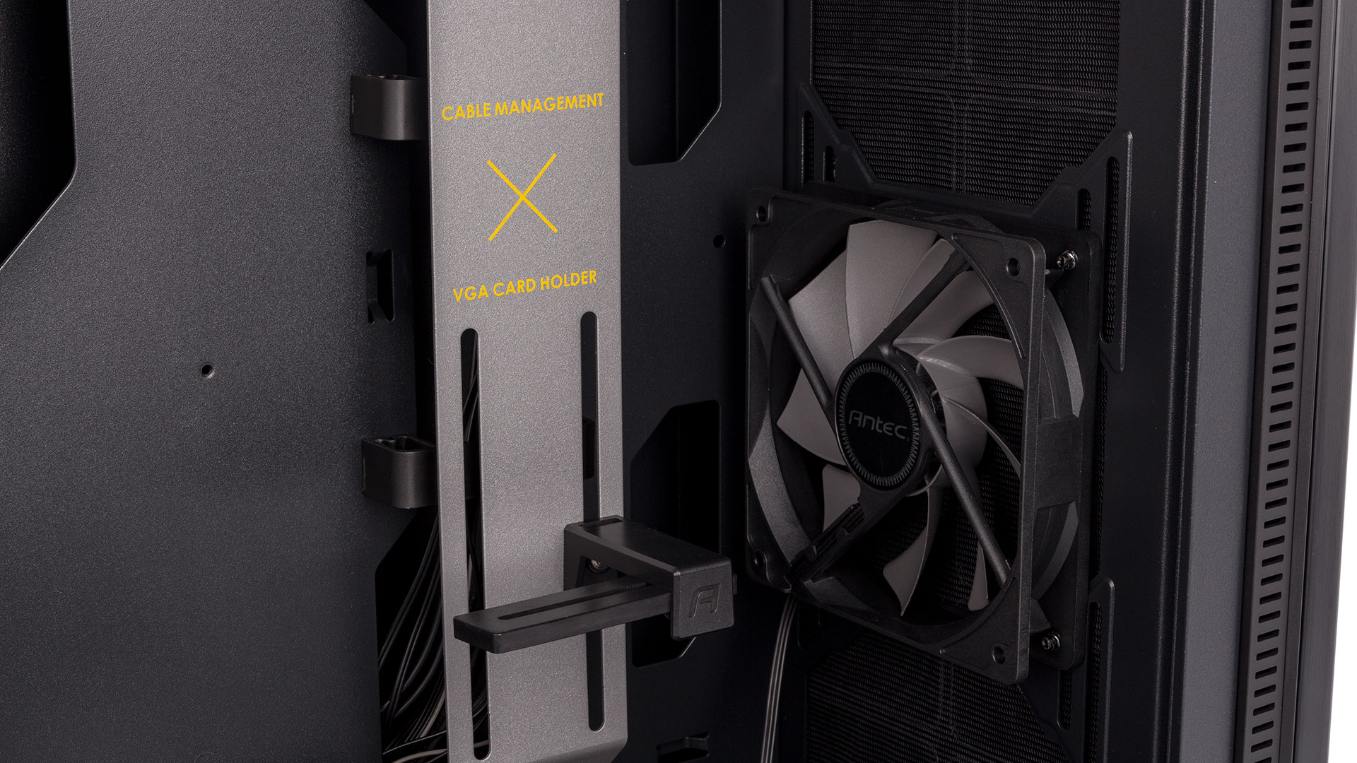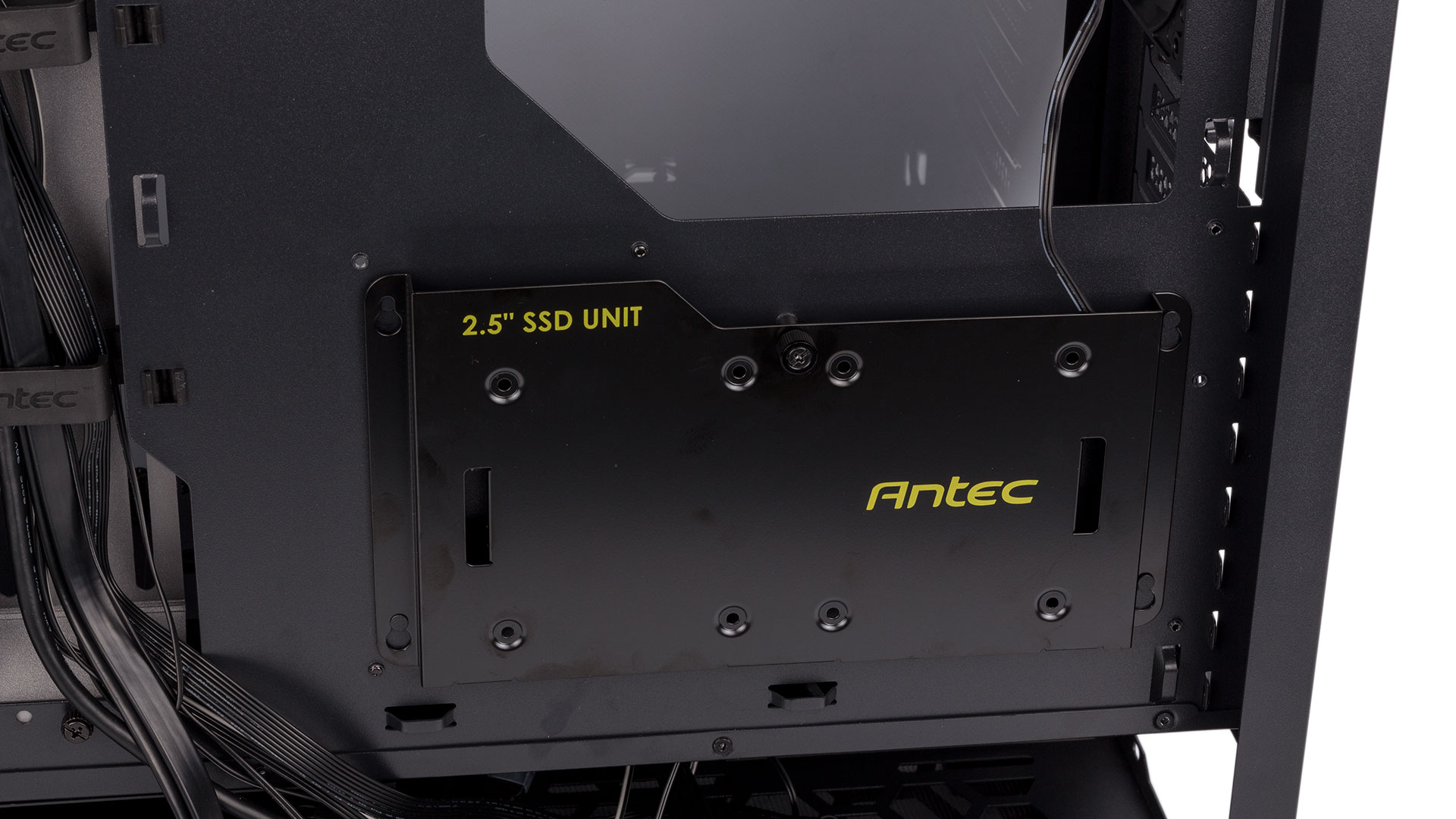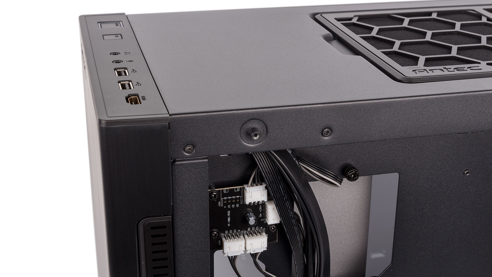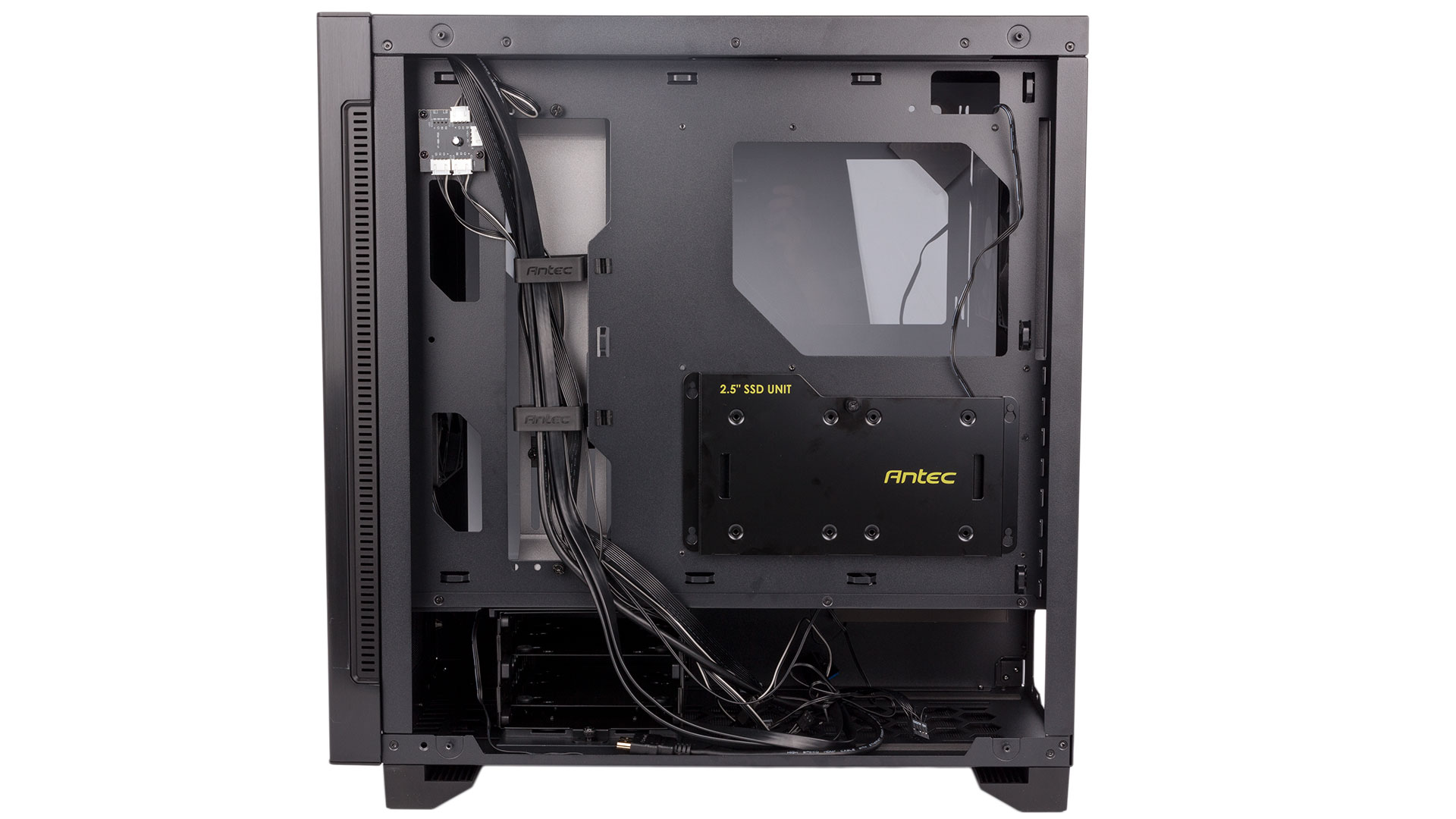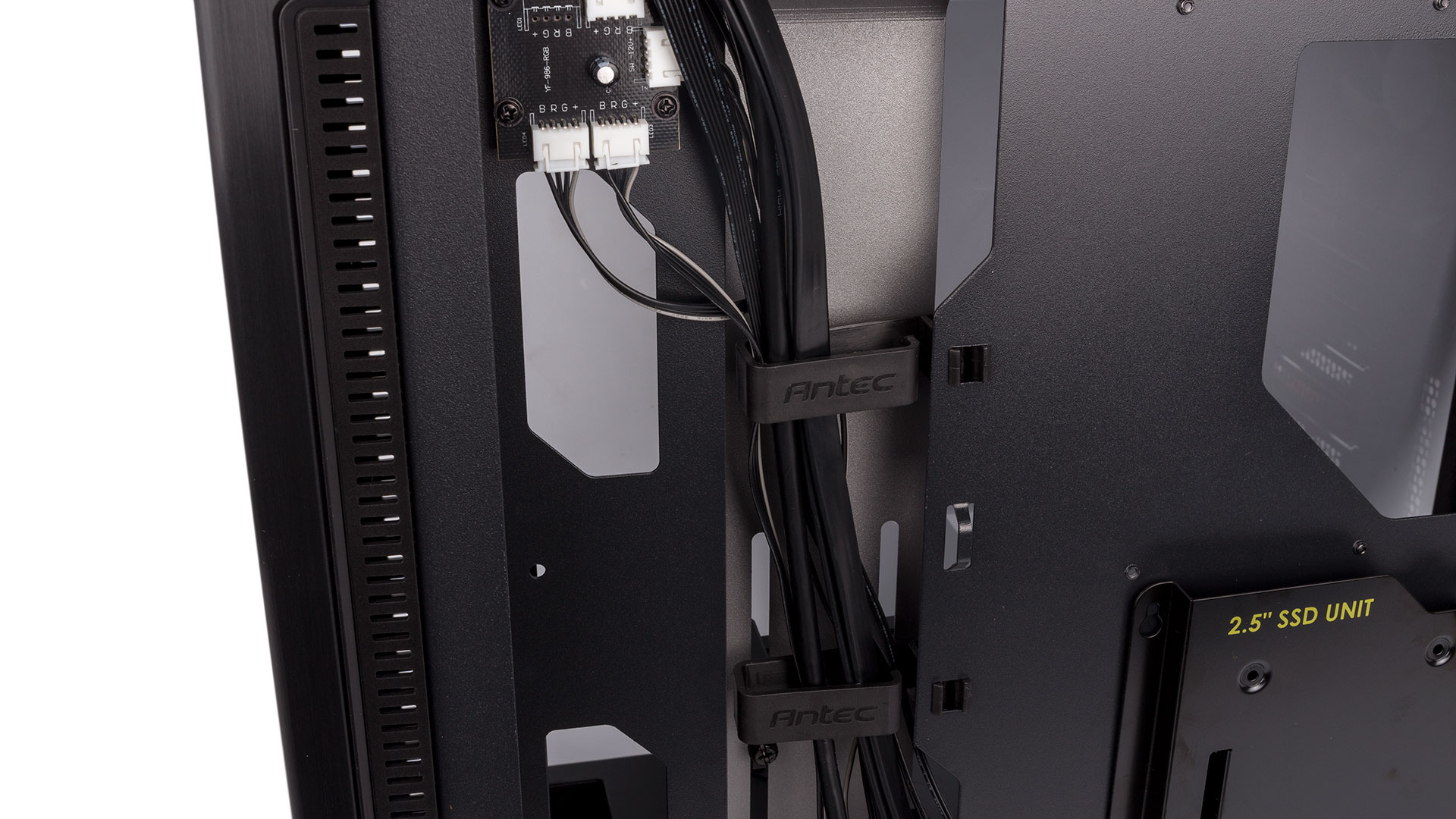 The rear of the aforementioned cable management bracket forms a deep channel through which to route the bulk of your cables. The plastic clips need work, though, as they don't lock shut, which means that stuffing a lot of cables in will just cause them to open up under the pressure, somewhat defeating the point. That said, they're still useful. A large hole above the motherboard lets you route the CPU power cable through, although we do think a hole for PCIe cables in the PSU shroud would be handy as well. We do wish Antec would have used SATA instead of Molex connectors for the lighting, too; you'll need two, one for the white shroud logo and one for the RGB hub that links to the front-facing logo.