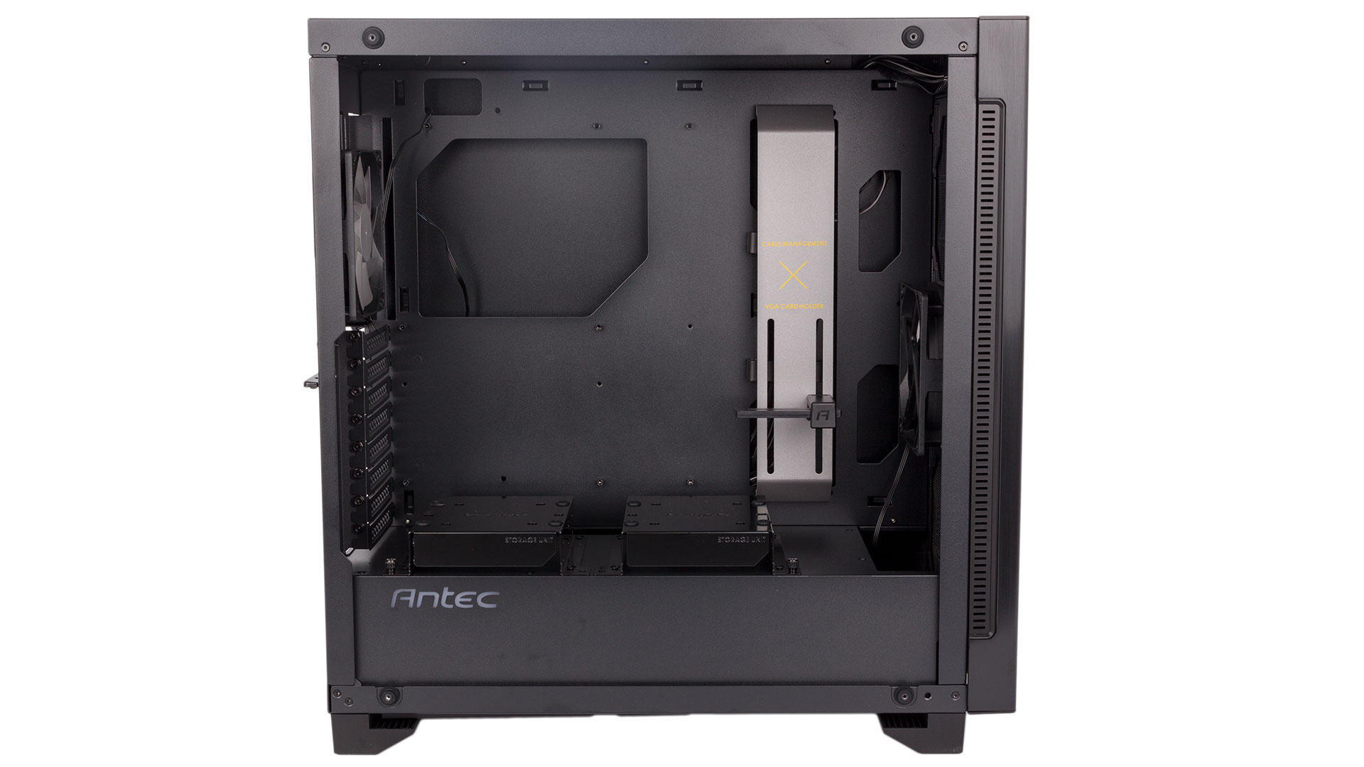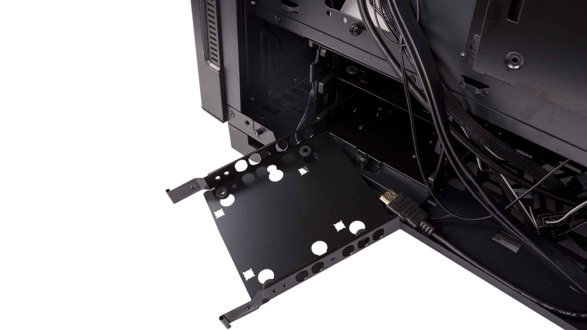 Moving to the other side of the P110 Luce, we find a metal 2.5” bracket fixed directly behind the motherboard tray and secured with a single thumbscrew. Finally, a two-bay HDD cage sits near the front, supporting an additional two 3.5” drives for up to six in total – more than enough, even for a high-end build. Pleasingly, the trays are again made of metal and have rubber grommets to quell vibrations.