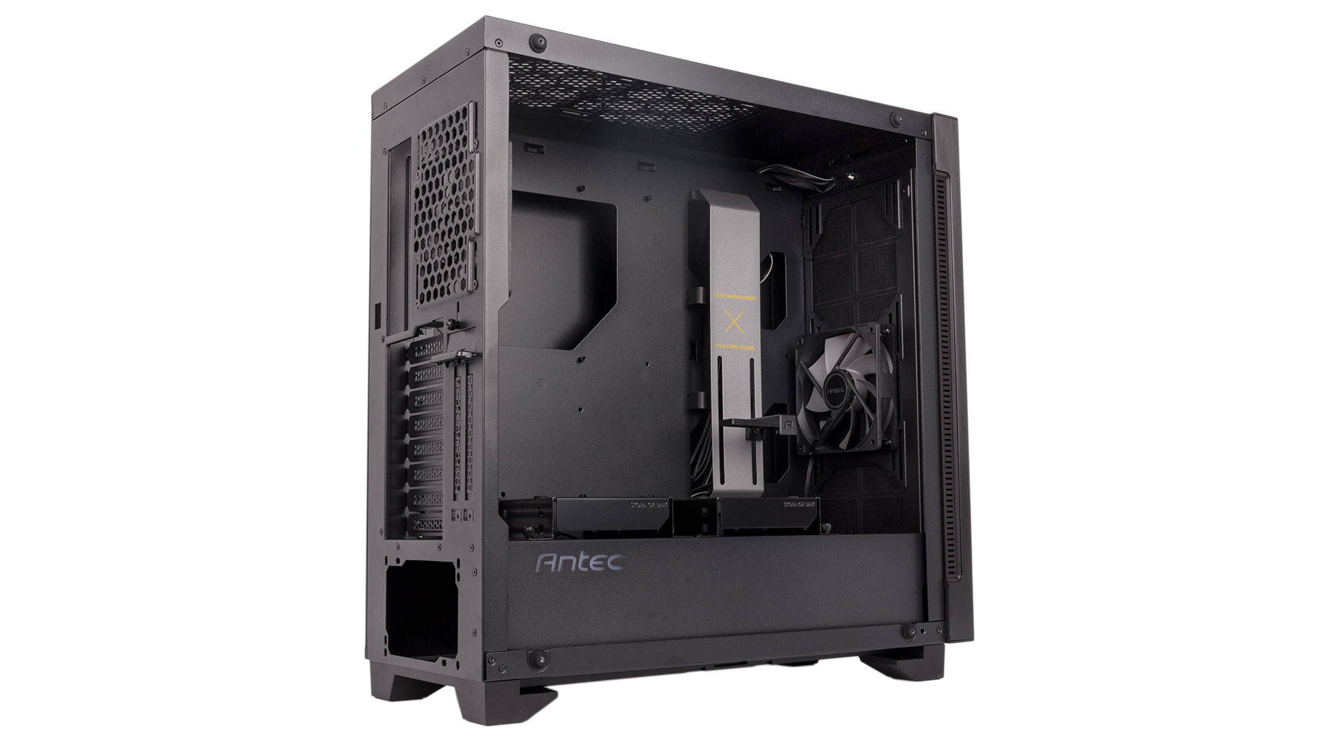 As is tradition, the tempered glass side panel is fixed in place with four thumbscrews, although interestingly Antec has opted for the same method on the steel panel. This is a little fussy, but it is preferable to a cheap notches and rails system, and it makes it easier to get the panel on if you have cables pushing against it, although a hinged mechanism would be even better.