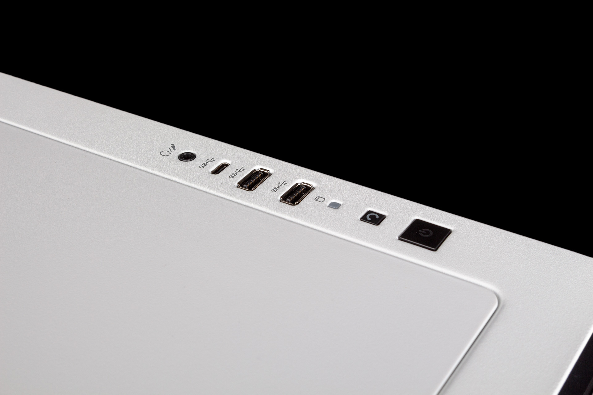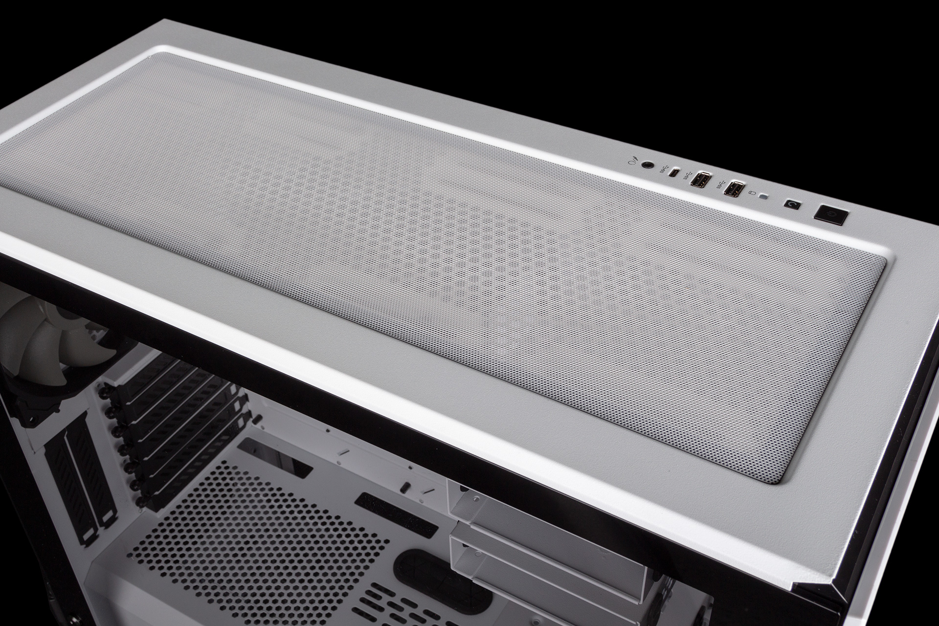The I/O panel is found on the roof, which is fine for a case this size. It includes both a pair of USB 3.0 ports and one of the newer USB 3.1 Type-C connectors – works for us! Corsair also uses a single 3.5mm jack with for combined headphone/microphone duties. There is no integrated RGB lighting with this case, so there’s no need for any controller on the I/O.