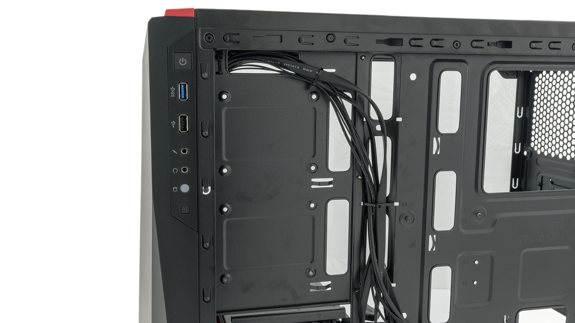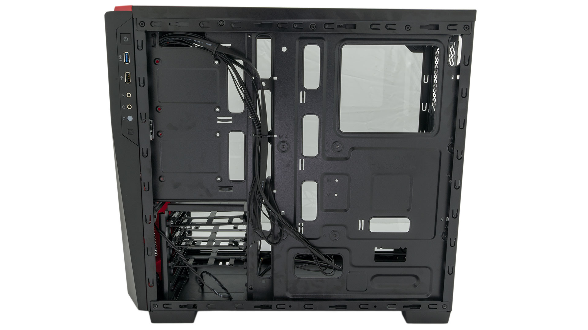 With very little space above the motherboard, there isn’t even room for a routing hole for the EPS cable. This again makes the case feel dated, as you’re forced to trail the cable across your motherboard – not ideal when the tempered glass leaves everything on show. The other cable routing holes are a little on the small side and have no grommets, while cable ties are your basic zip variety rather than Velcro ones. The extruded side panel definitely helps, but some of the thicker power cables were still pressing on the bottom of the panel (where it isn’t extruded). You can do a better job than we did if you take the time with this case, but you still won’t achieve as clean a build as those cases that include PSU shrouds.