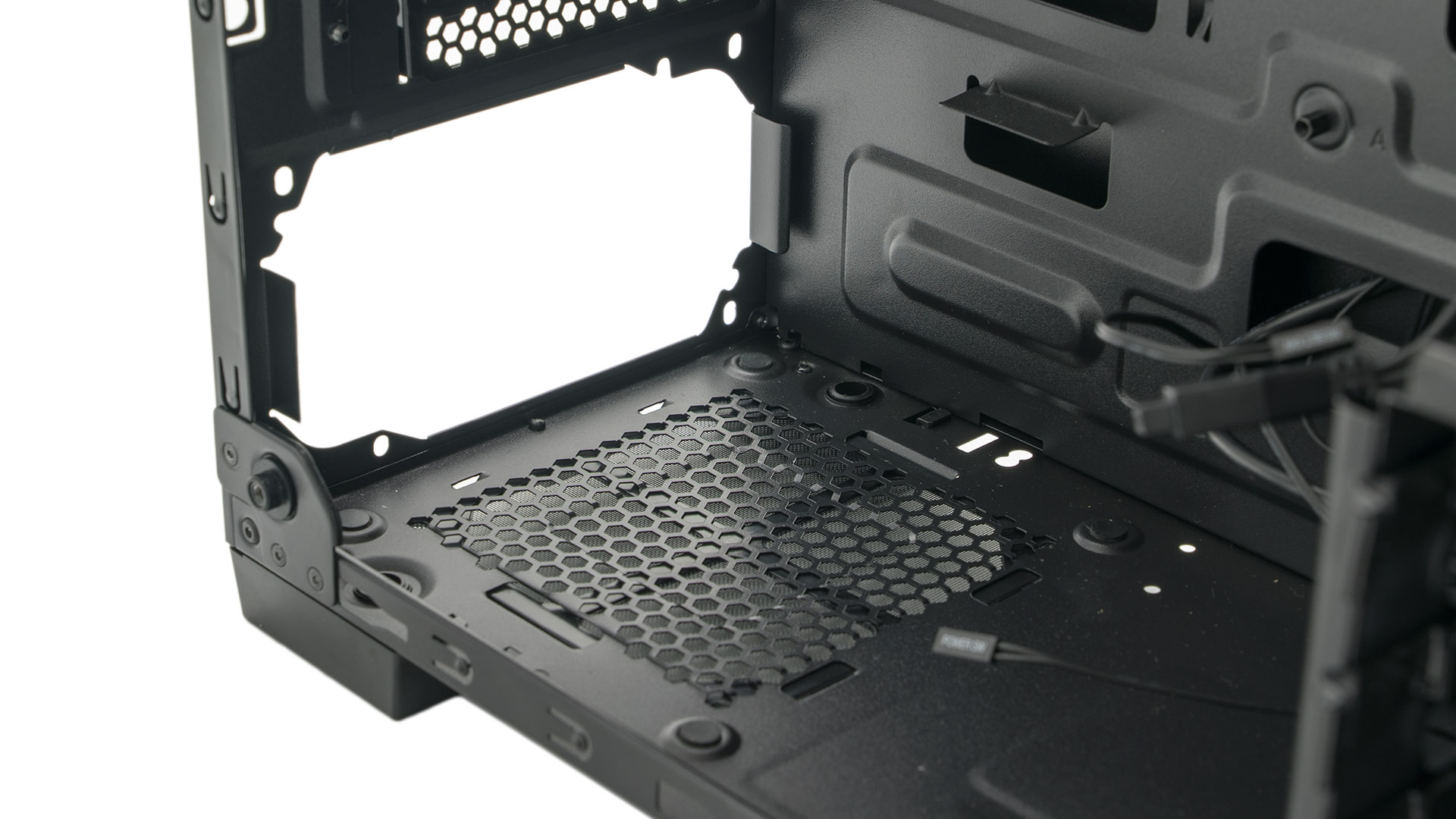 The Spec-04 Tempered Glass also has a pair of dedicated 2.5” mounts built into the front of the elongated motherboard tray. These are not trays, however, but merely mounting holes, so it’s a bit fiddly holding the drive on one side and screwing it in from the other.