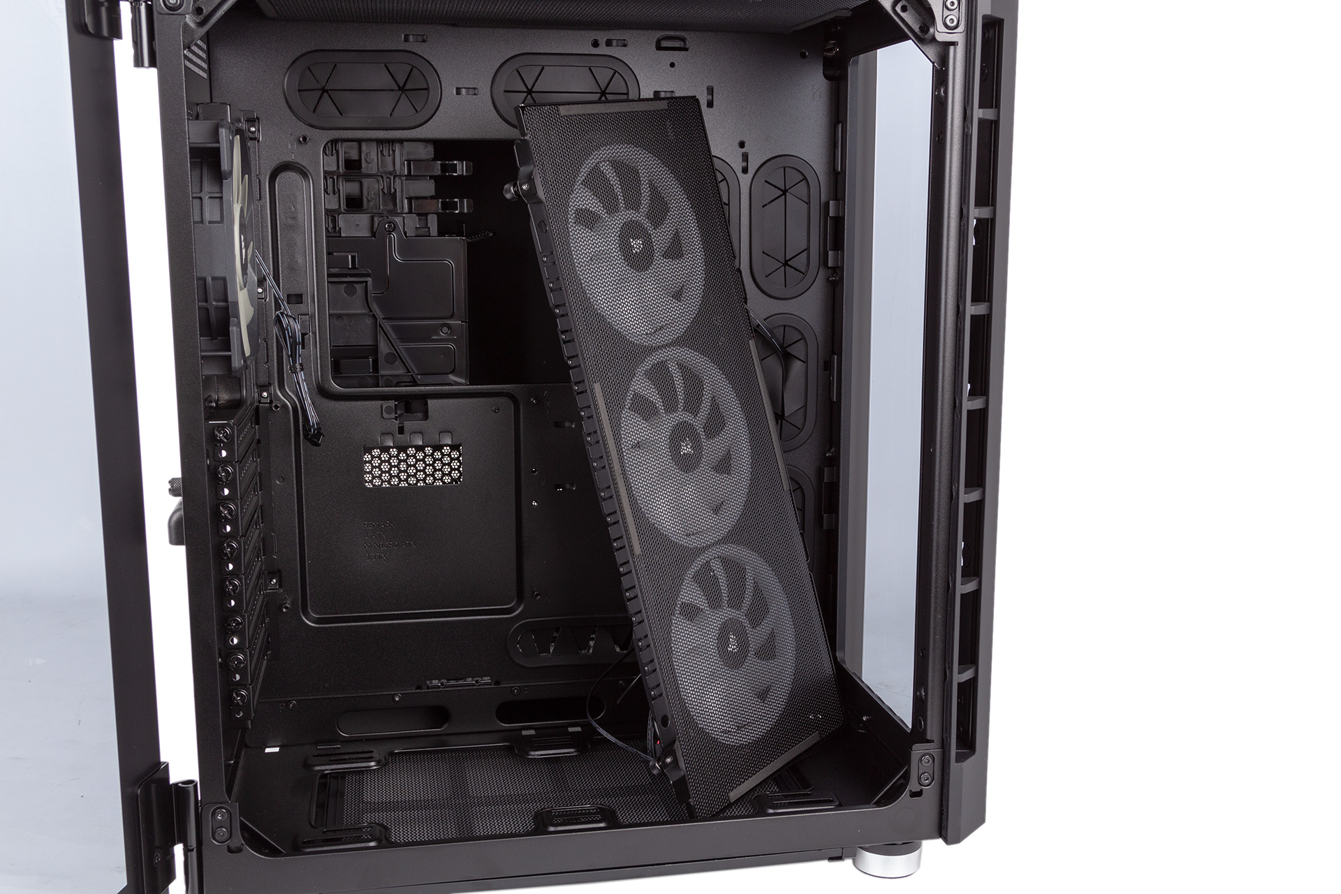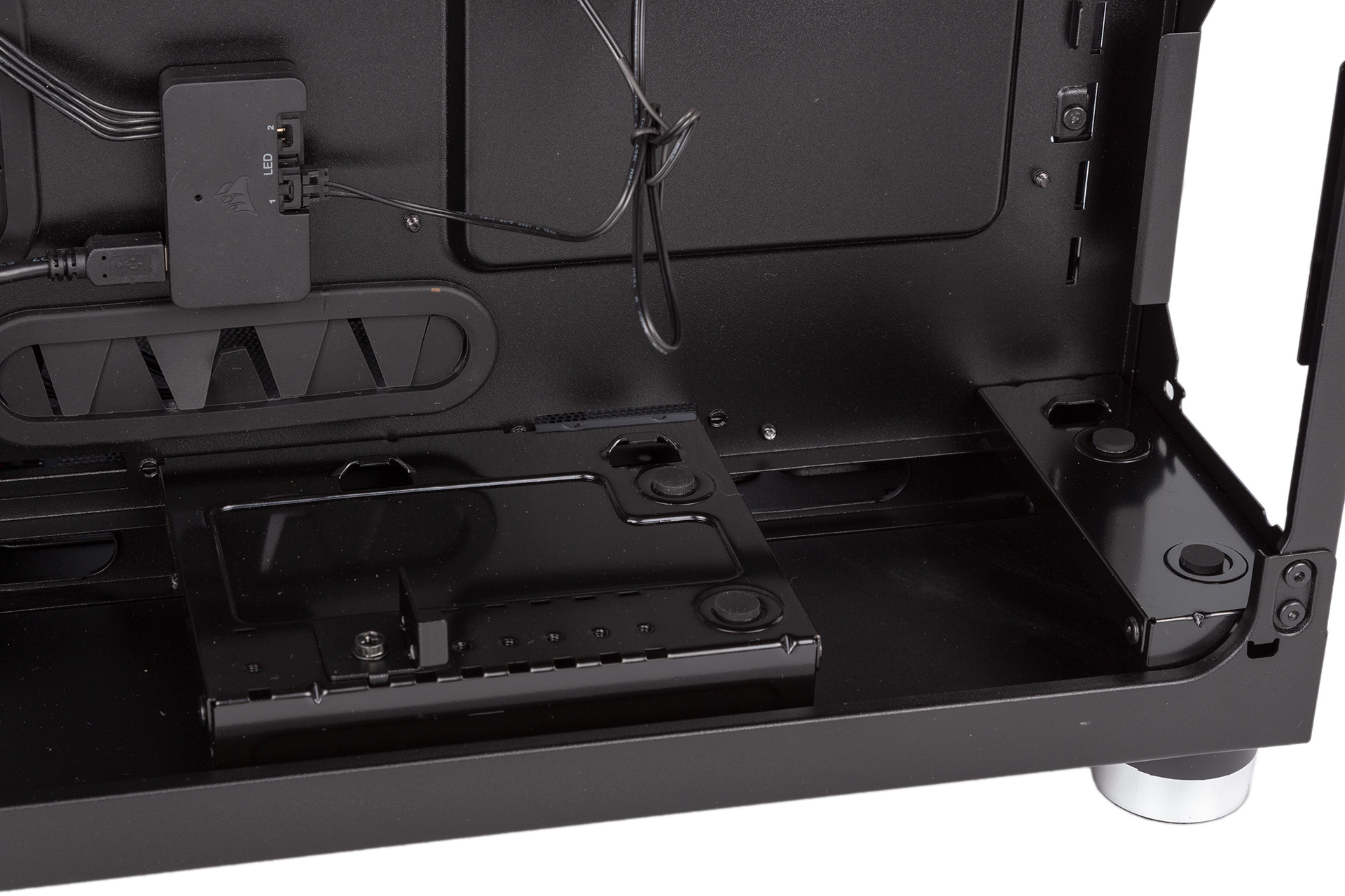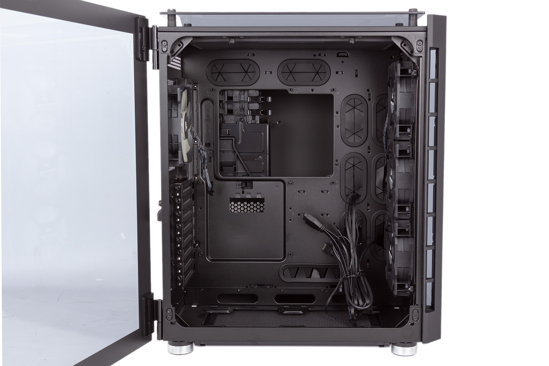 The dual-chamber design, whereby the main components are shown off on one side and less sightly ones are hidden out of view along with cables on the other side, is tried and tested by Corsair, and it works just as well here.