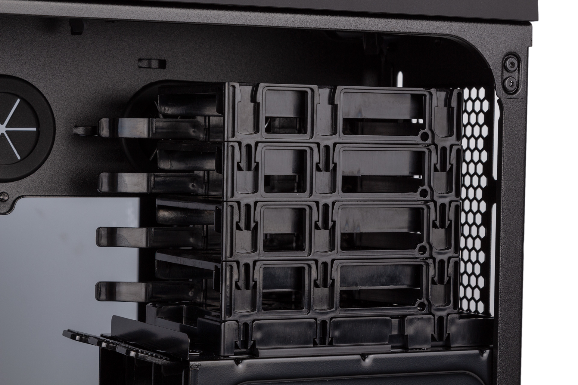 Above this you have the two drive cages, one capable of accommodating three 3.5” or 2.5” drives and one dedicated to 2.5” SSDs with four mounts available. The trays on the former are plastic and flimsy, but they’re easily removable and have pins to secure HDDs tool-free as well as rubberised sides to absorb vibrations. The SSD cage is again plastic, and the basic locking arms here don’t do a very convincing job – we’d be worried about SSDs coming loose in transit.