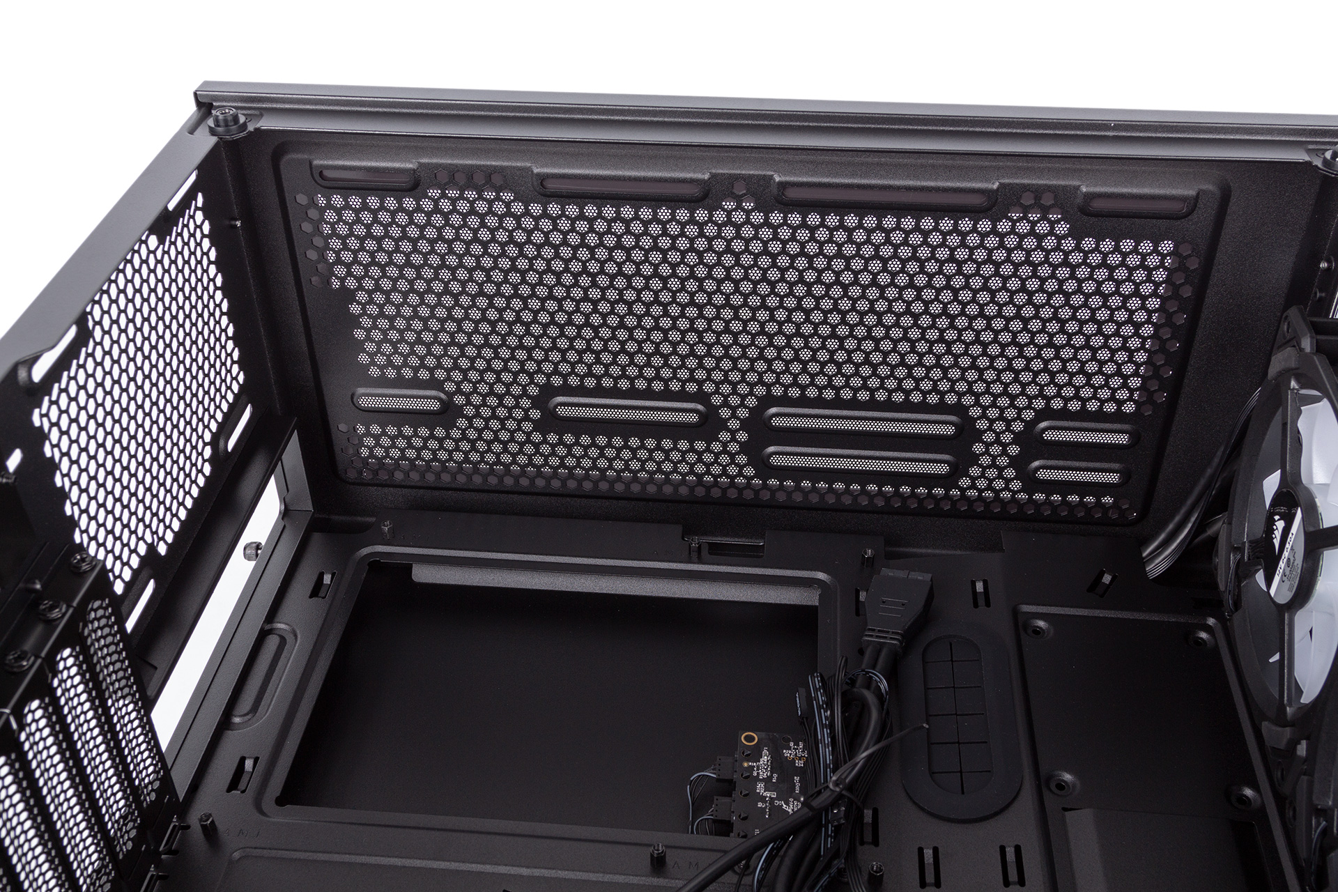 While not primarily designed for water-cooling, Corsair would be remiss not to include some level of radiator support given its large all-in-one product family. Indeed, 360mm and 280mm radiators are both supported up front, and there’s up to 35mm of depth available behind the front fans thanks to a cutout in the PSU shroud (HDD cage removal may be necessary). The roof is more limited, but 240mm radiators can still be installed here.