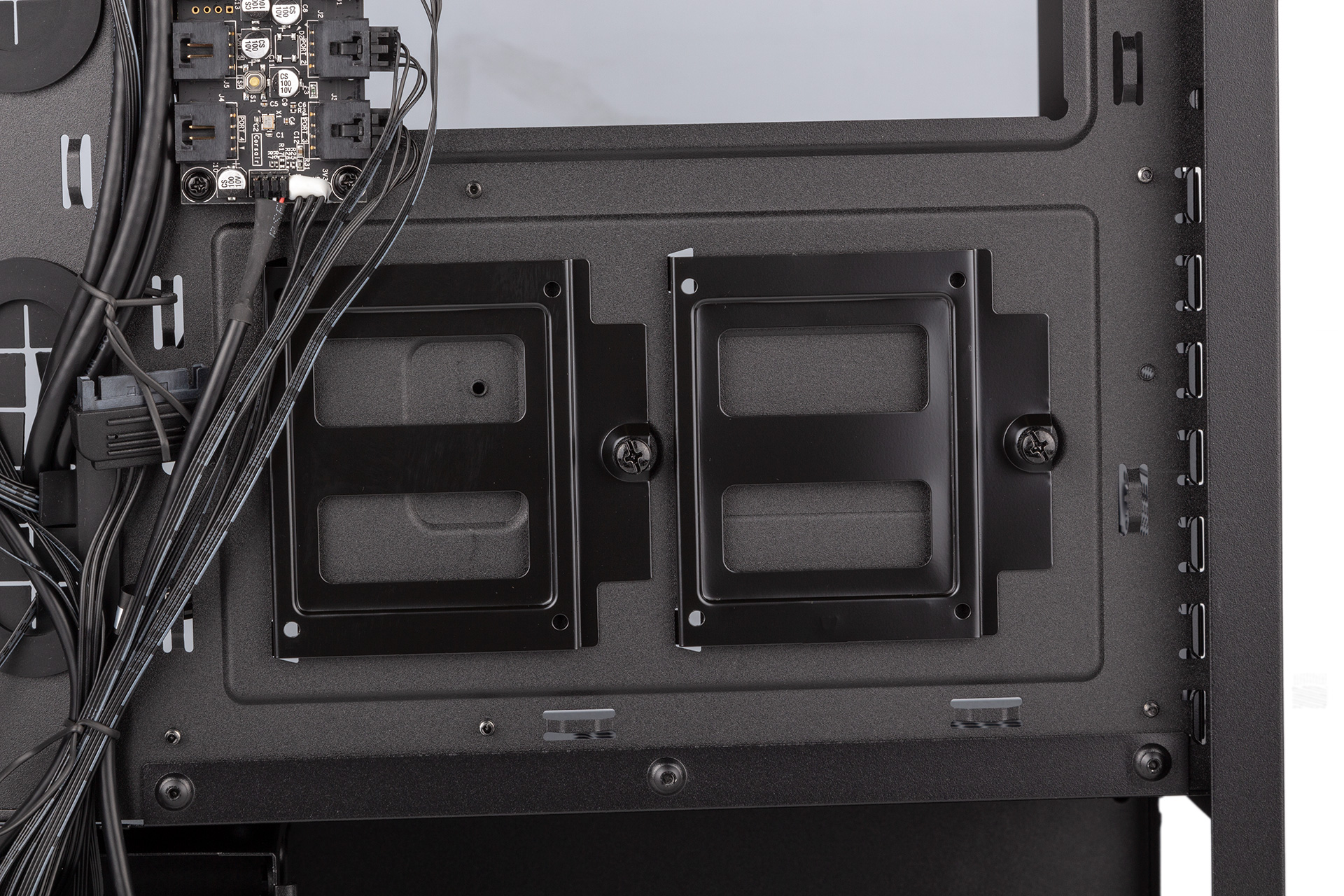 There are four dedicated mounts for 2.5” SSDs. Two are directly behind the motherboard in the form of individually removable metal trays, each held in place with a captive thumbscrew – nice and simple. The others screw directly into the front portion of the elongated motherboard tray. They’re designed to face away from the glass, but it shouldn’t be too difficult to display them in the main chamber if you wished.