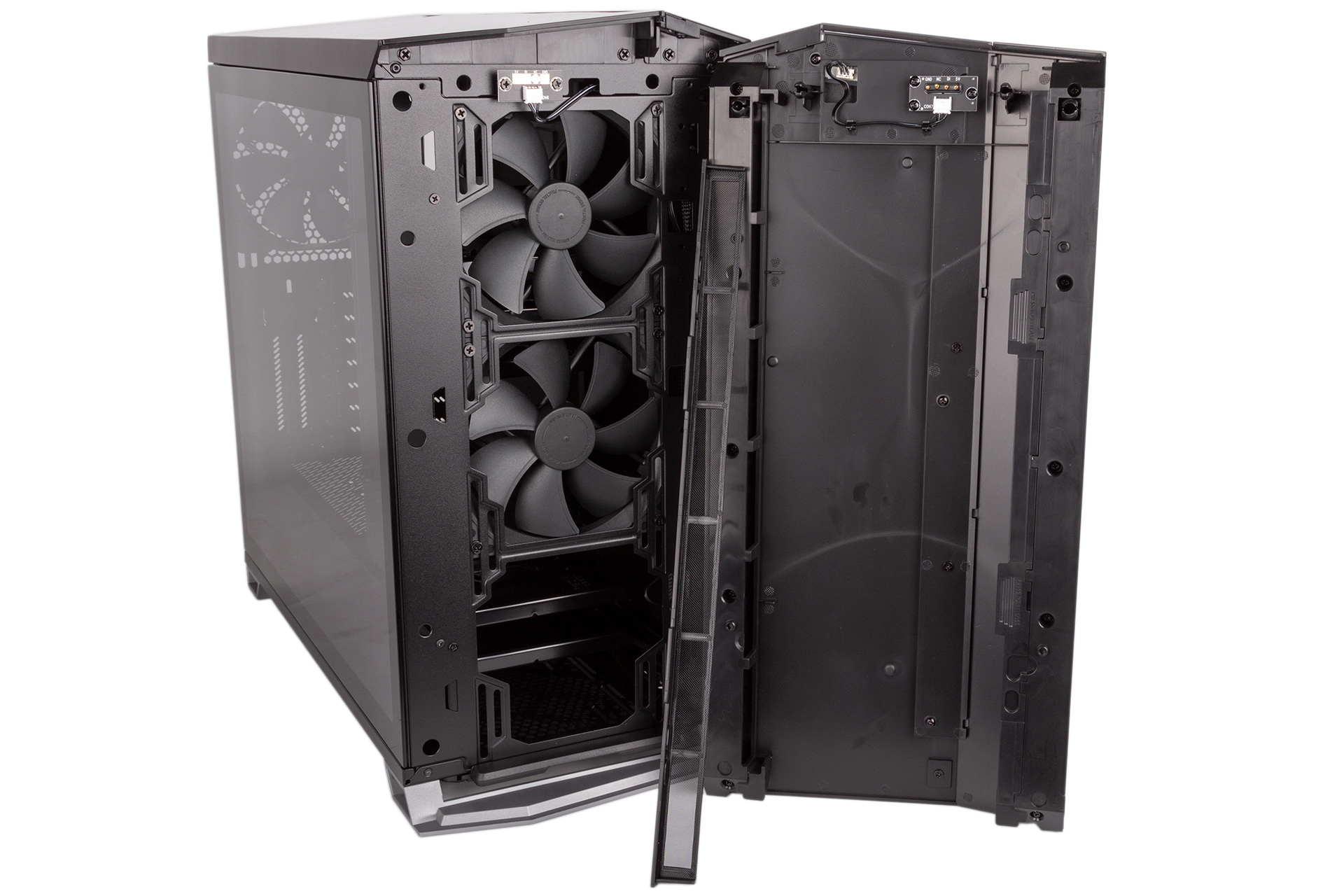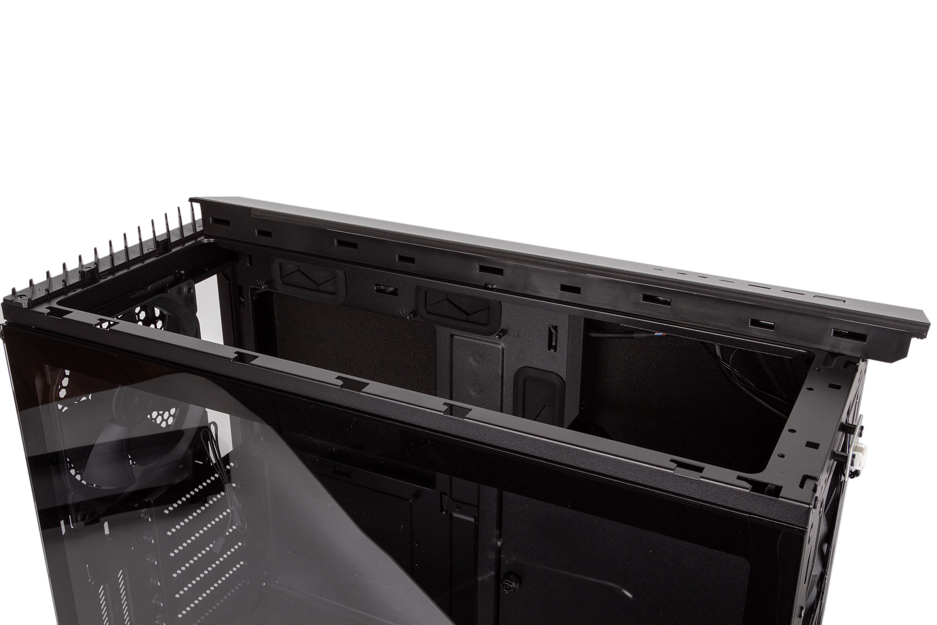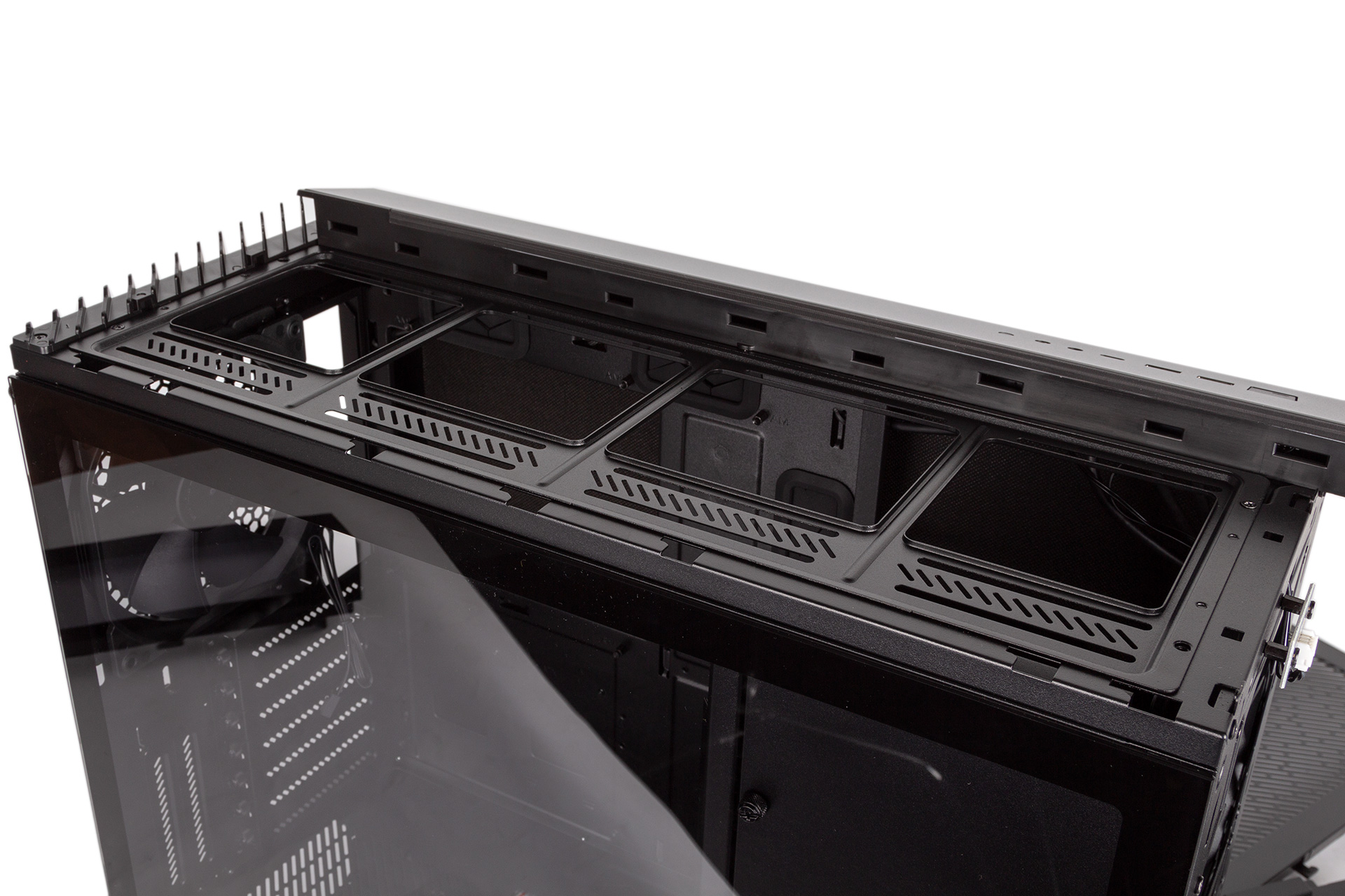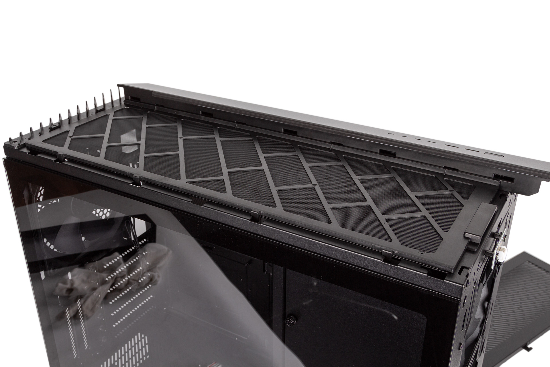 There is ample room to increase the number of fans in the case, with two 140mm/120mm mounts on the floor, up to three in the roof, and a third potential mounting location in the front as well. To maximise the use of the roof for this, you’ll need to swap the tempered glass cover out for a ventilated steel one, a three-part apparatus that includes a fan/radiator bracket, a dust filter, and a top cover. The swap is easy to make, and the structure remains nice and rigid once it’s complete.