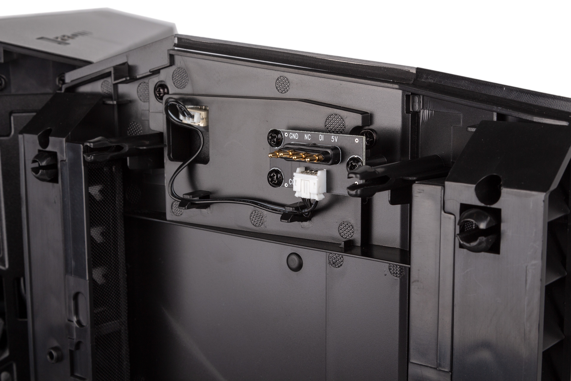 The front panel pulls off easily enough, and its weight is another indicator of the good build quality. It’s necessary to do this in order to swap the roof to the ventilated one, and you also need to do it to access the bottom dust filter, which is full-length and pulls out from the front. There are also removable filters built into the side vents of the front panel, so the Vector RS is fully shielded. Fractal also uses metal contacts instead of cables to connect the front and roof panels, allowing the LED strips to communicate without having wires getting in the way whenever you’re working with the case.